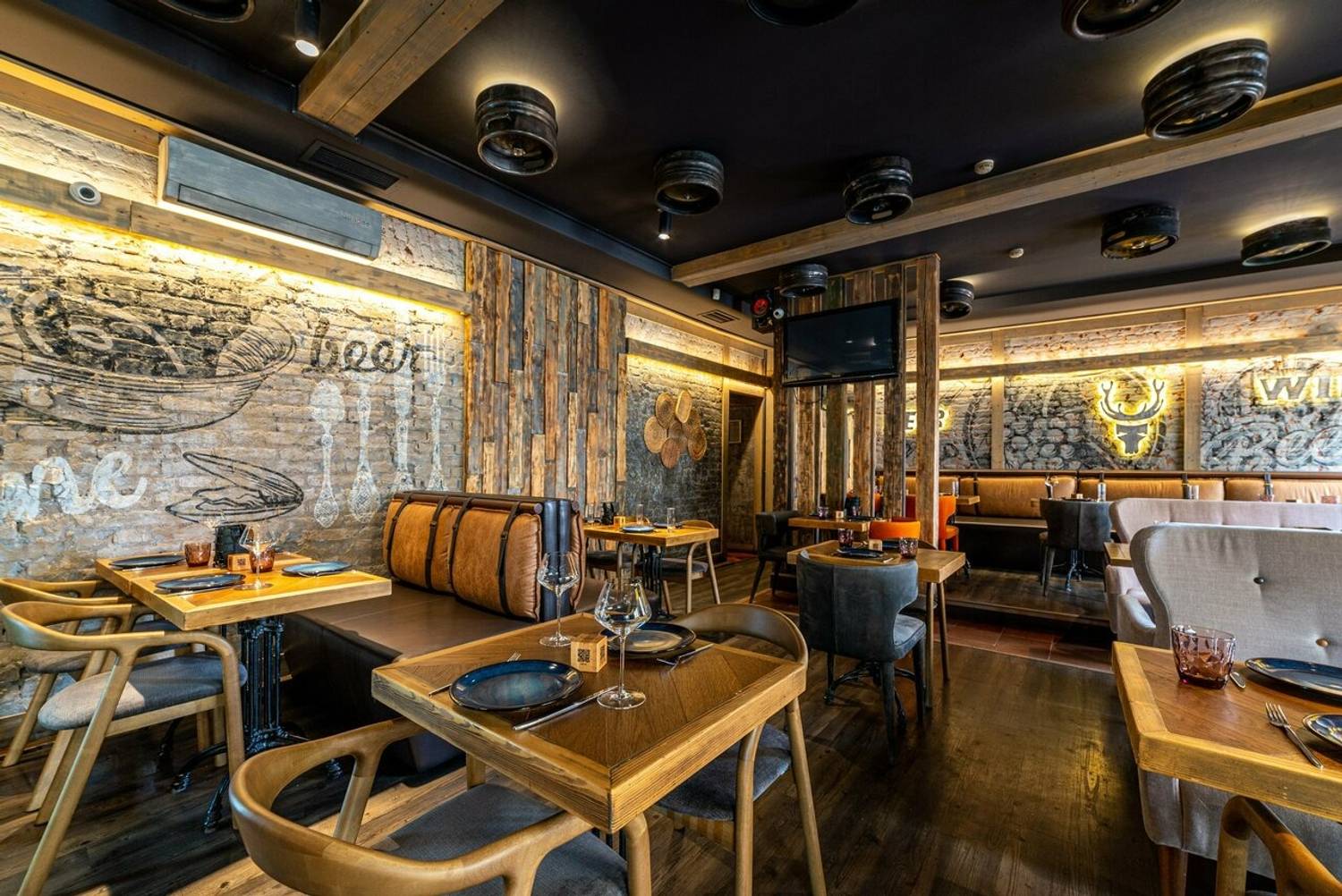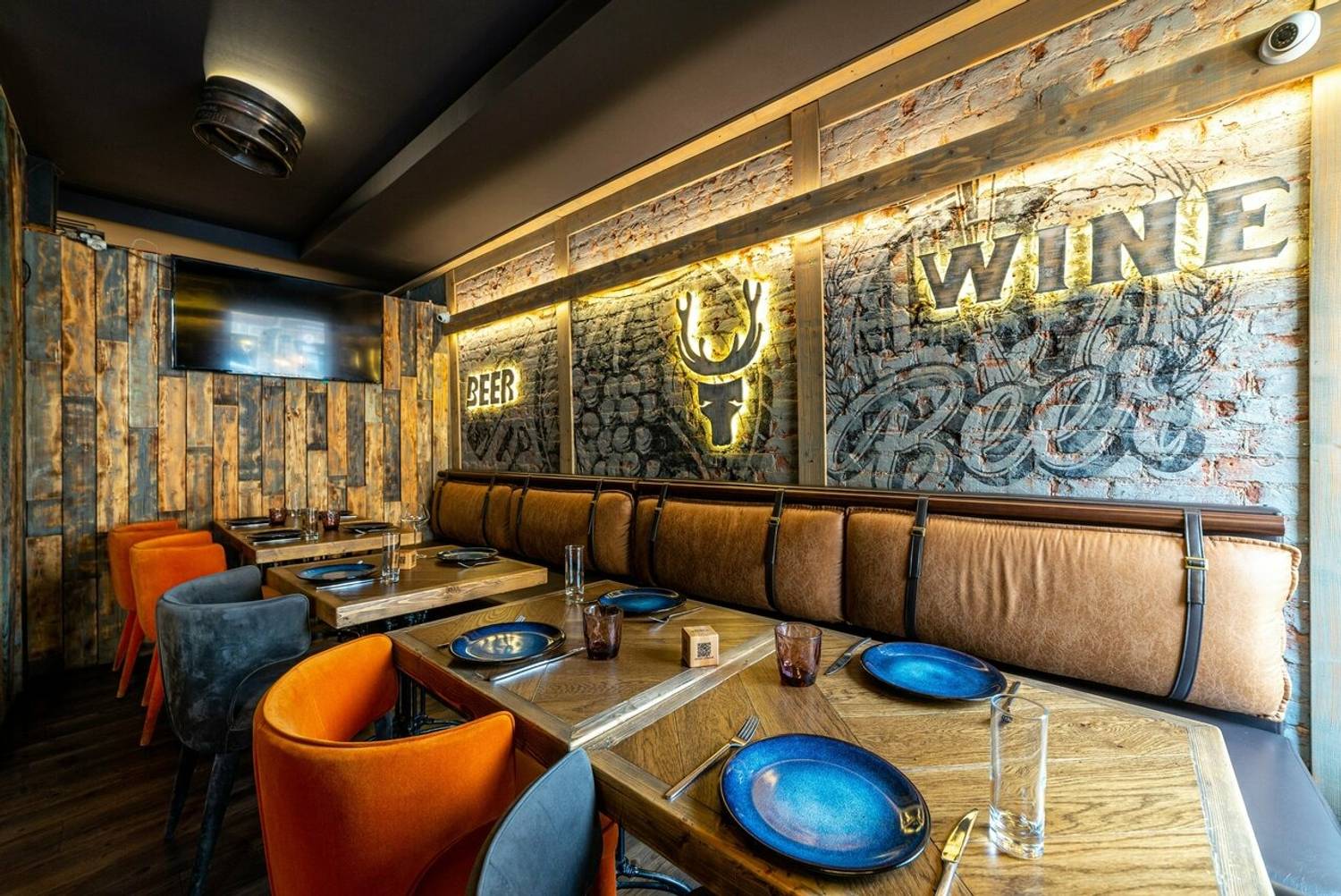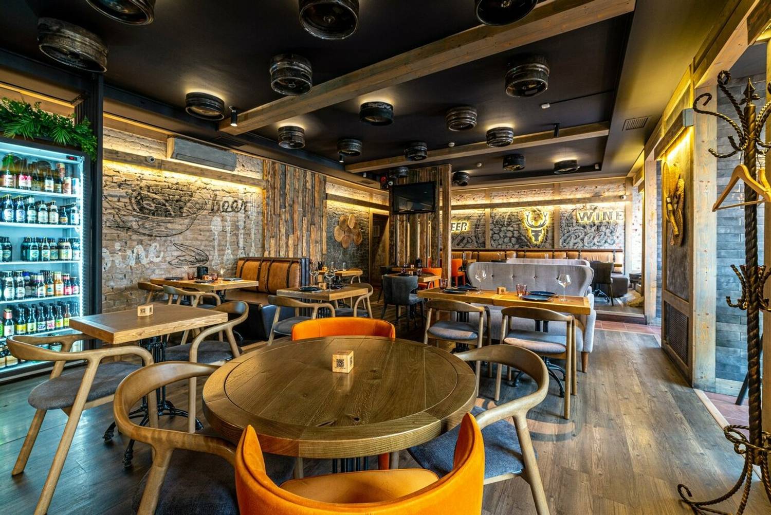 Атмосфера. Это место для неформальных встреч и плотных трапез в атмосфере современного пивного паба. Интерьер создает настроение грубоватого, но комфортного индустриального лофта. Кирпичная кладка и бетонные поверхности сочетаются с яркими оранжевыми диванами, деревянными вставками на стенах с подсветкой и декоративными пивными кегами. Такое смешение фактур и цветов формирует динамичную и расслабленную среду, которая подходит для больших компаний и шумных вечеров в самом центре города.