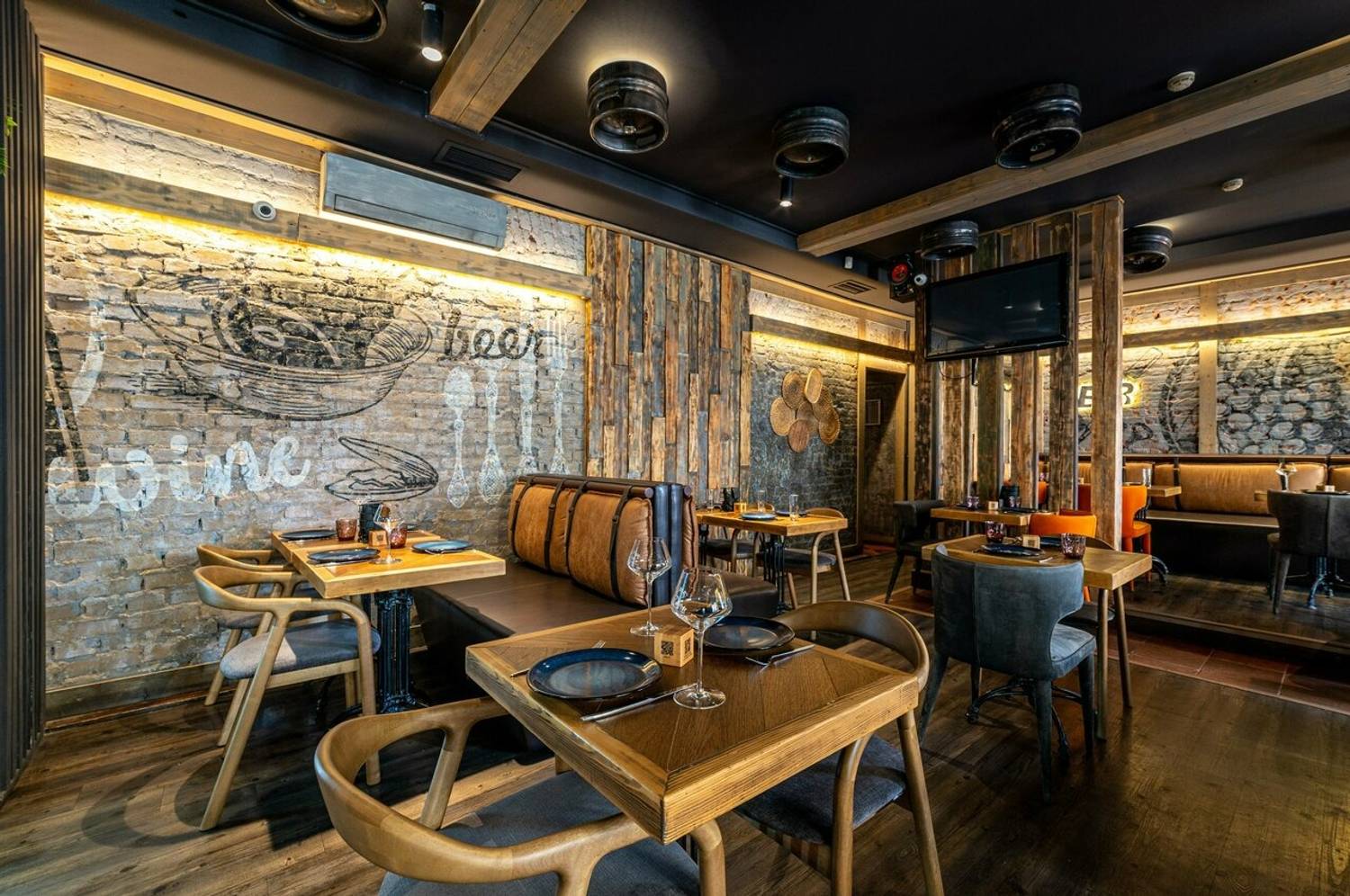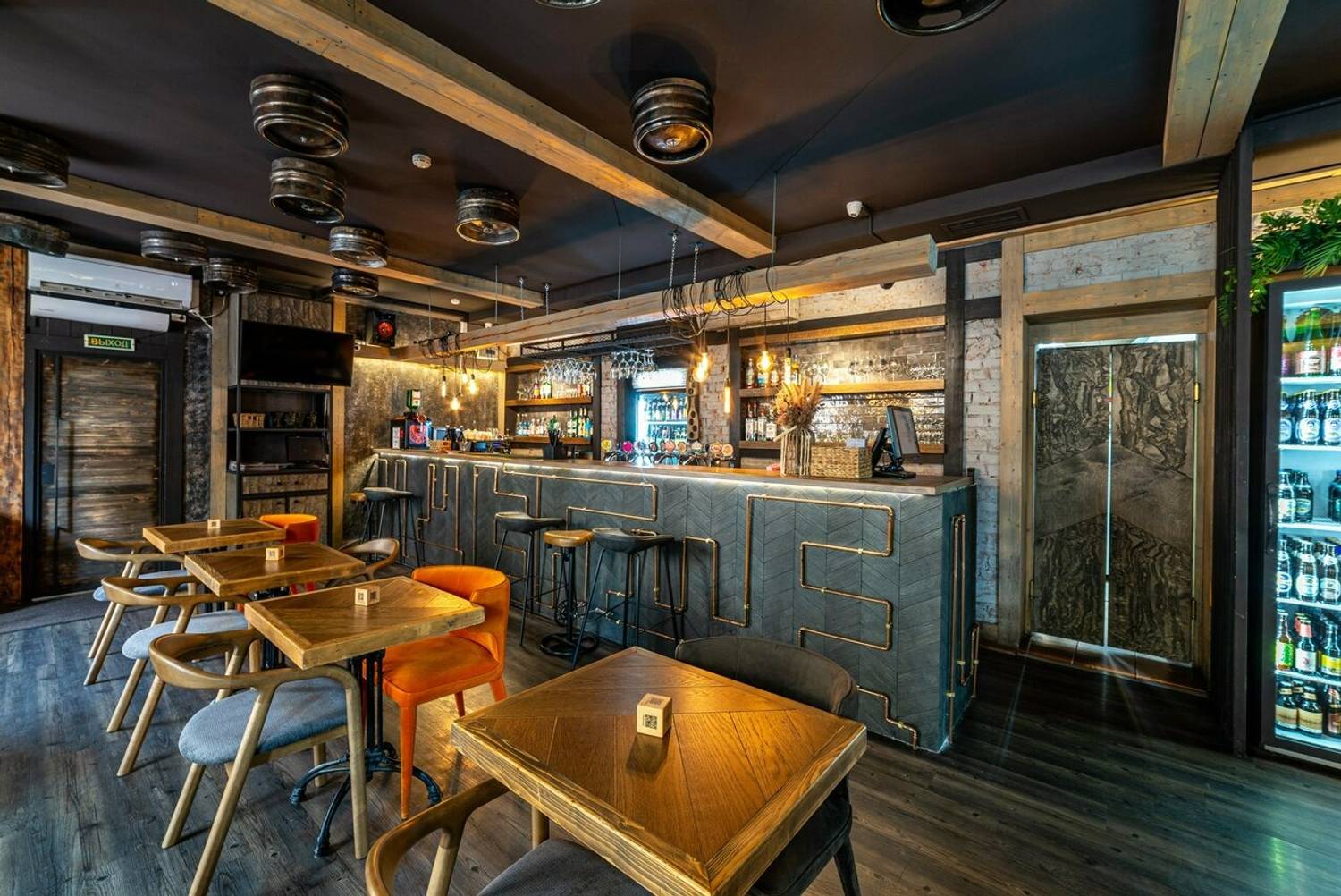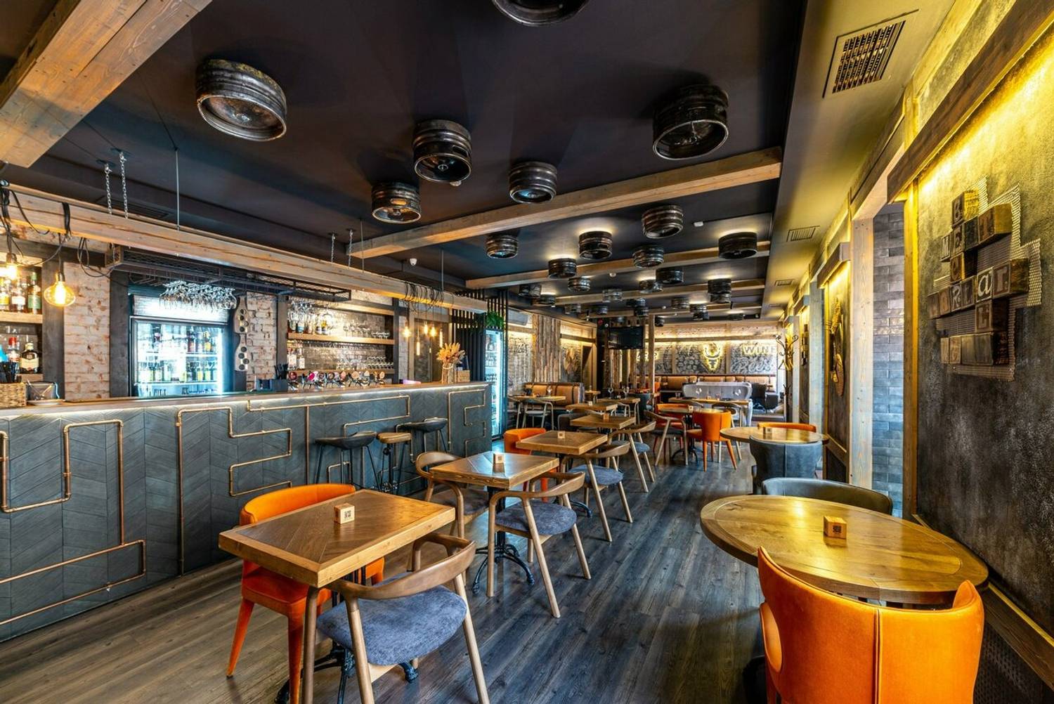 Атмосфера. Это место для неформальных встреч и плотных трапез в атмосфере современного пивного паба. Интерьер создает настроение грубоватого, но комфортного индустриального лофта. Кирпичная кладка и бетонные поверхности сочетаются с яркими оранжевыми диванами, деревянными вставками на стенах с подсветкой и декоративными пивными кегами. Такое смешение фактур и цветов формирует динамичную и расслабленную среду, которая подходит для больших компаний и шумных вечеров в самом центре города.