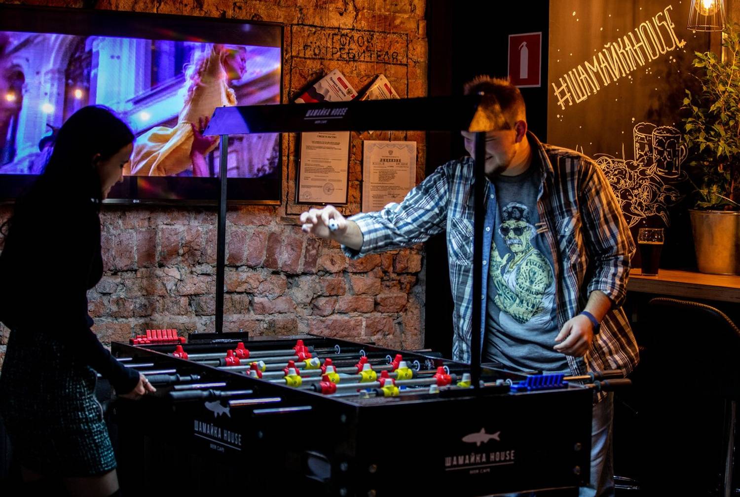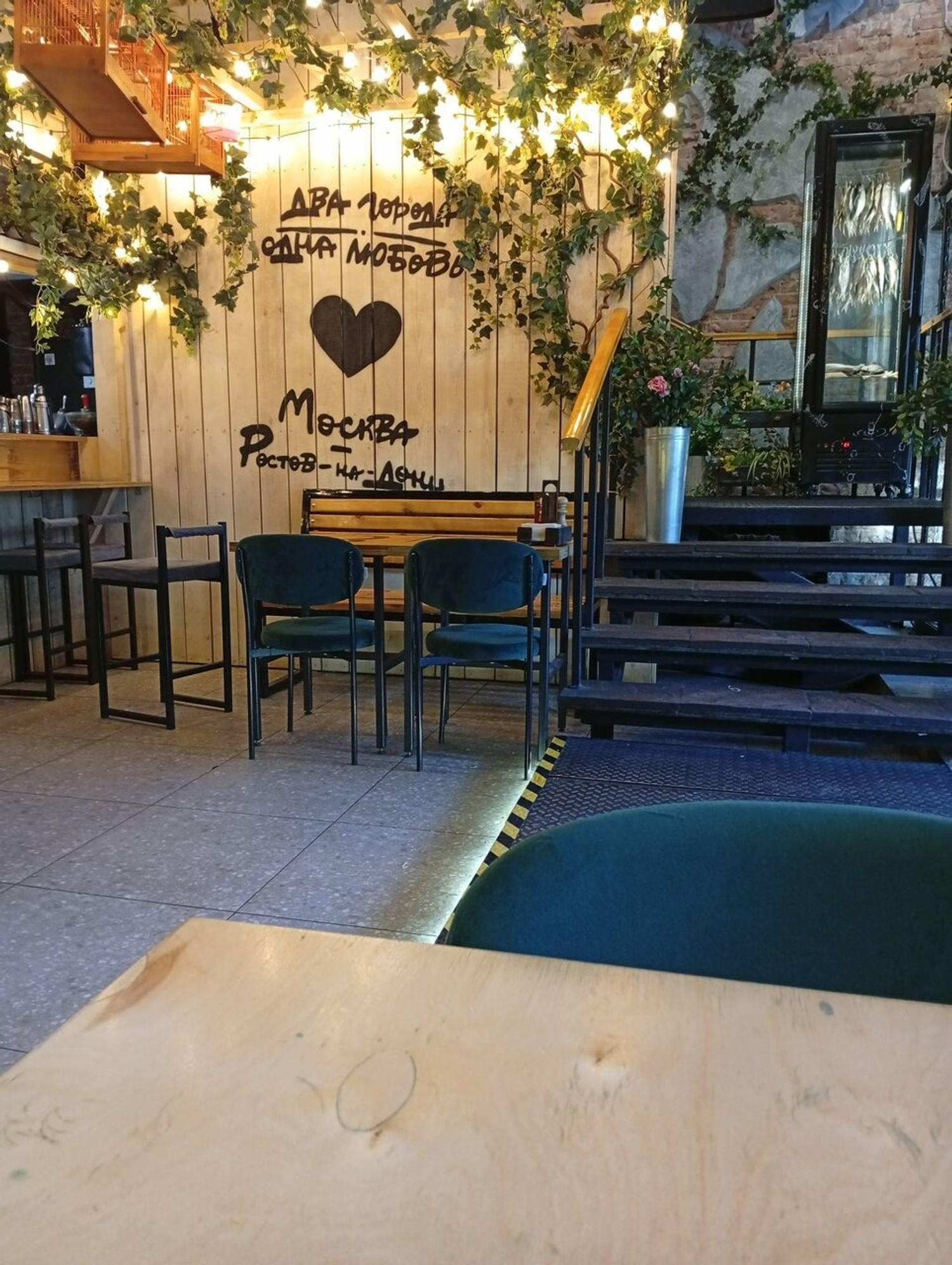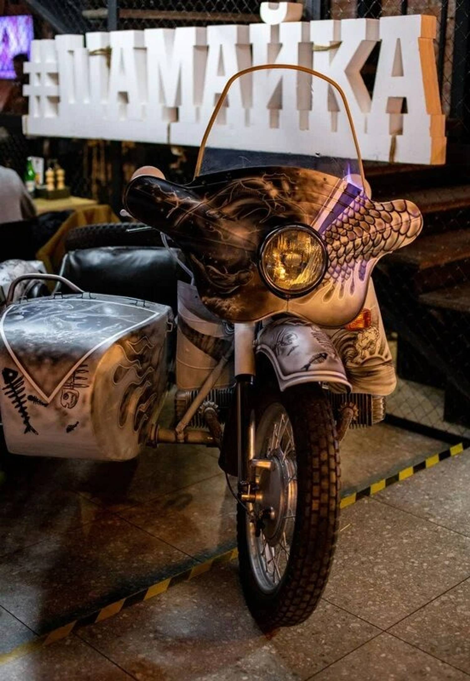Атмосфера. Интерьер воссоздает антураж городского двора с характерной брутальностью: кирпичные стены, металлическая сетка, настольный футбол и культовый мотоцикл с коляской в качестве центрального элемента декора. Такое оформление формирует динамичную и непринужденную обстановку, располагающую к дружеским встречам и шумным вечерам в самом центре города.