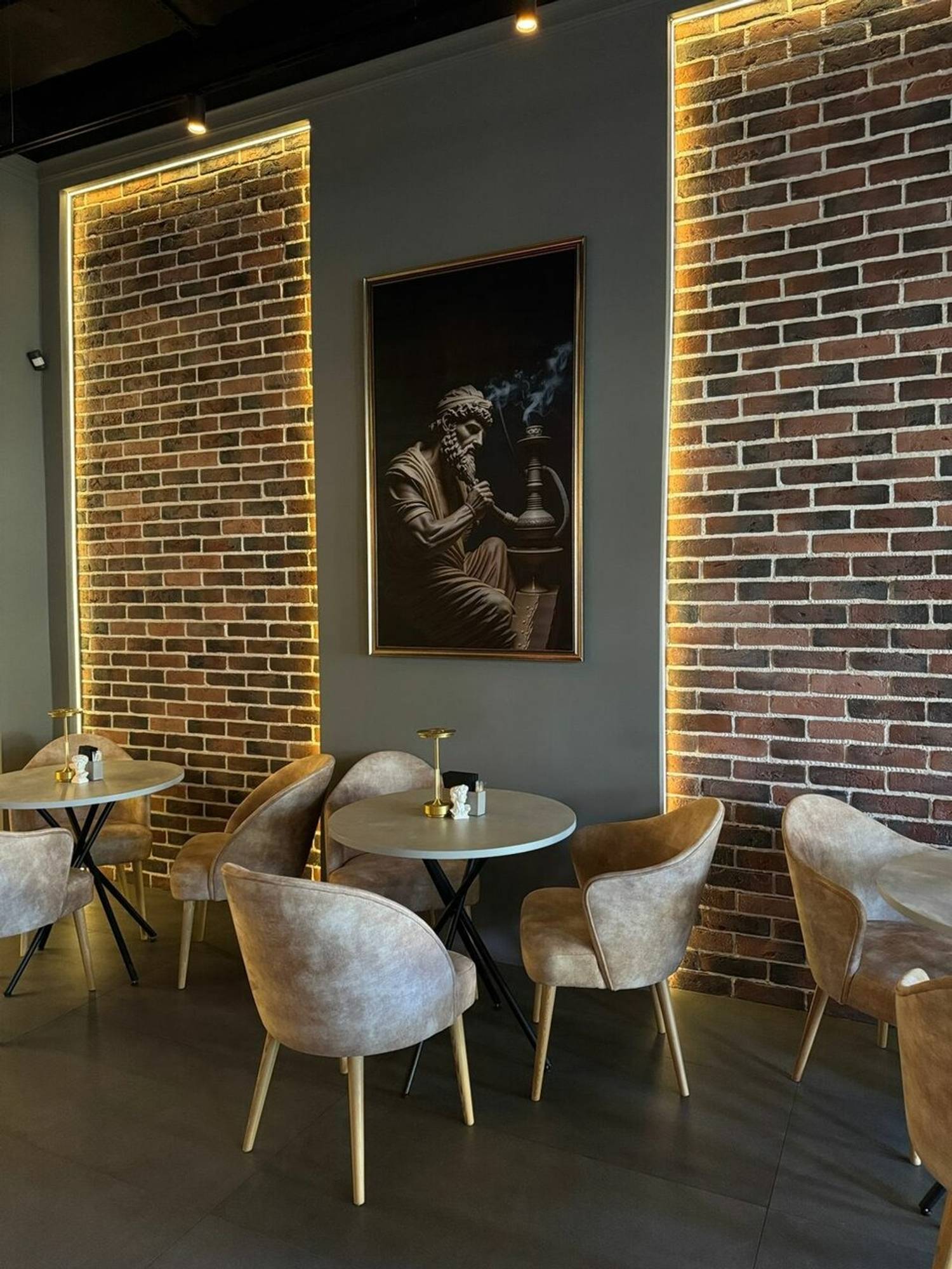 Атмосфера. Интерьер создает эффект погружения в стилизованное антично-футуристическое пространство. Стены украшены каллиграфическими росписями, неоновыми надписями и декоративными вставками с имитацией огня и лавы, а также фигурами Давида. Сверкающие шарообразные люстры, синие диваны, проектор и телевизоры с игровыми приставками формируют многослойную и динамичную среду. Такая обстановка подходит как для неспешного отдыха в небольшой компании, так и для просмотра спортивных трансляций или игровых вечеров.