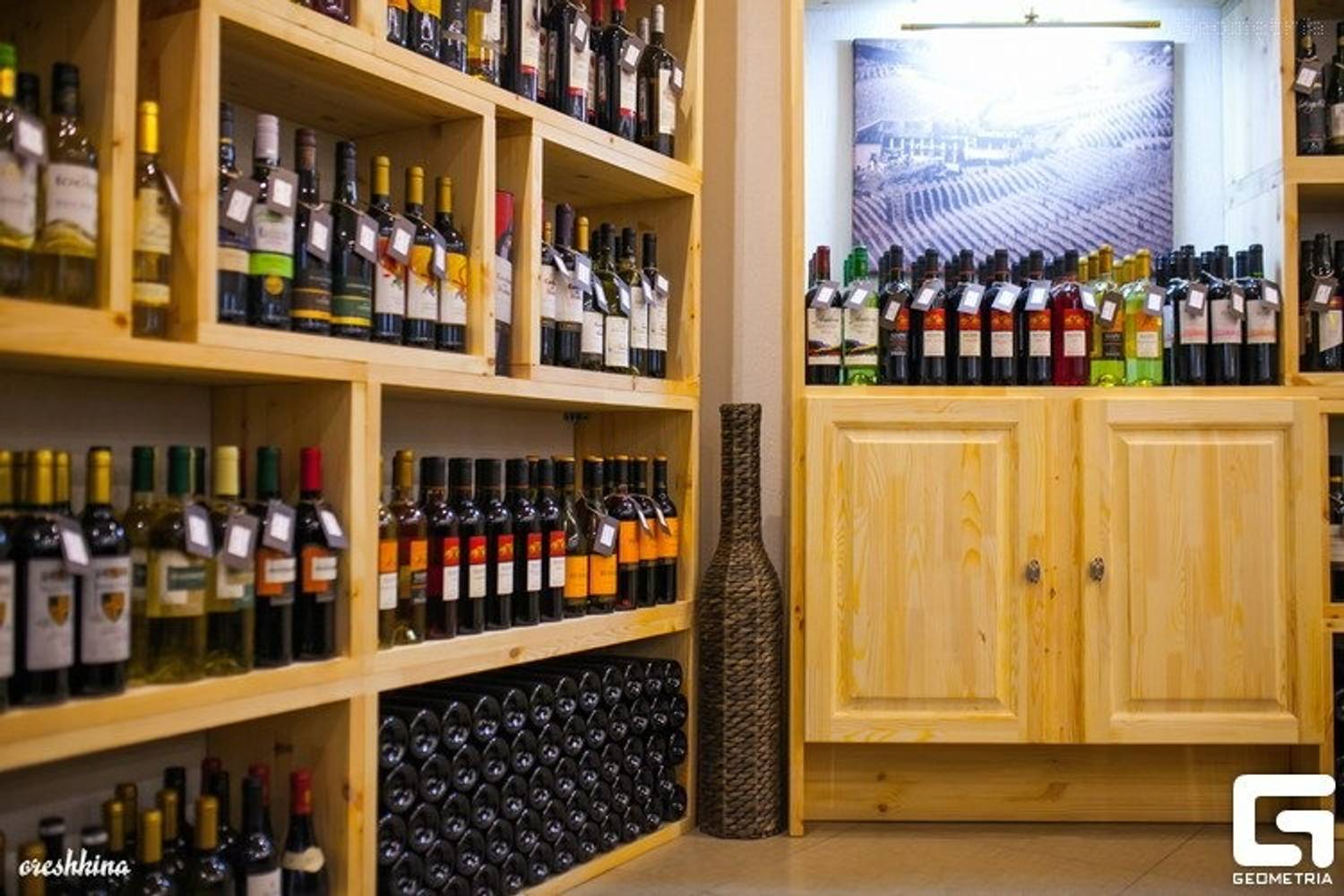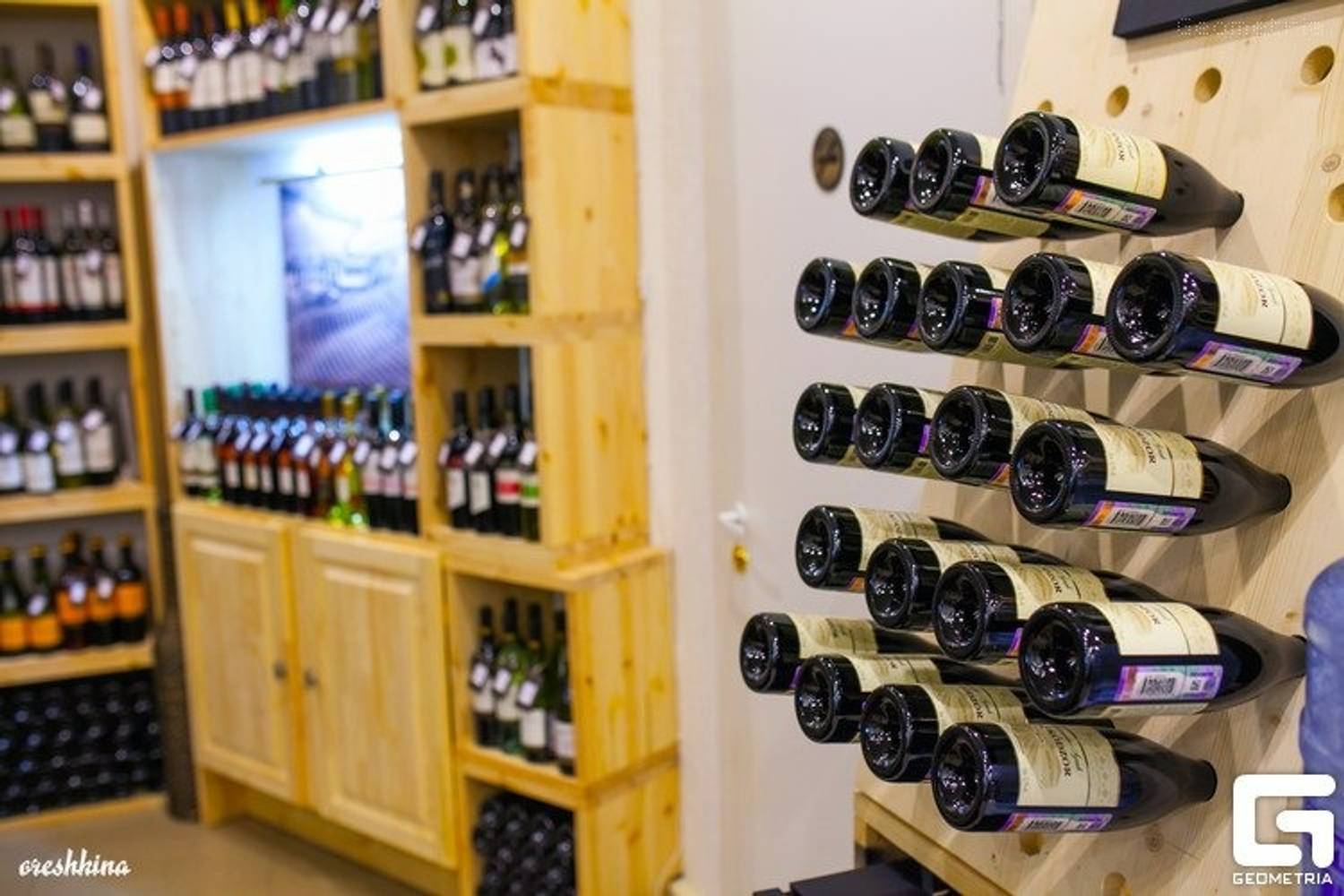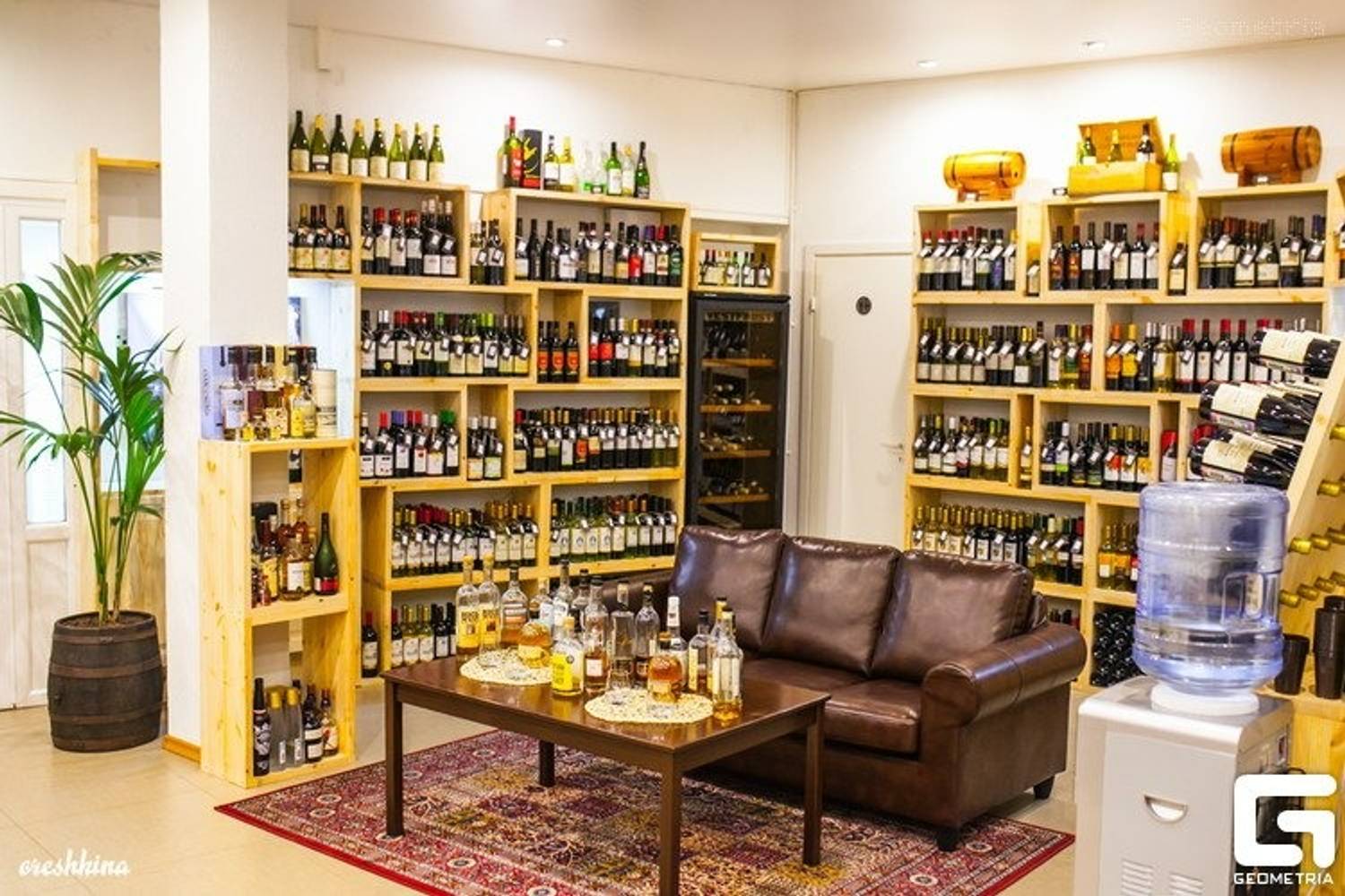 Атмосфера. Интерьер напоминает приватный винный клуб с элементами винтажной эстетики. Деревянные стеллажи, где бутылки выставлены как экспонаты или эффектно «воткнуты» в ячейки, создают ощущение живой коллекции. Кожаный коричневый диван, красный ковер с орнаментами и живое дерево, растущее в бочке, добавляют уюта и индивидуальности. Такая обстановка настраивает на неспешный разговор и сосредоточенное восприятие вкусов, располагая к тому, чтобы остаться надолго.