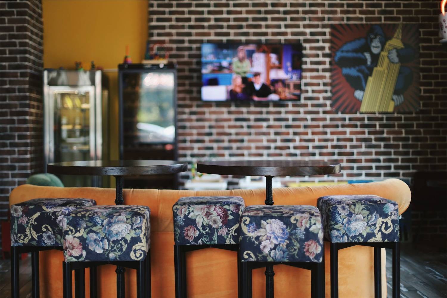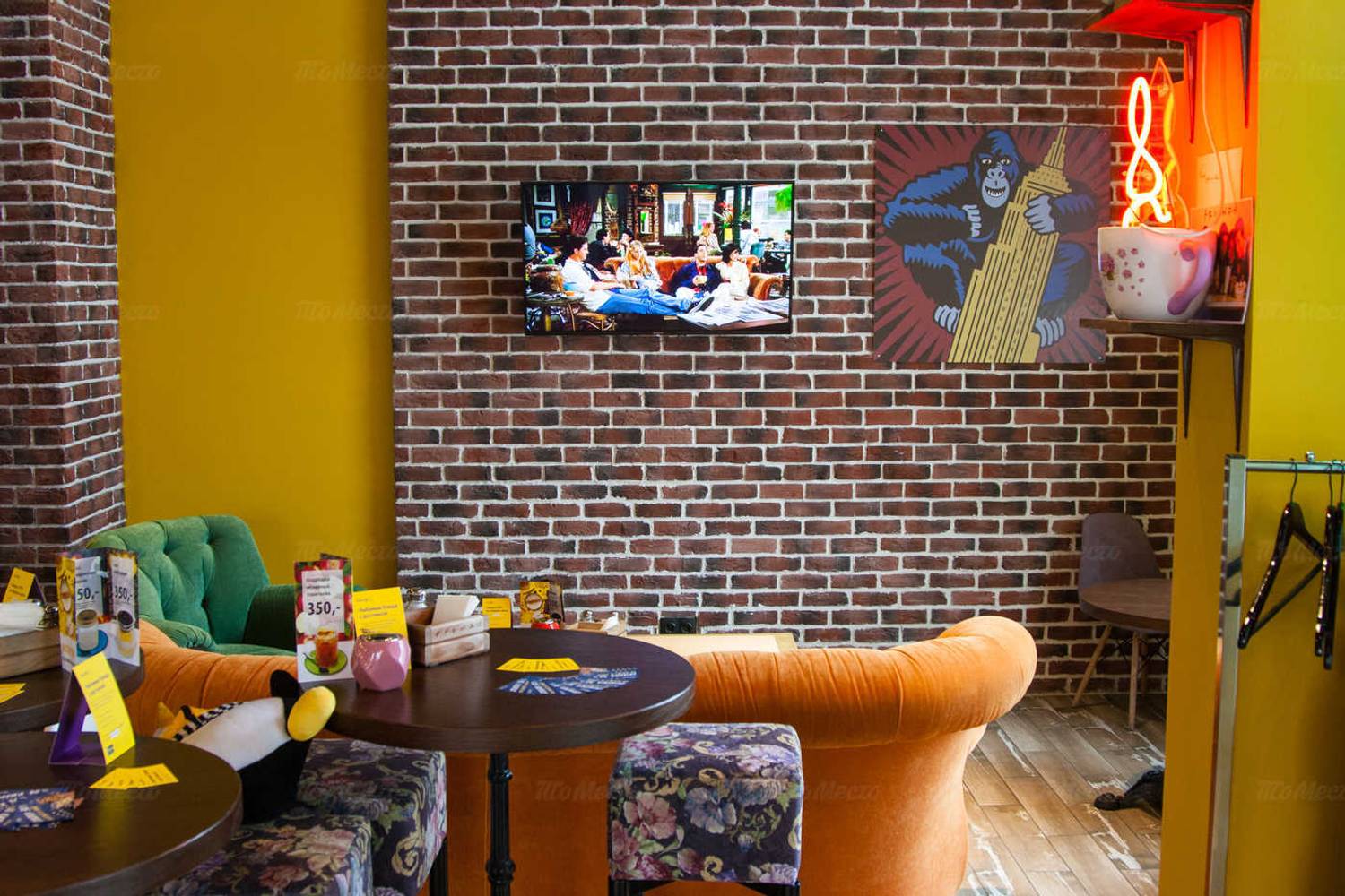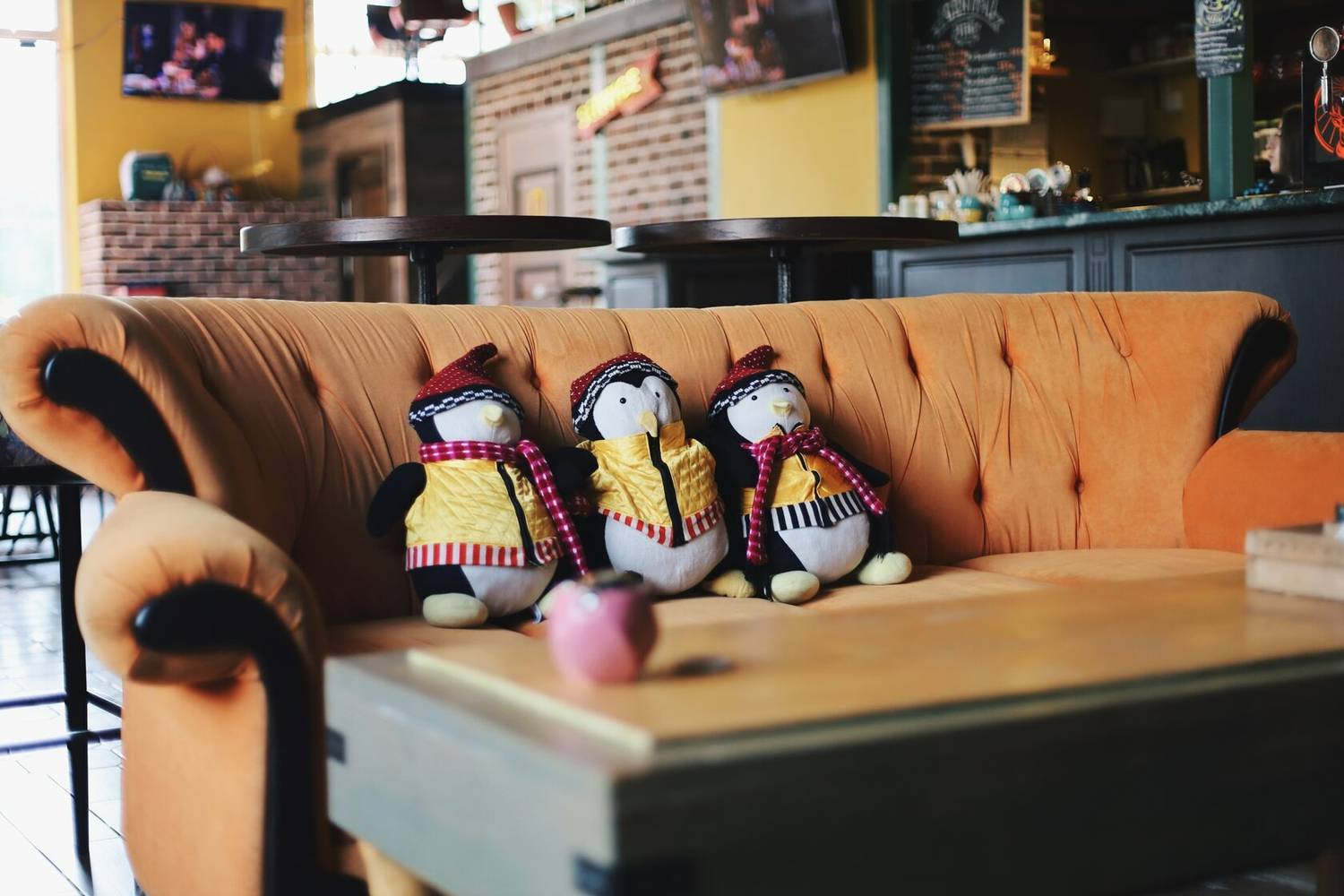 Атмосфера. Интерьер с узнаваемым оранжевым диваном, кирпичной кладкой и деталями, знакомыми каждому фанату шоу: картонные фигуры героев, статуя собаки. пингвины. Здесь можно почувствовать себя частью компании Росс и Рейчел, главное — сесть за столиком с видом на зал в стиле из ключевых сцен сериала.
