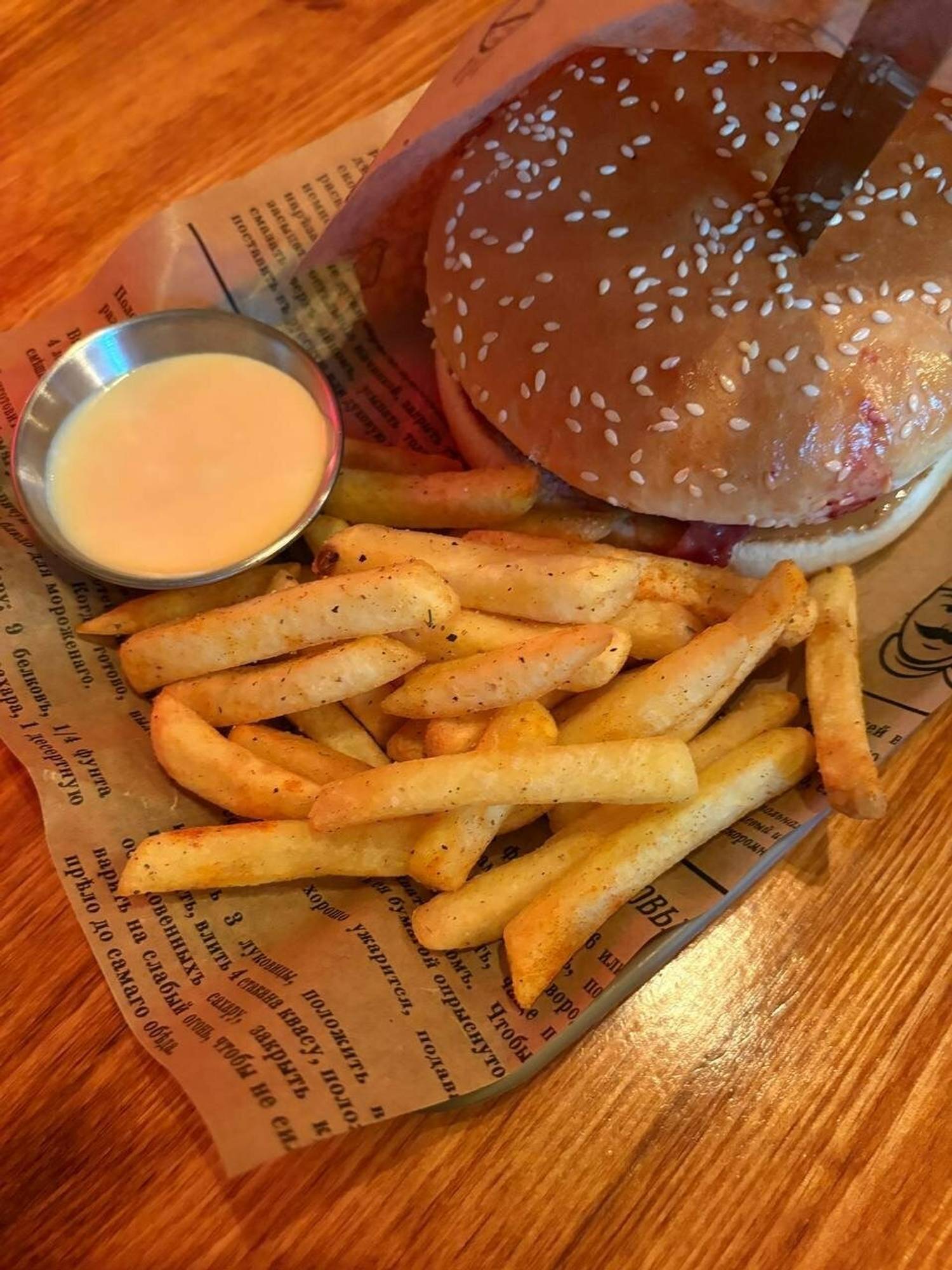 Еда и напитки. В меню много мяса. TEPPANYAKI — это гриль, на котором его готовят. Здесь готовят свиные ребра в корочке в маринаде из имбиря, а также барбекю и чили, строганов в стиле cheese steak. Особенно аппетитно звучит фирменный бургер с говяжьей котлетой и соусом из черной смородины, хрустящим беконом и арахисовой пастой. В бургере «дикий хвост» томленый в специях бычий хвост в пикантном соусе барбекю. Из горячих закусок тут мидии в сливочно-сырном соусе и с соусом дор блю. На гриле также готовят креветки, кальмар, кусочки камбалы. В барной карте собрали разливное пиво, сидр, лимонады, чай и кофе.