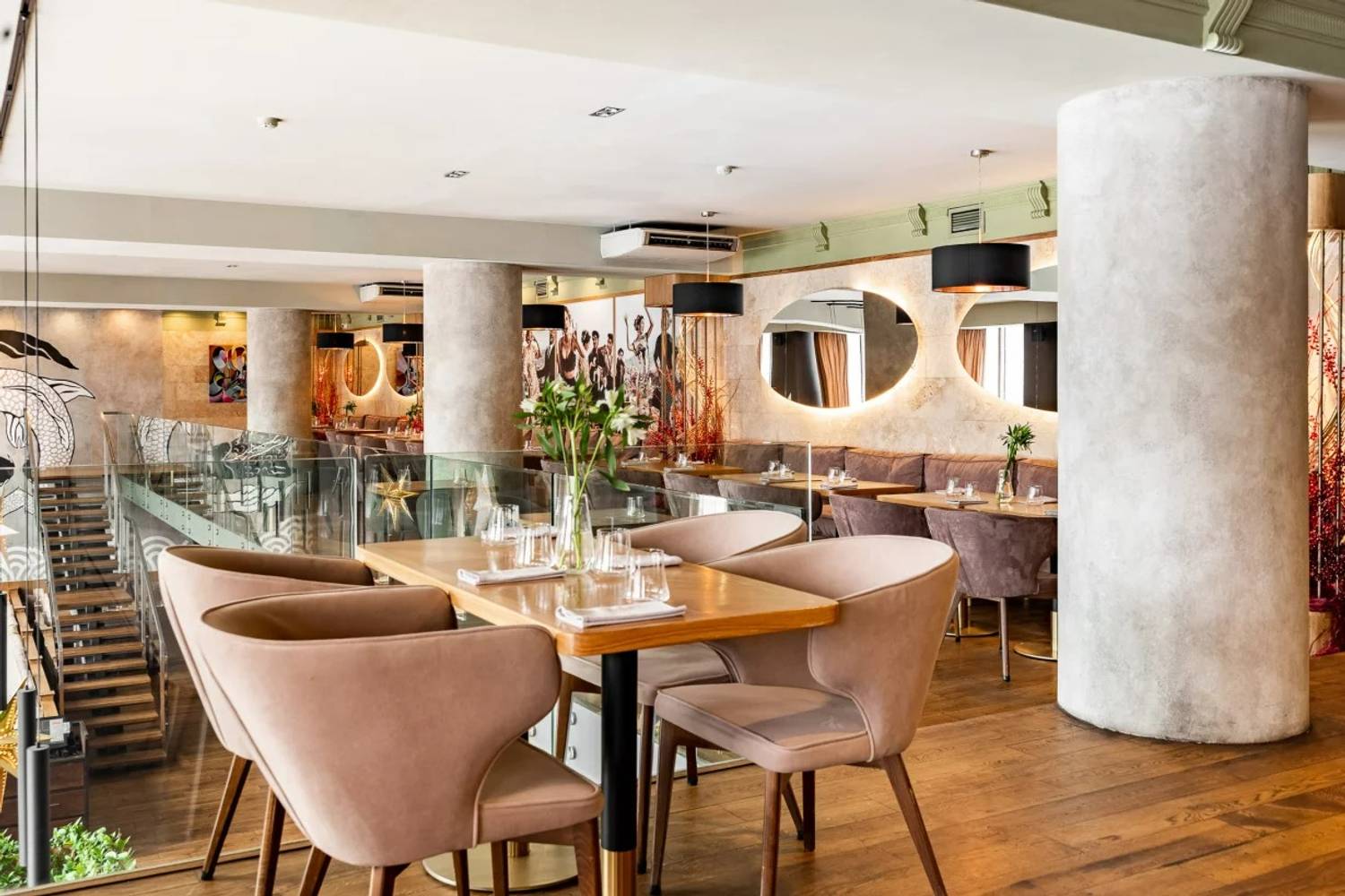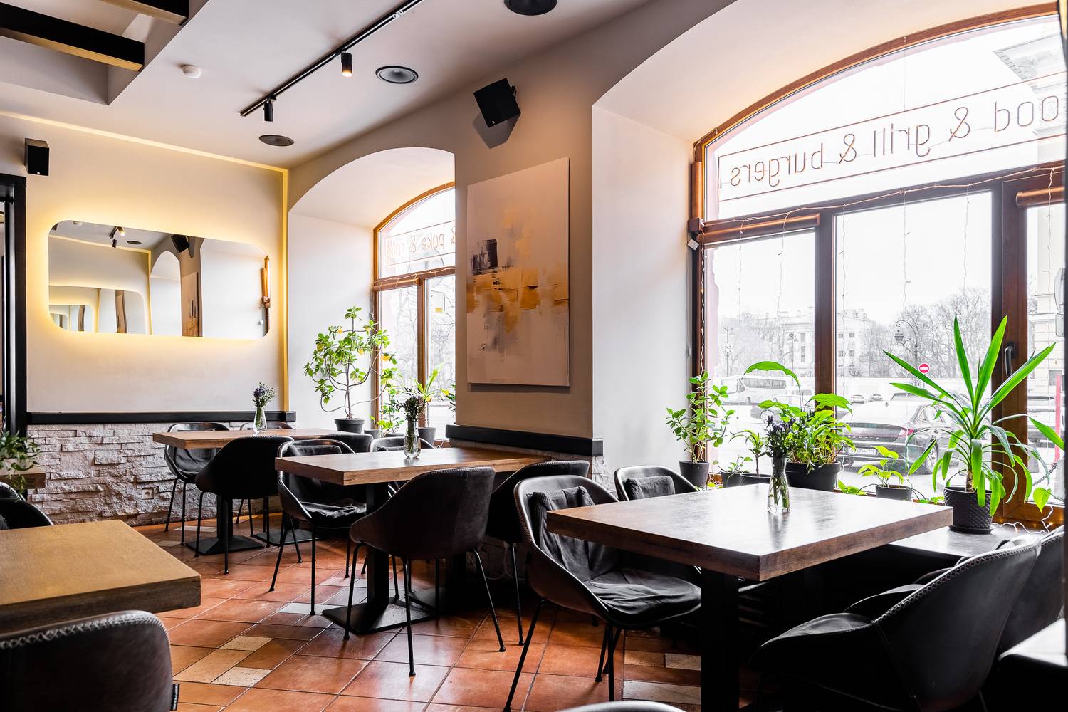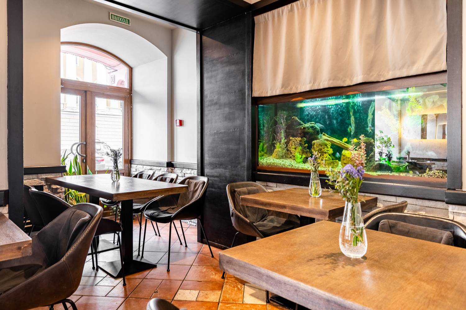 Атмосфера. Пространство разделено на два просторных зала с панорамными окнами, мягкими диванами и множеством живых растений в кадках. Главный визуальный акцент — две большие рыбы на стене, черная и белая, застывшие в вечном танце инь-янь. Стеклянная лестница, бело-серые матовые столбы, зеркала с подсветкой и деревянные панели создают спокойную, почти медитативную среду. Интерьер помогает гостям расслабиться и погрузиться в атмосферу, где главное — еда и разговор.