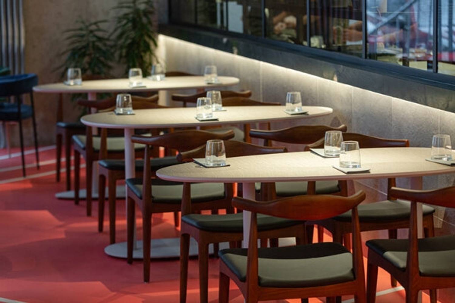 Атмосфера. Интерьер выполнен в сдержанной городской эстетике, с красными тонами и минимумом декора. Большие окна наполняют зал светом, создавая нейтральный фон и не отвлекая от еды или общения. Здесь нет ничего лишнего — только удобная мебель, простор и спокойная обстановка, располагающая к неспешному приему пищи в любое время дня.