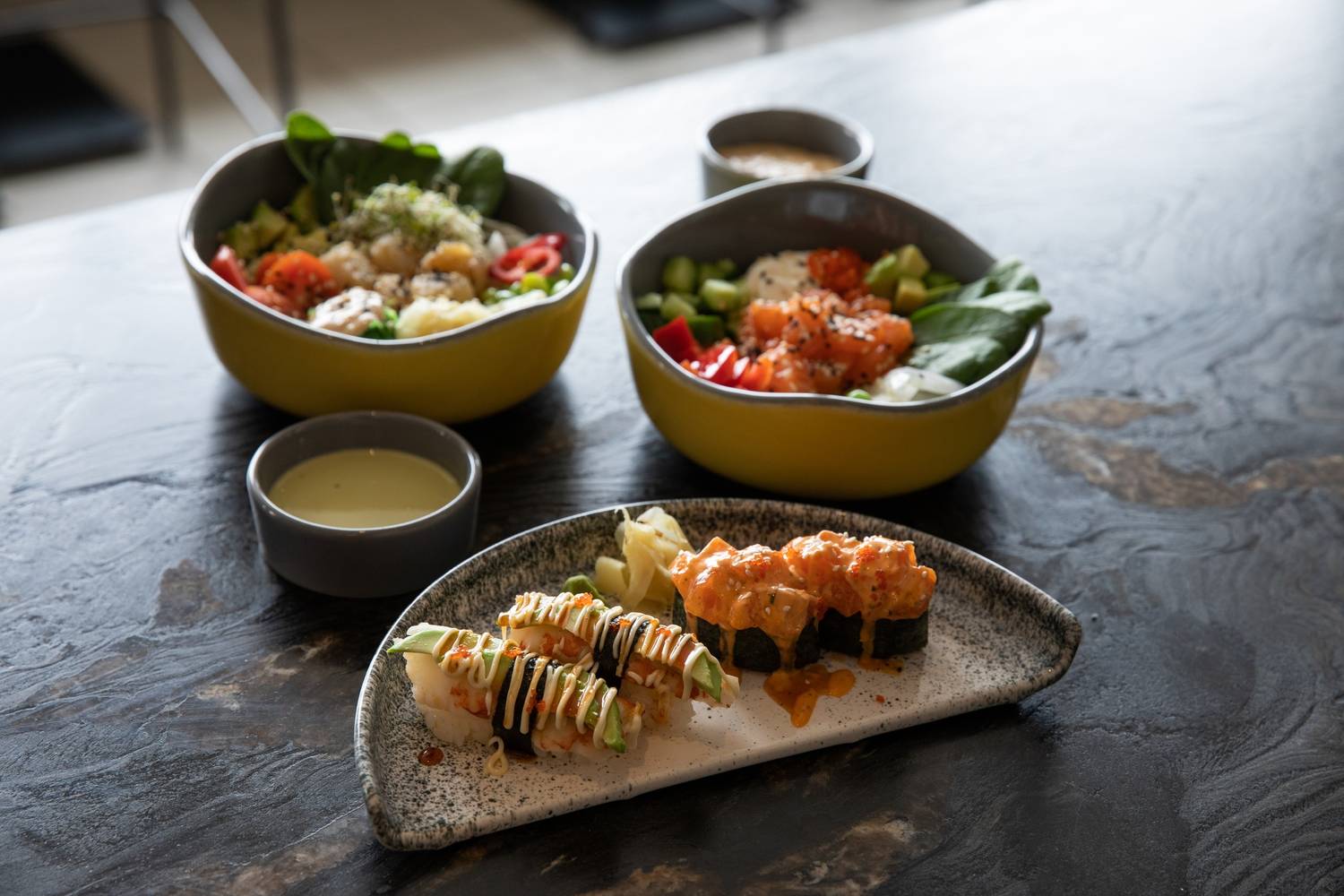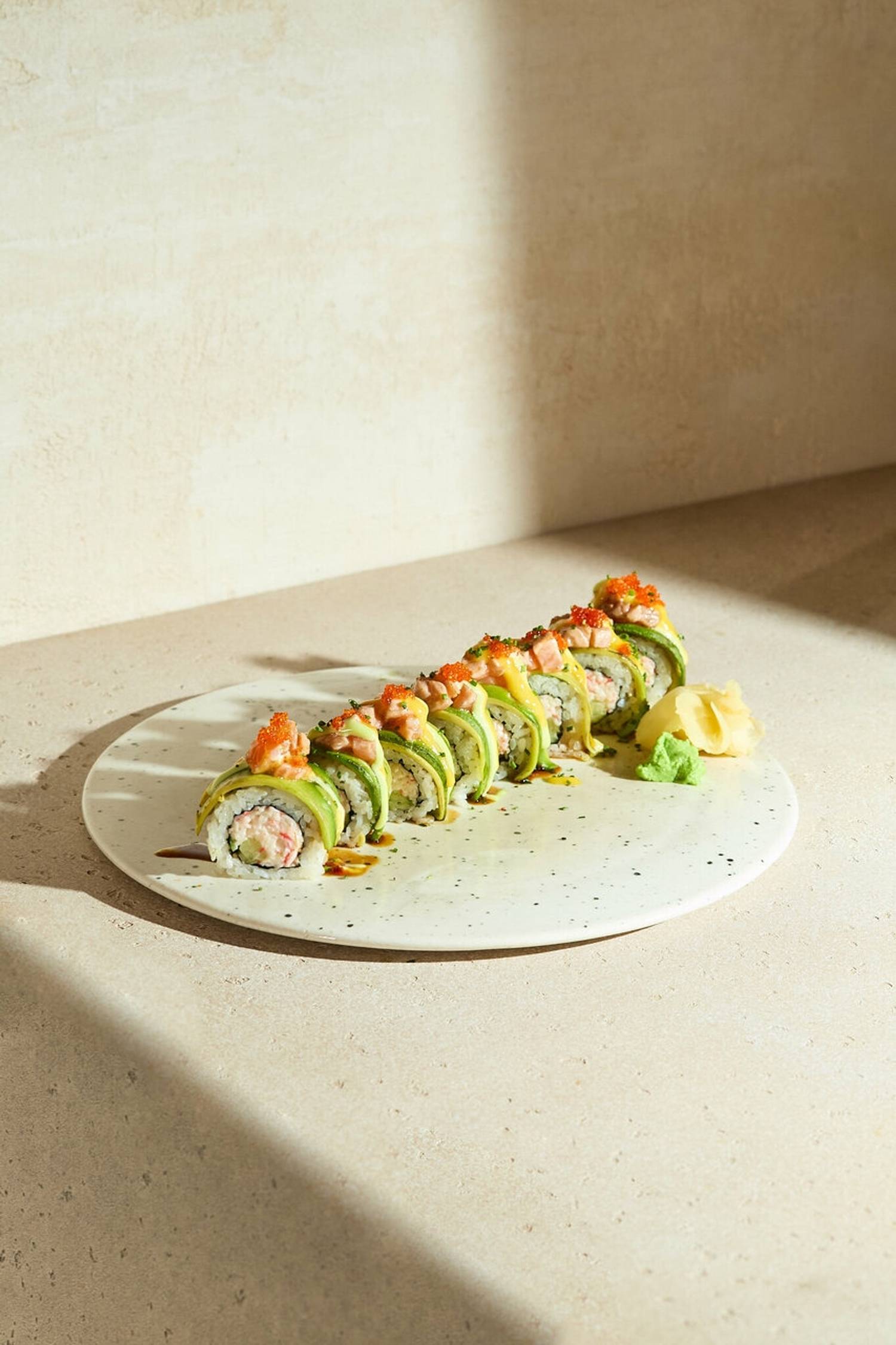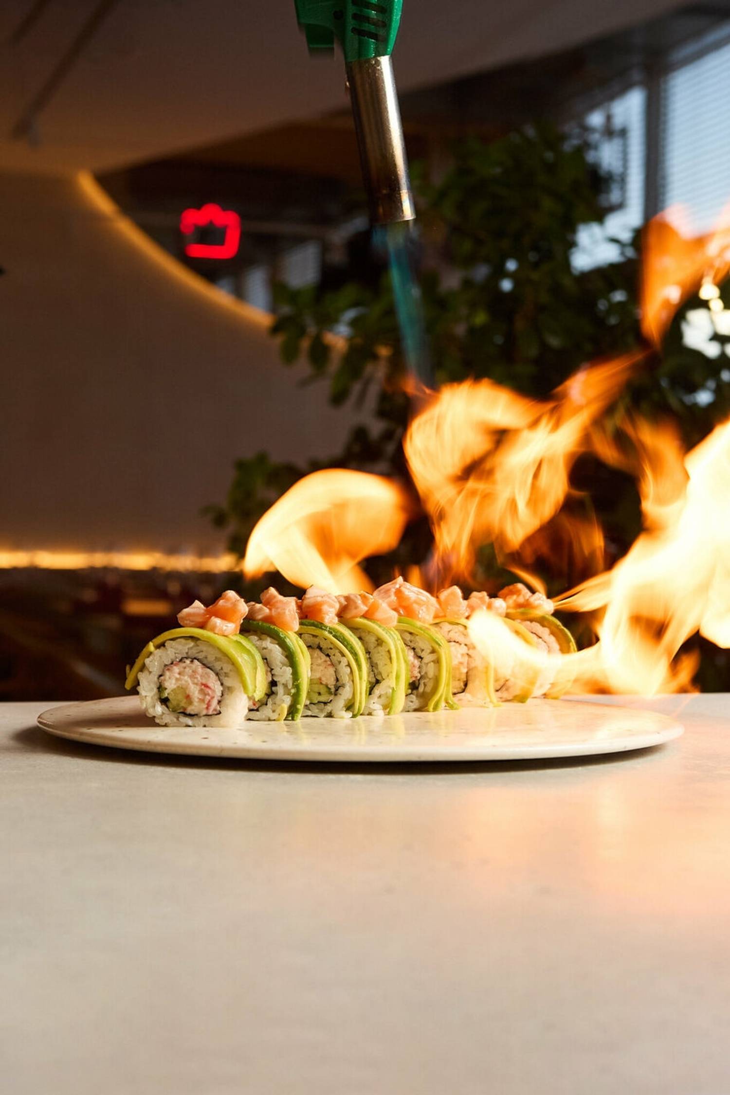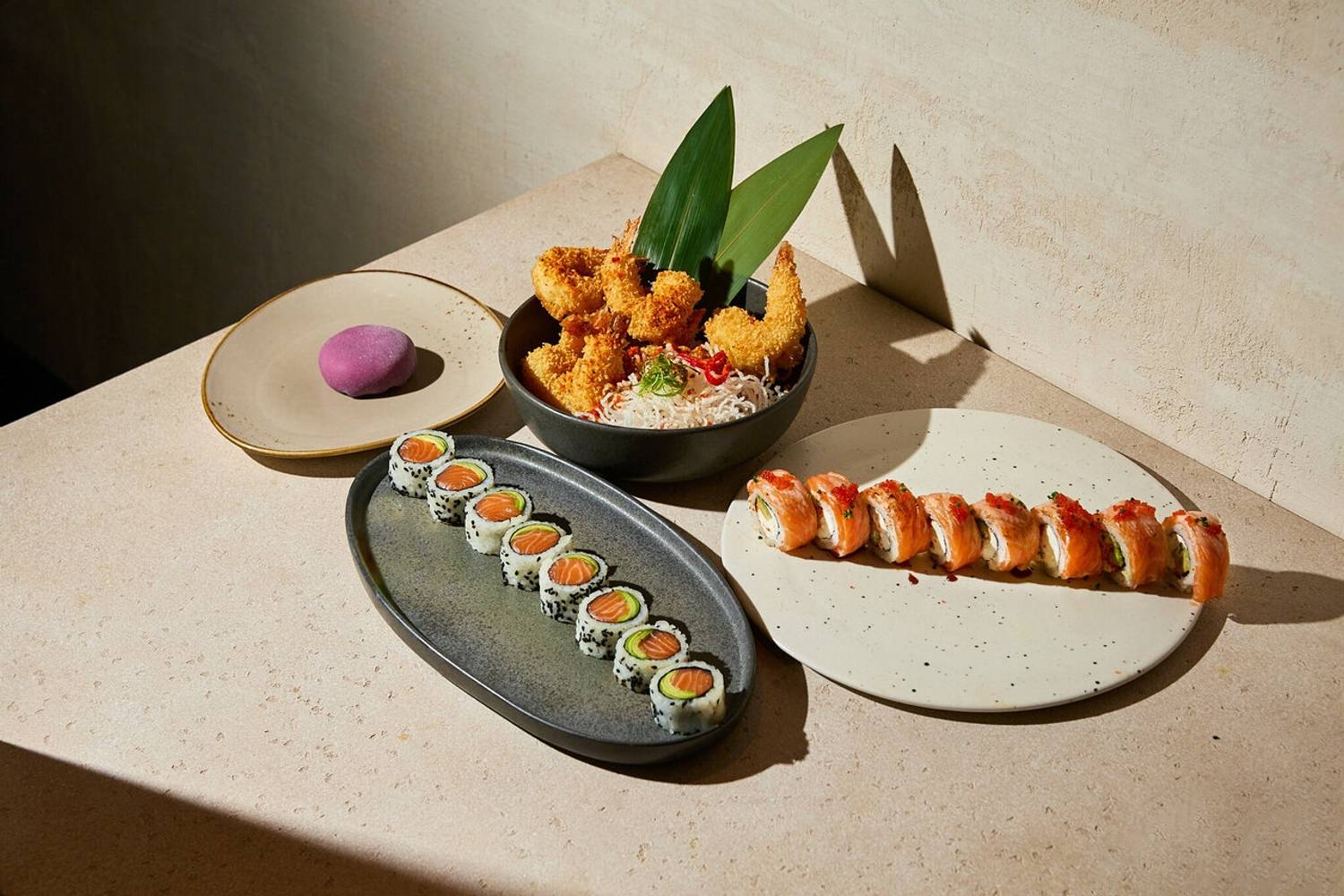 Еда и напитки. Меню объединяет классику и фьюжн. Здесь можно заказать более 60 вариантов роллов, включая запеченные и авторские, а также суши с морепродуктами — от креветок до гребешков. Из закусок представлены мидии и креветки темпура, на горячее — вок, рамен и супы вроде том-яма или фо бо. Также в меню есть поке и боулы с рыбой и овощами. На десерт подают роллы с манго и фруктовые боулы. Барная карта включает европейские вина, бельгийское и японское пиво.