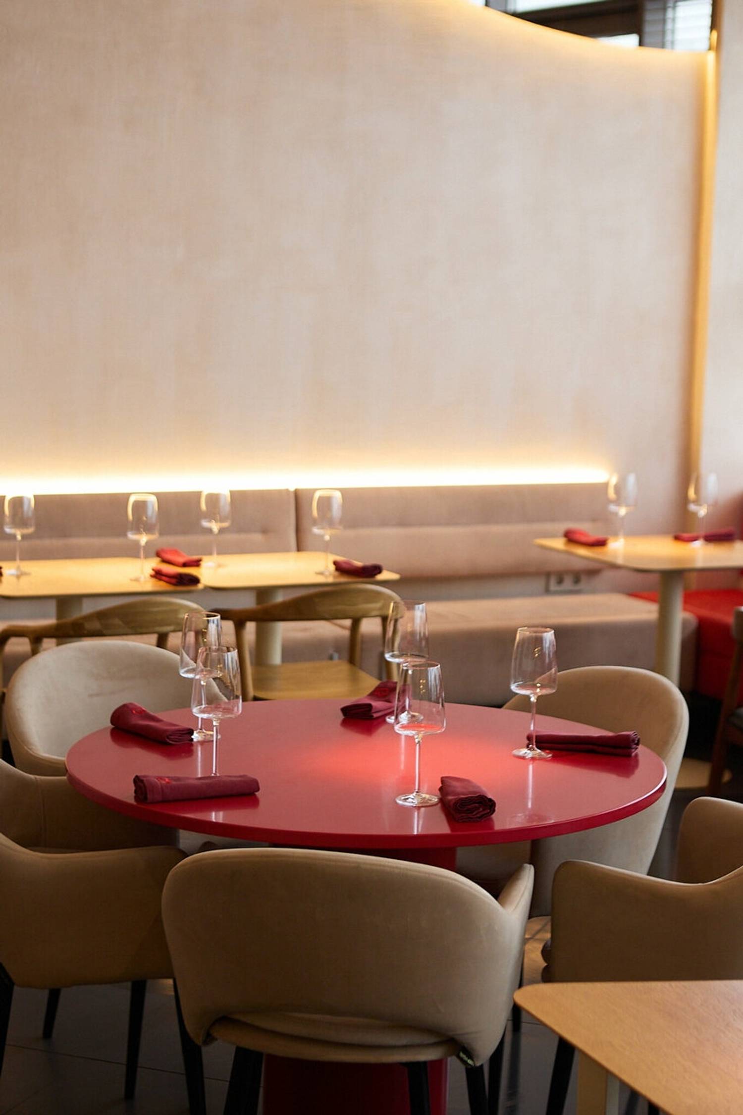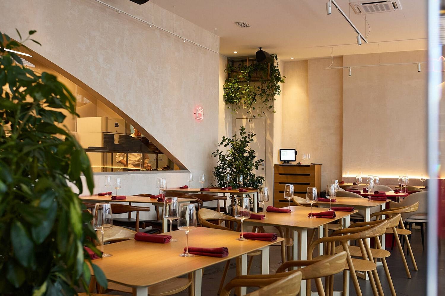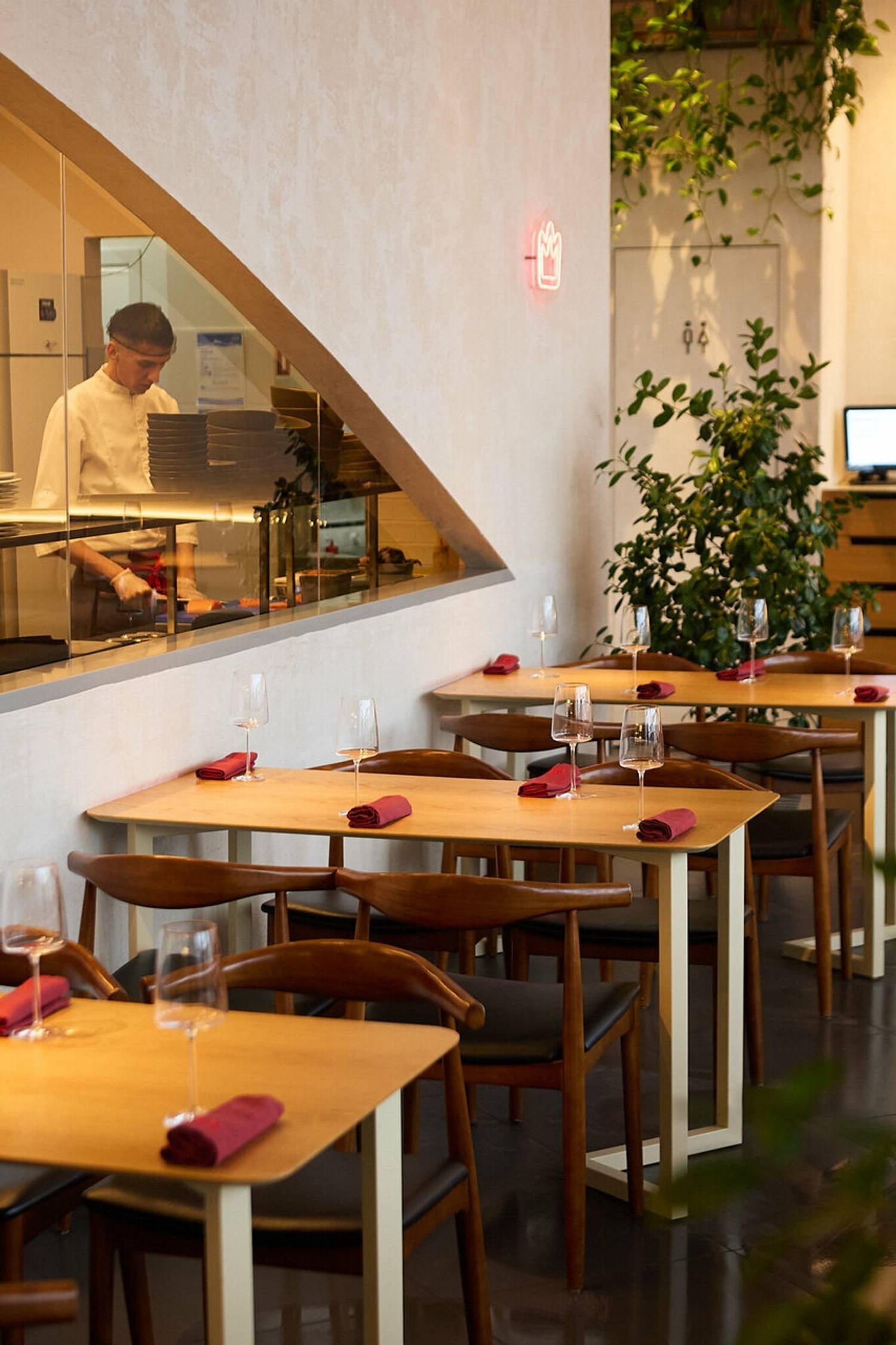 Атмосфера. Просторный и светлый зал с панорамными окнами и минималистичной мебелью из натурального светлого дерева создает ощущение спокойствия и порядка. Здесь много естественного света, выдержанный в бежево-бордовых цветах интерьер и лаконичная мебель: все это позволяет сосредоточиться на еде и общении. Это место подходит для неспешного обеда или ужина в расслабленной обстановке вдали от городской суеты.