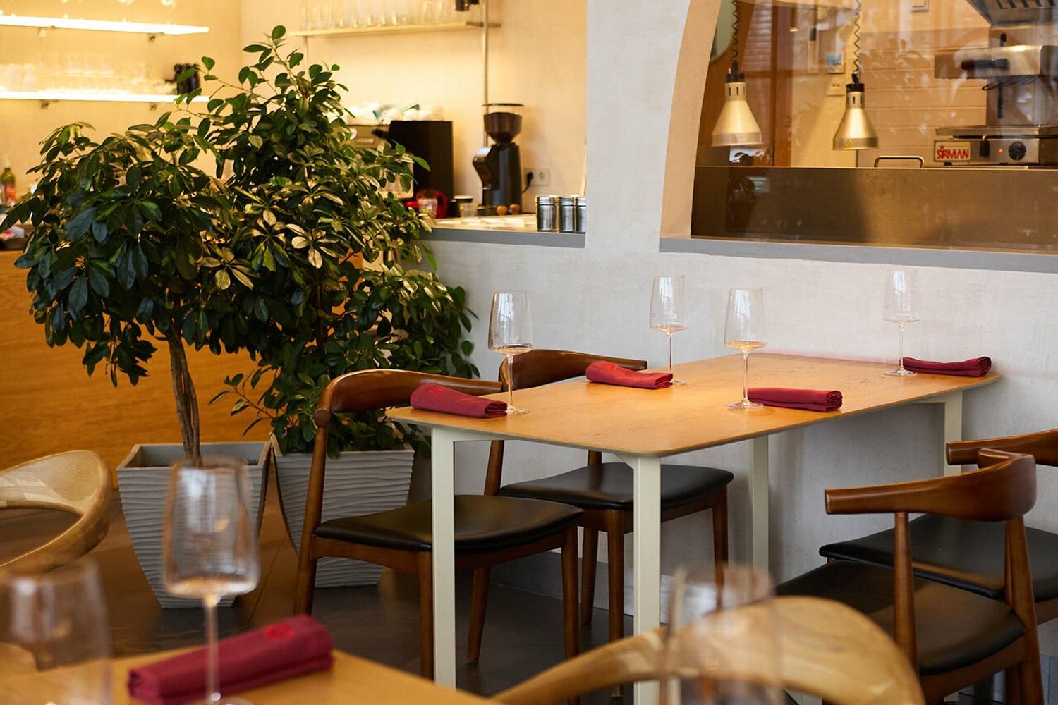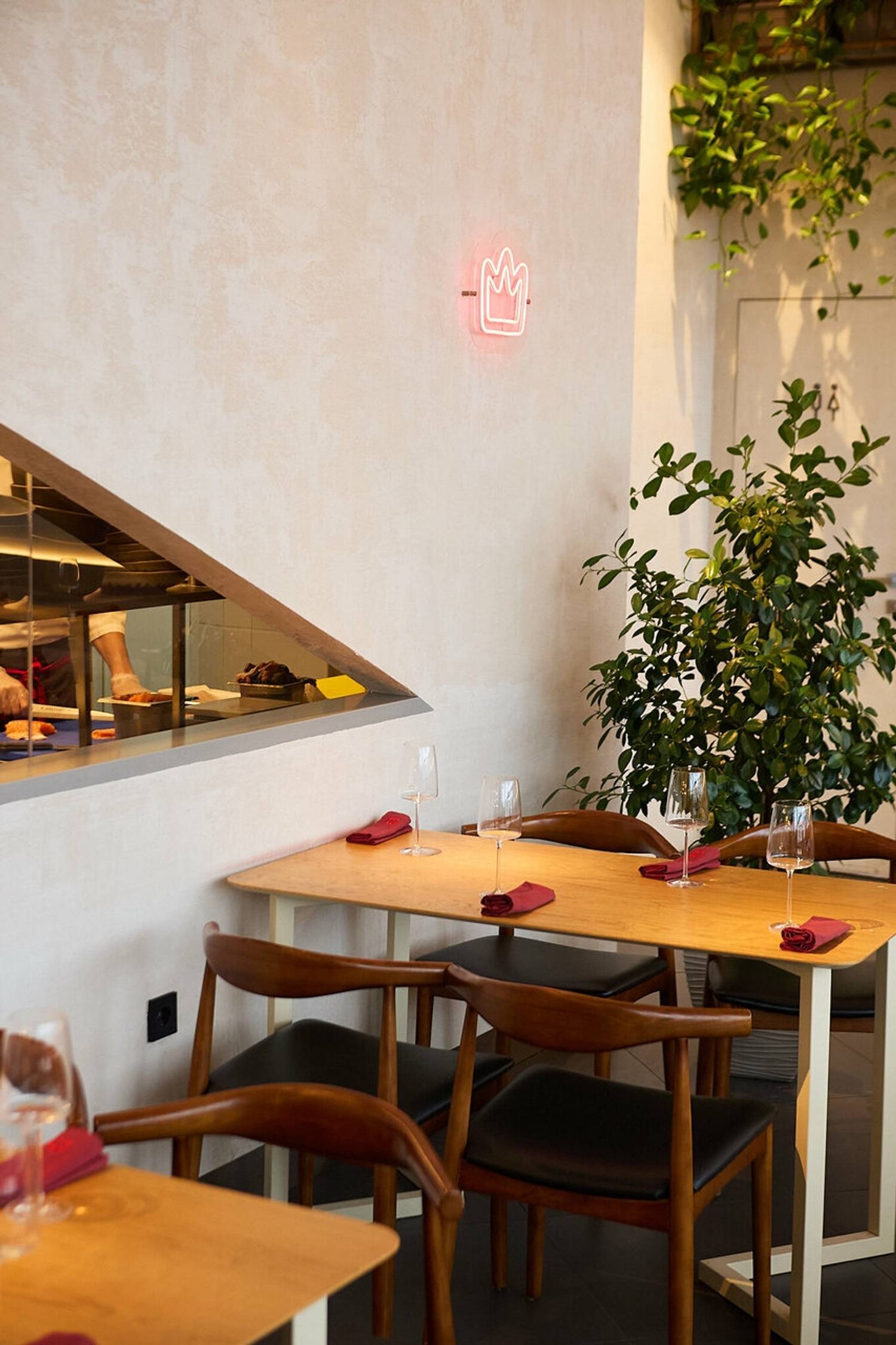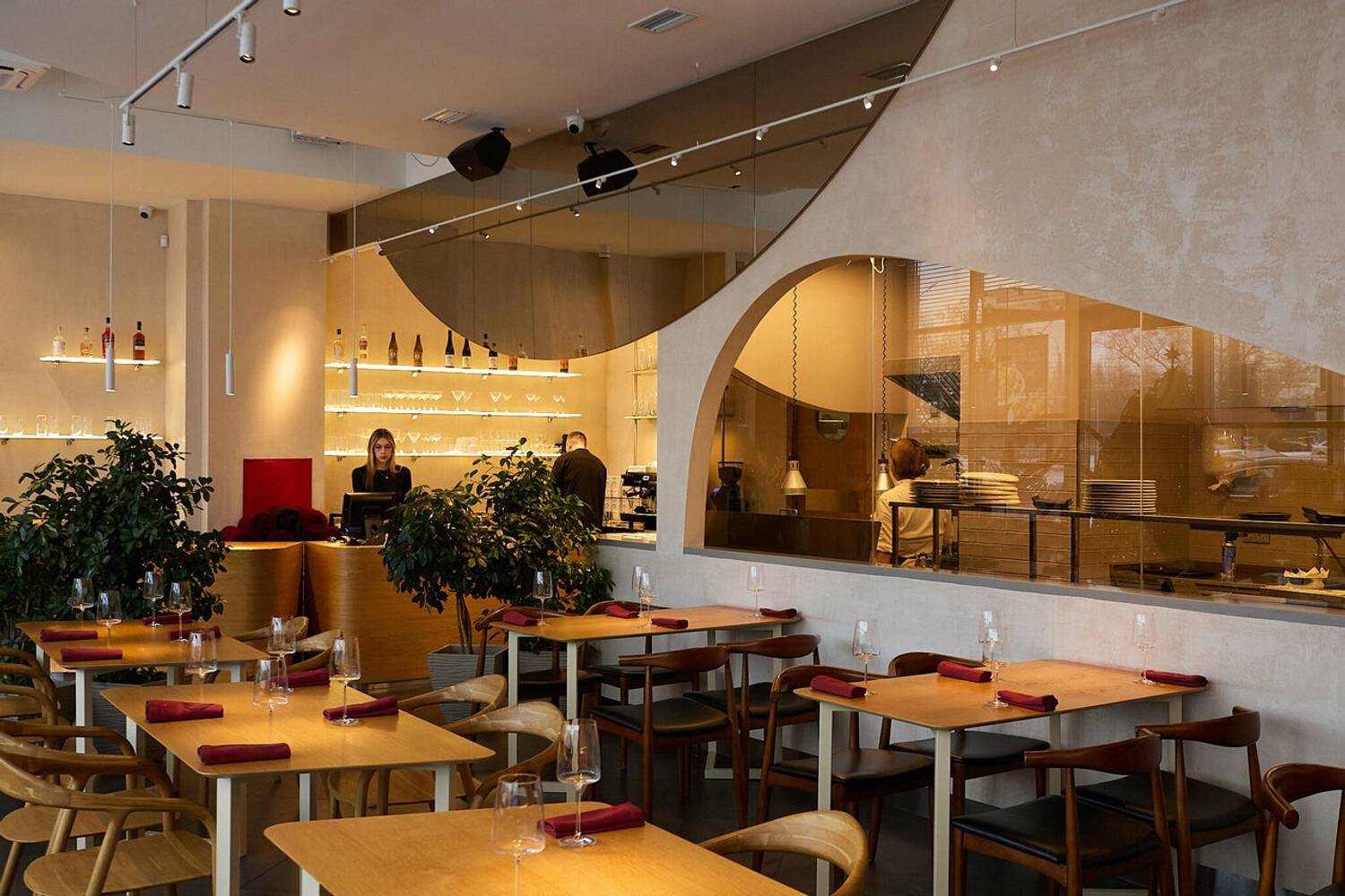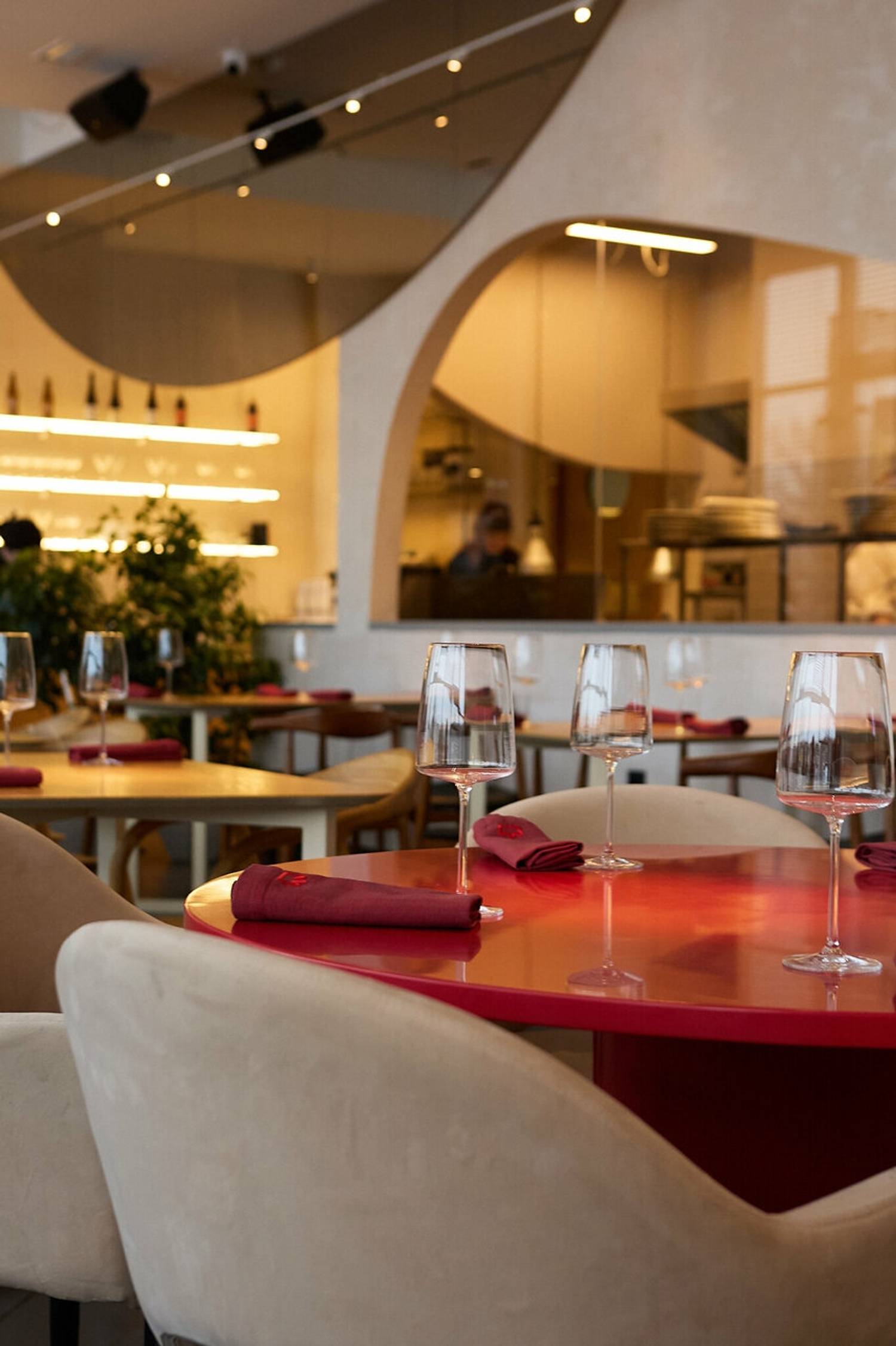 Атмосфера. Просторный и светлый зал с панорамными окнами и минималистичной мебелью из натурального светлого дерева создает ощущение спокойствия и порядка. Здесь много естественного света, выдержанный в бежево-бордовых цветах интерьер и лаконичная мебель: все это позволяет сосредоточиться на еде и общении. Это место подходит для неспешного обеда или ужина в расслабленной обстановке вдали от городской суеты.