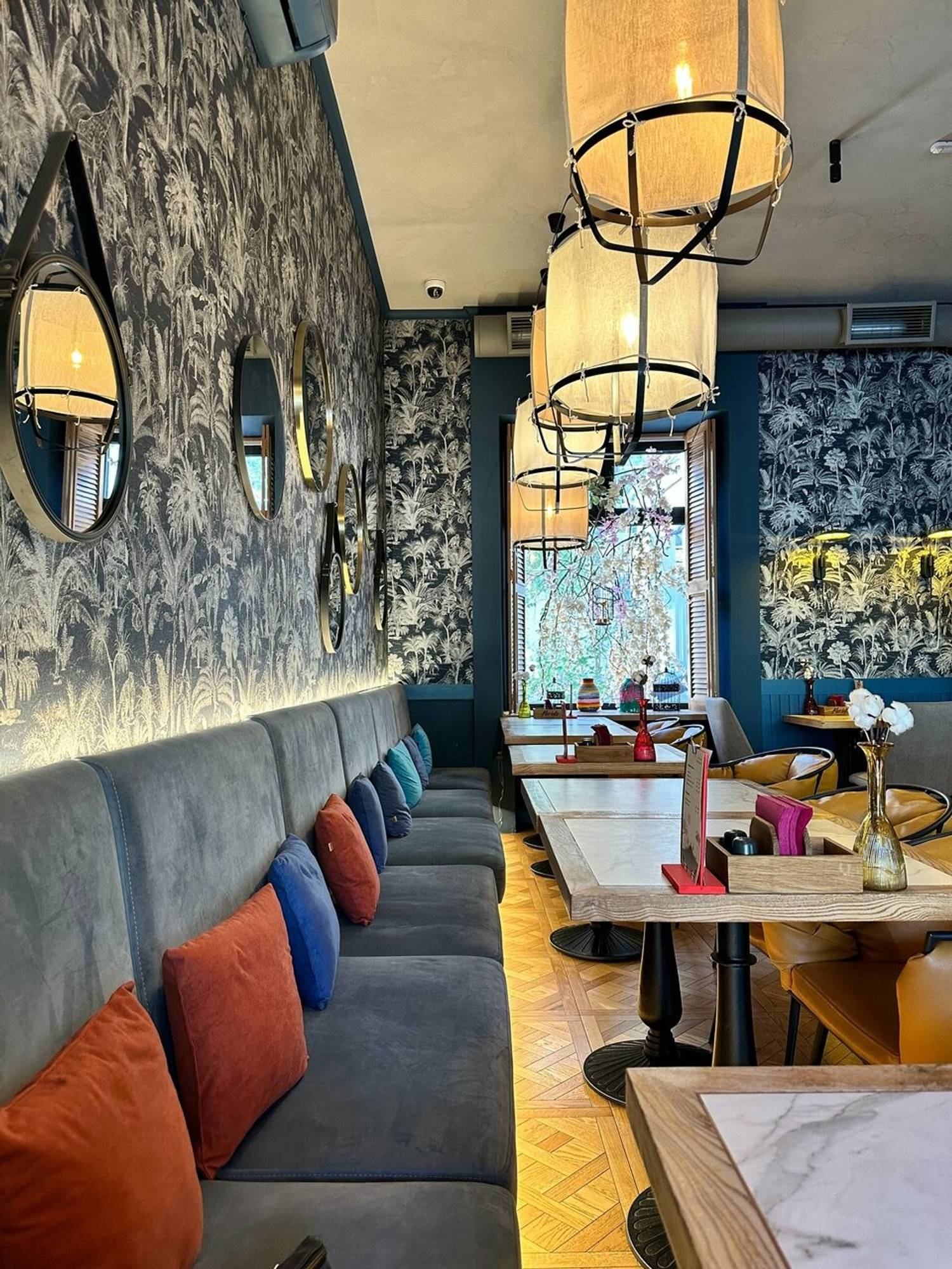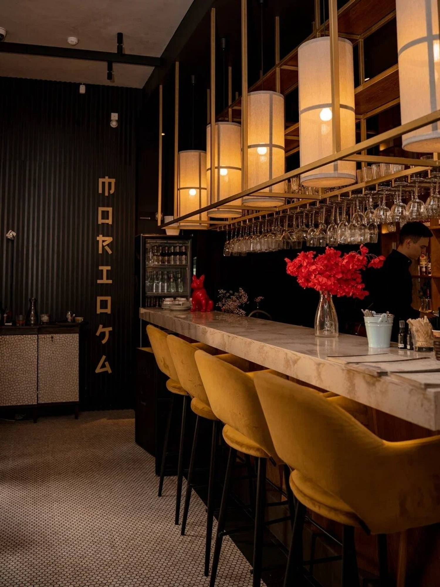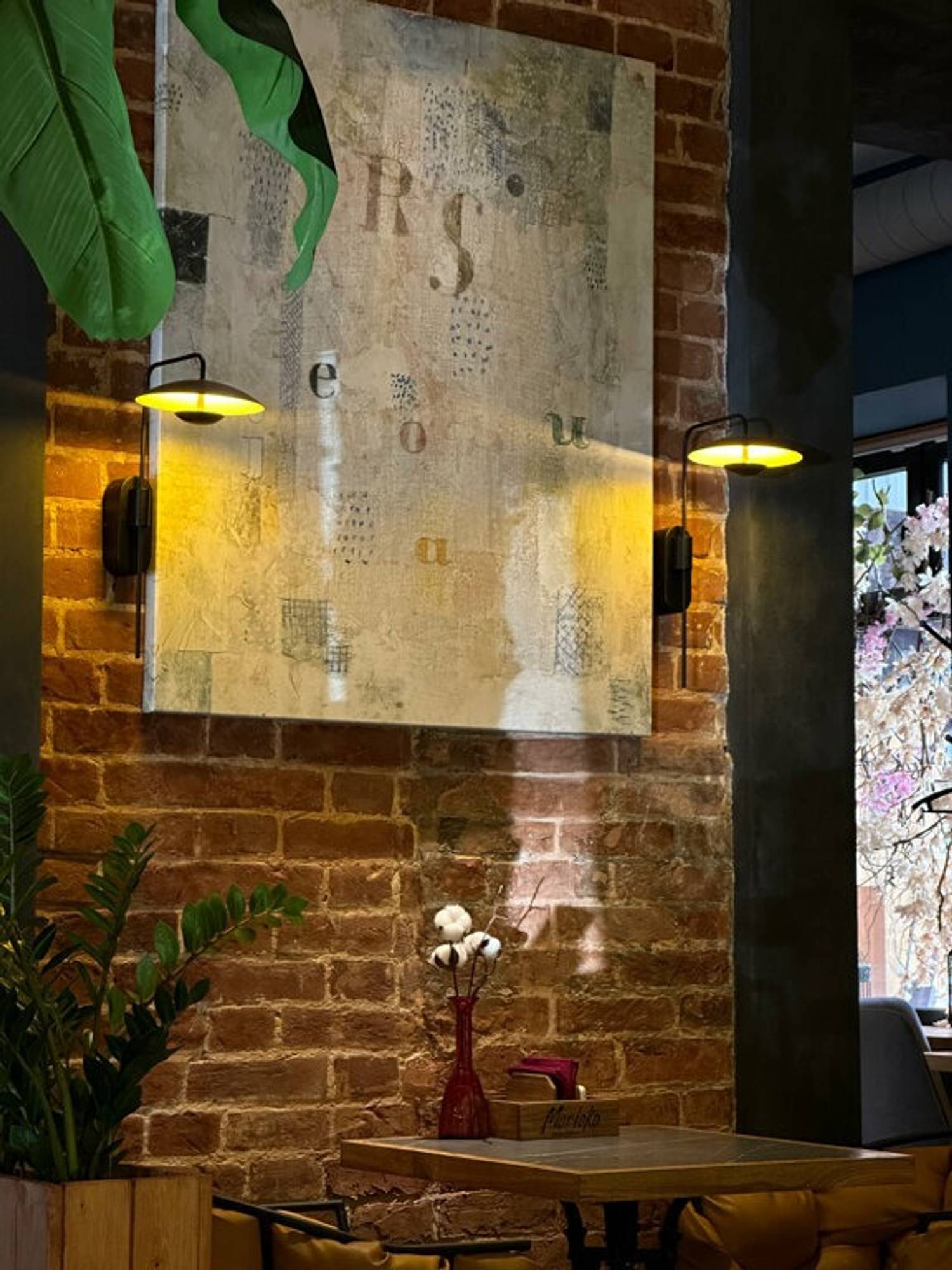 Атмосфера. Место спокойное, без суеты, с музыкой фоном и внимательным, ненавязчивым сервисом. Интерьер собран на контрастах: кирпичная кладка, черные стены с крупным серо-молочным принтом, абстрактные картины без рам и живые растения в простых деревянных кадках. Под потолком закреплены ветки сакуры на металлических каркасах, а свет дают оригинальные светильники из тонкой желтоватой ткани и темных ремней. В зале стоят мягкие серые диваны и каркасные кресла с кожаной обтяжкой, рядом небольшие столики из натурального дерева. Отдельная деталь, которую часто замечают, — длинная контактная стойка со столешницей из молочно-розоватого мрамора и высокими барными креслами в горчичной обивке.