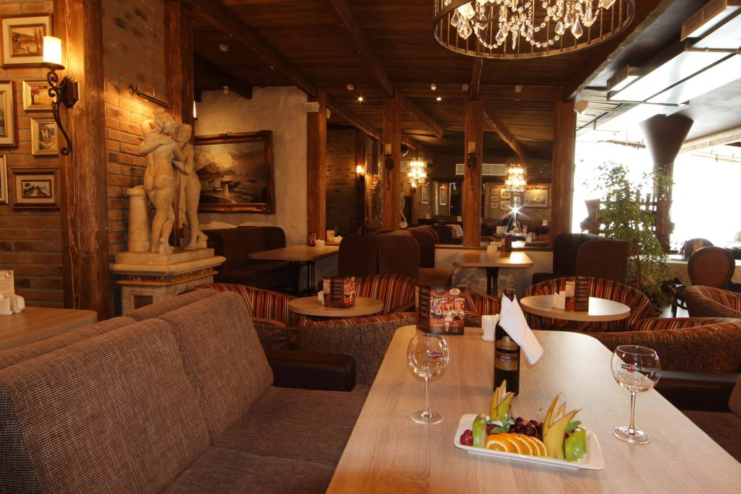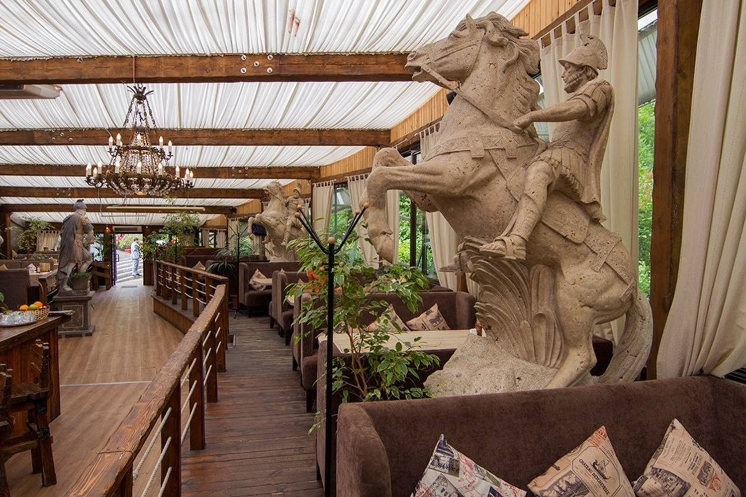 Атмосфера. Интерьер — это диалог натуральных материалов и продуманного дизайна. Дерево, камень, панорамные окна, за которыми Александровский парк. В основном зале уютно и просторно, банкетный зал ждёт больших компаний, VIP-кабинет с камином — для тех, кто хочет уединения и тепла. Застекленная терраса с мраморными скульптурами и видом на парк — идеальное место для романтического ужина или делового обеда. А белый зал с выходом в сад — для тех, кто любит свет и воздух. Внутри всегда спокойно, красиво и продуманно до мелочей. Но тишина здесь не вечна: вечерами ресторан оживает — квизы, детективные игры, музыкальные вечера, дискотеки. Каждый найдет свой формат.