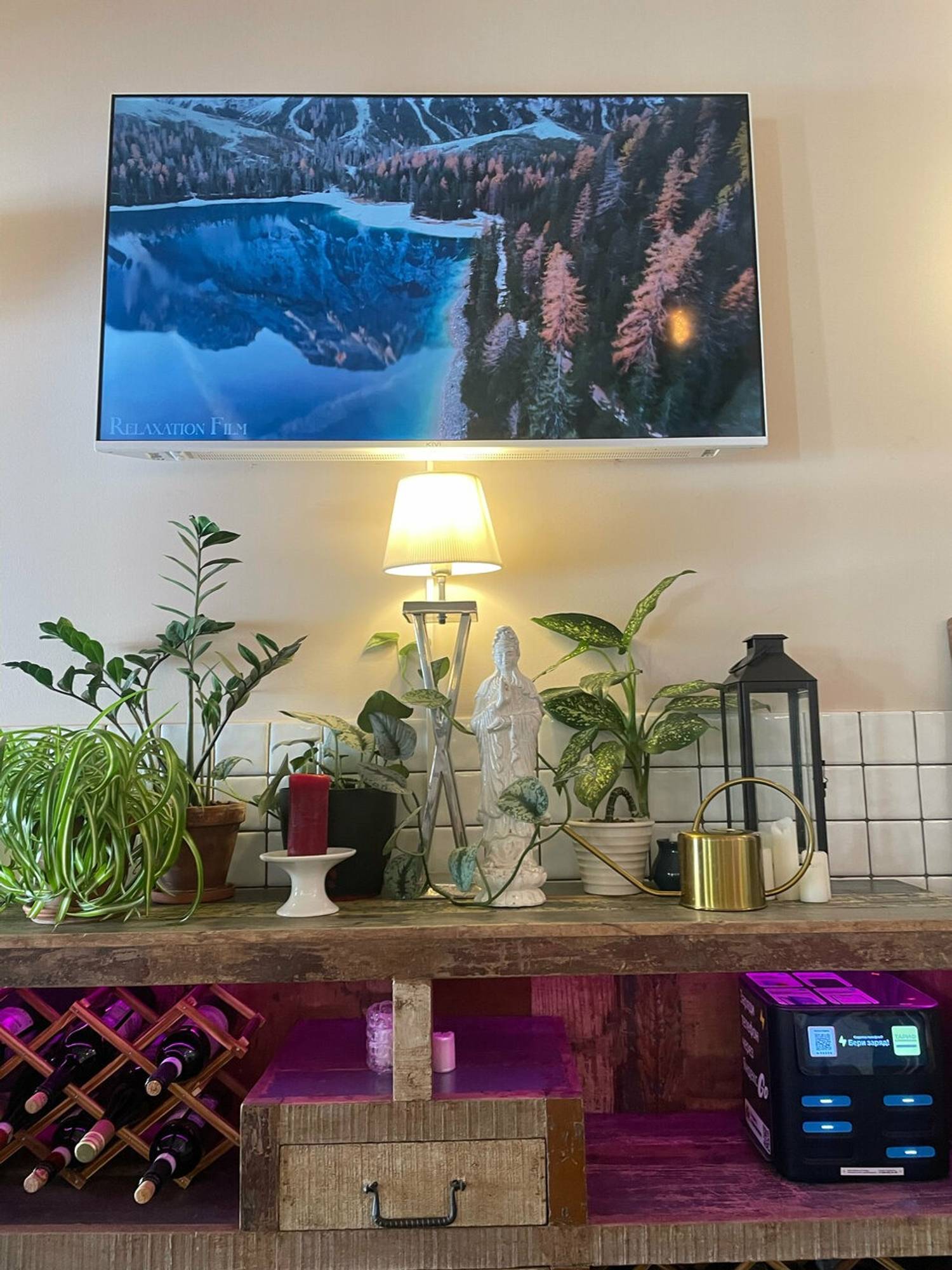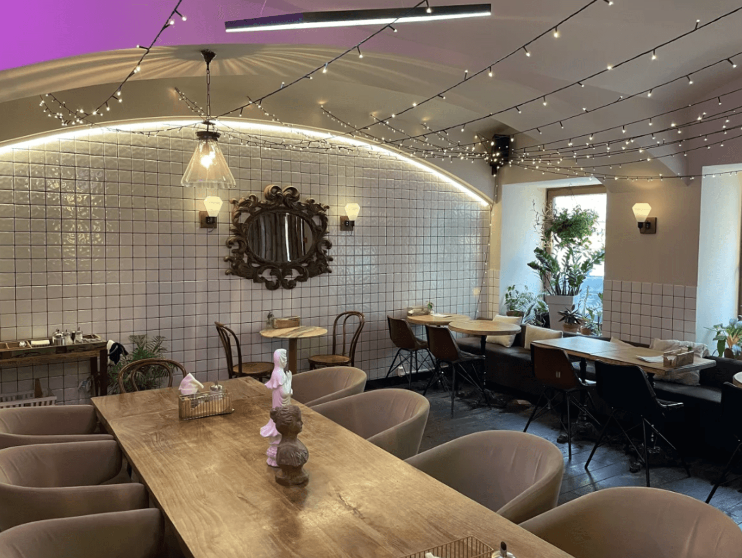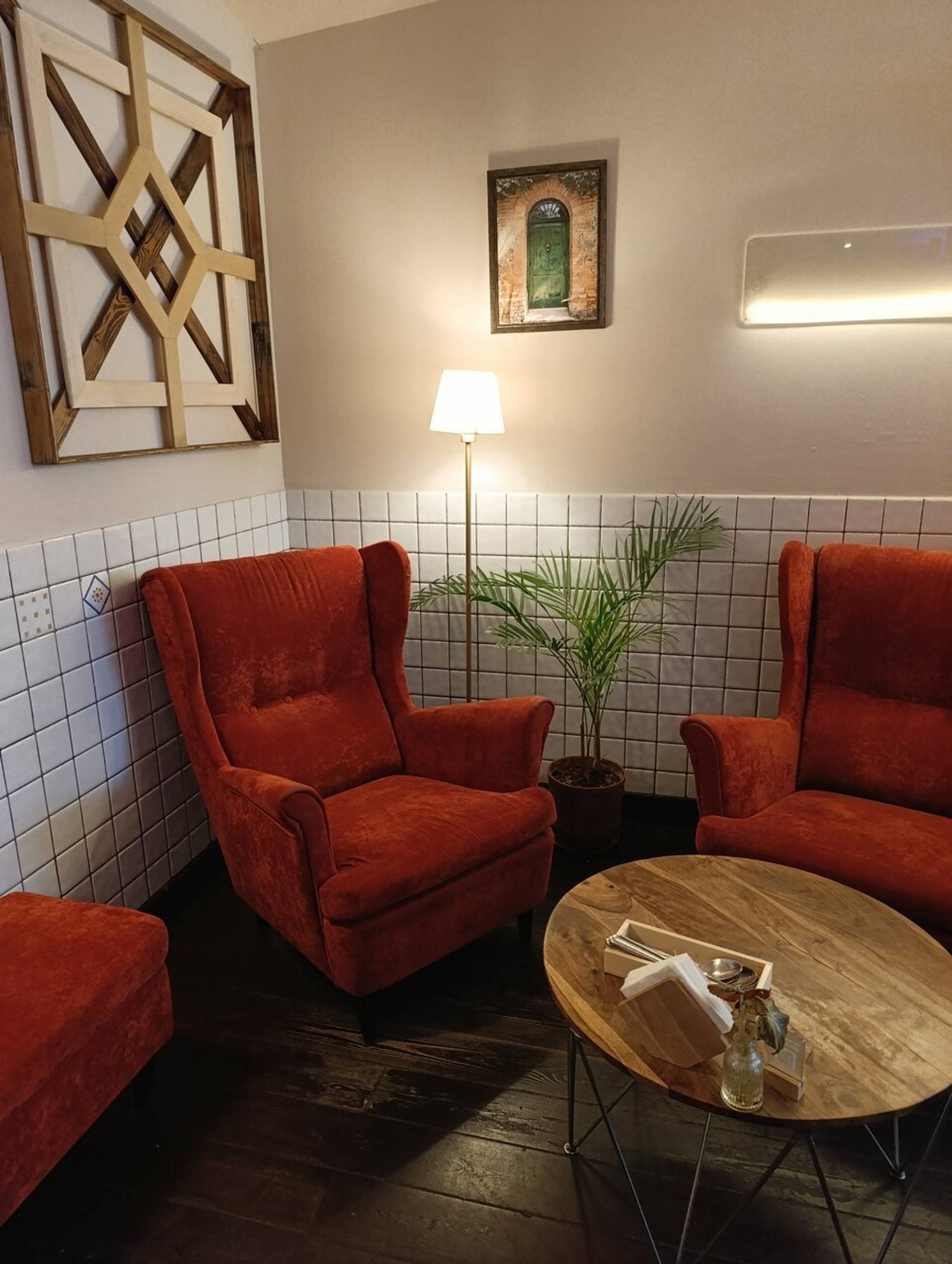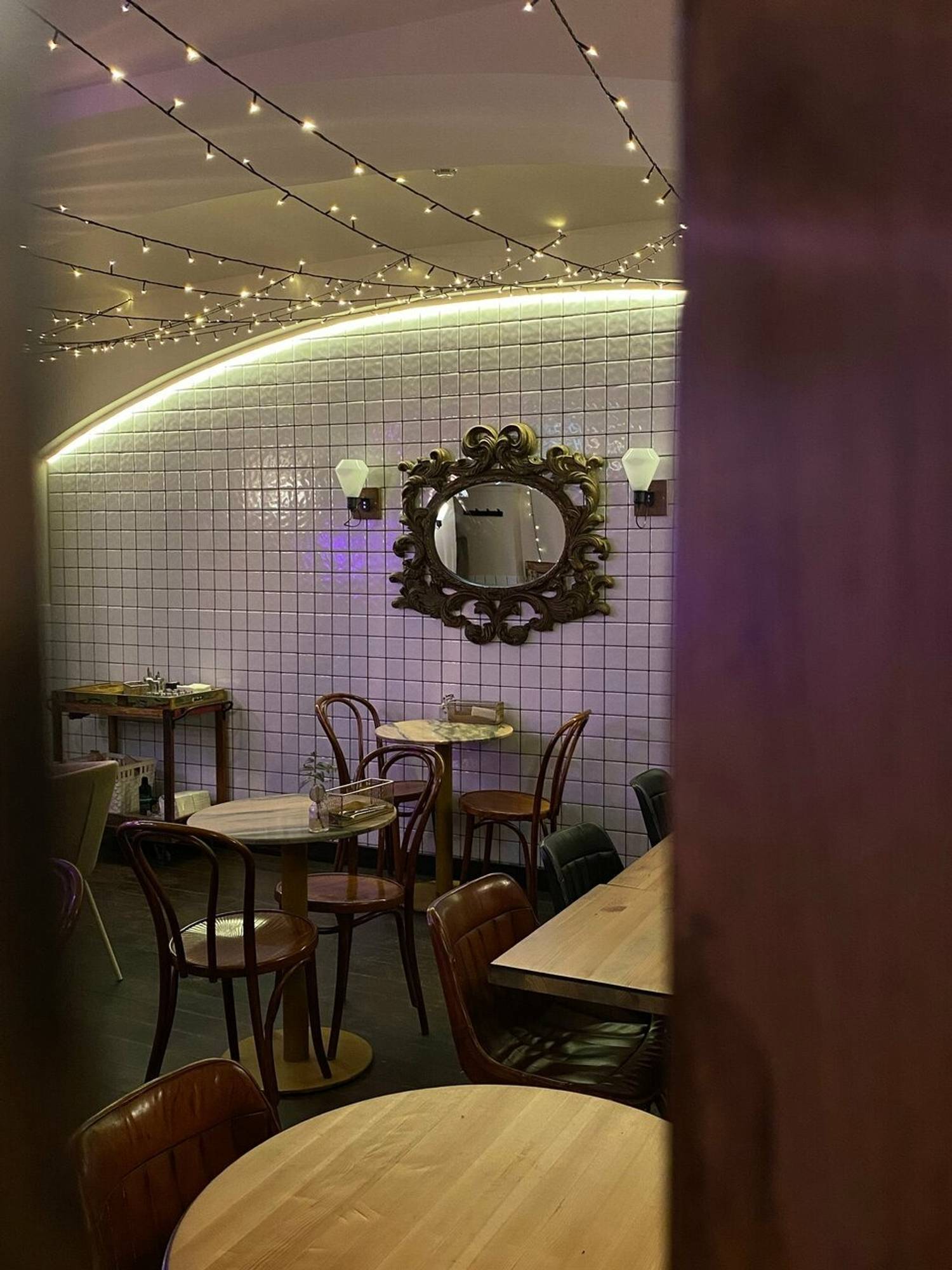 Атмосфера. Светлый интерьер со стенами, которые отделаны белой плиткой и красивым зеркалом с золотой узорной рамой. На деревянном комоде можно увидеть интересные белые фигурки, свечи и бутылки вина с сетчатом отделении.