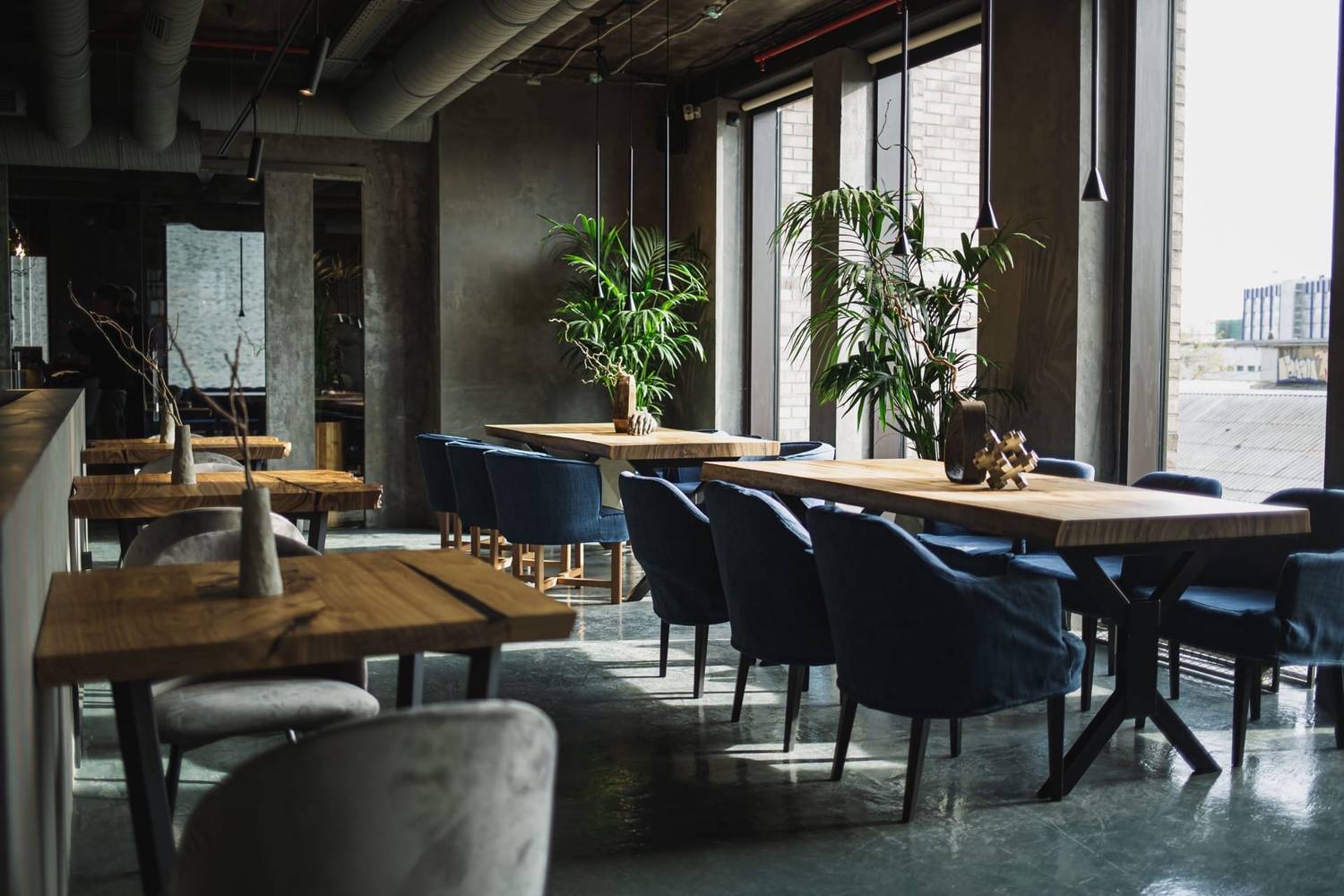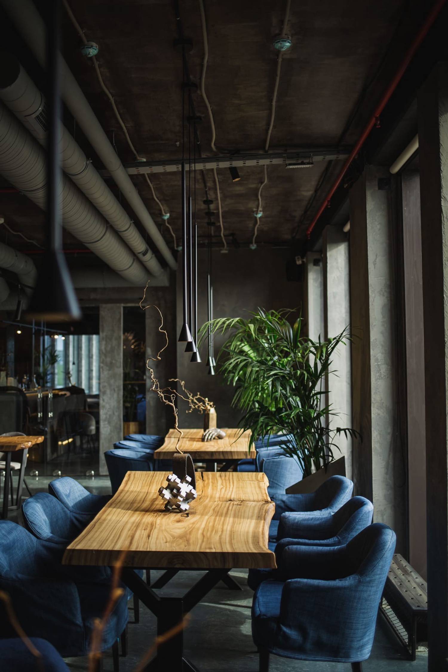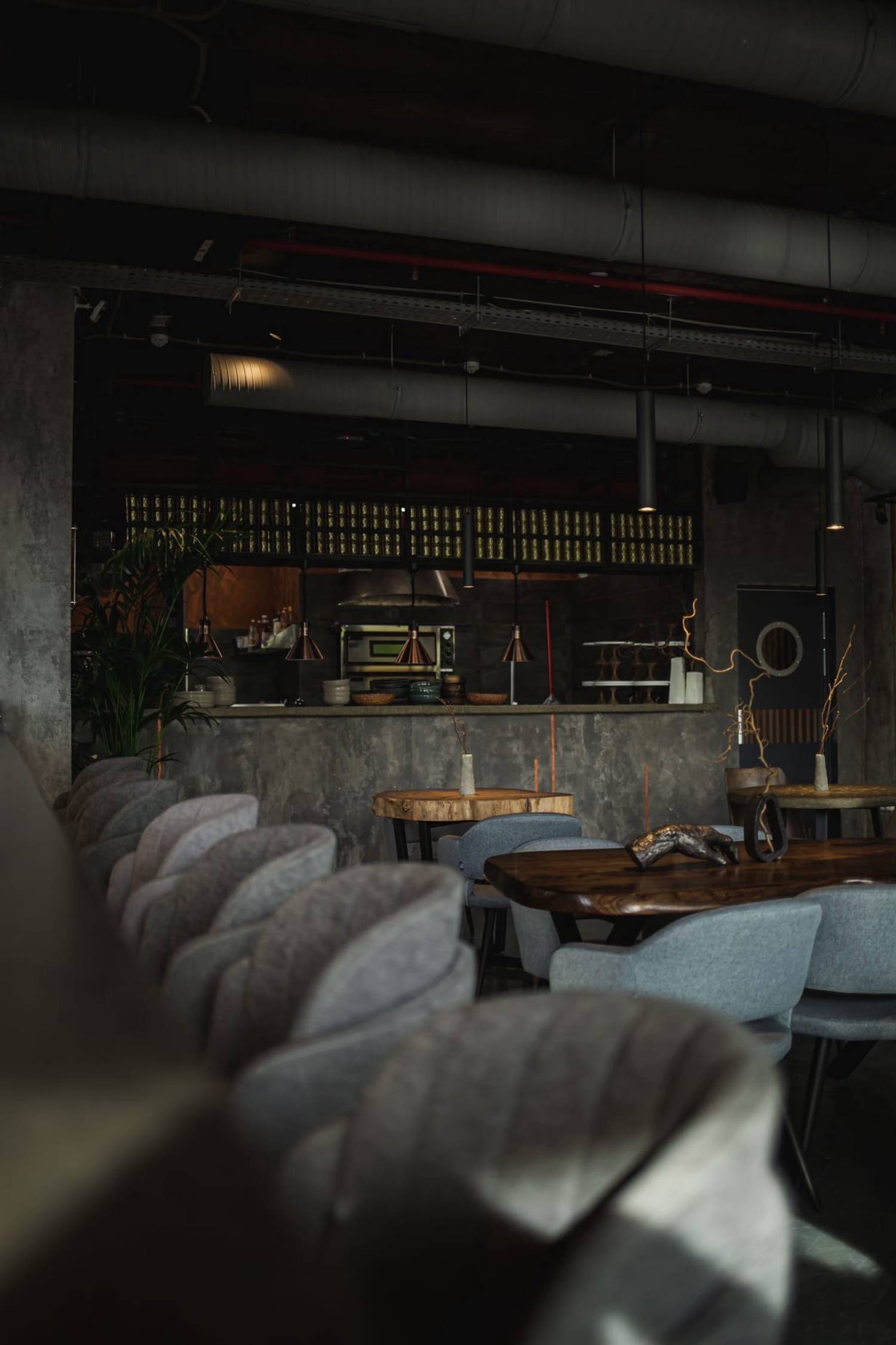 Атмосфера. Пространство напоминает своеобразный гастрономический театр: здесь брутальный бетон контрастирует с живой зеленью, а тактильные текстуры дерева и камня создают многослойность и отражают натуральность. Мягкий свет и продуманное освещение делают обстановку одновременно динамичной и уютной.