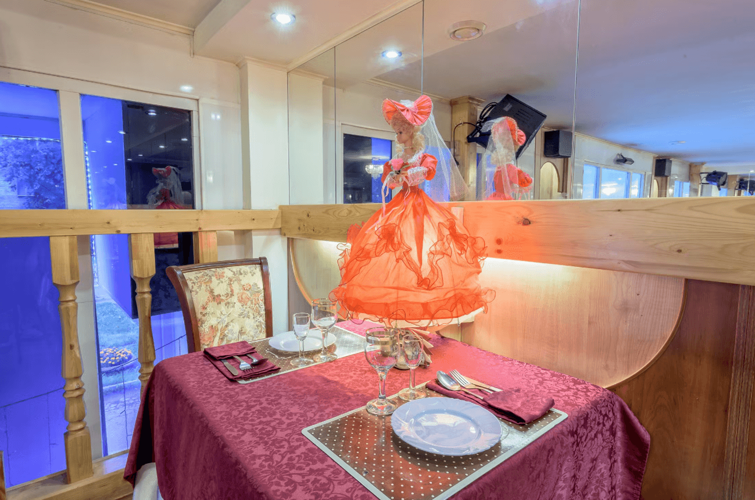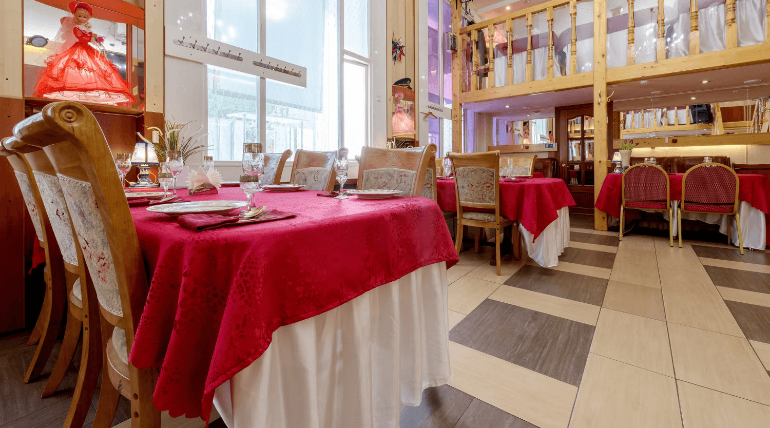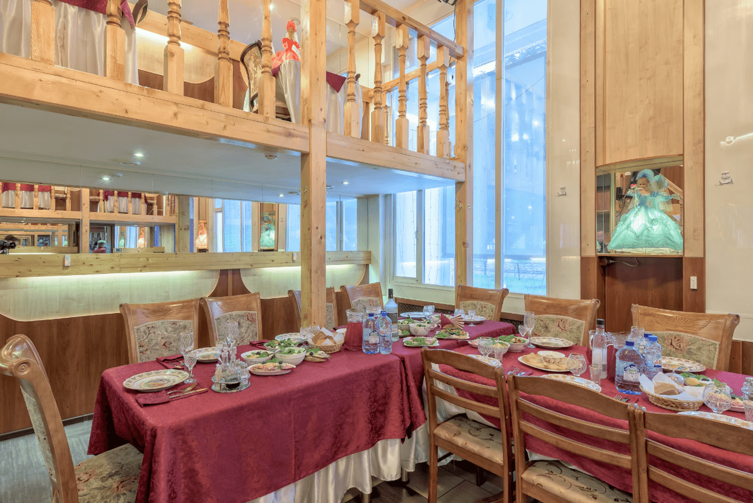 Атмосфера. Двухэтажный ресторан с домашним теплом, которое создают деревянные лестницы и стулья с цветочным принтом. На полках расставили оригинальные декоративные элементы — куклы в пышных платьях. По вечерам в ресторане проходят выступления музыкантов, а по выходным гости могут спеть в караоке и потанцевать.