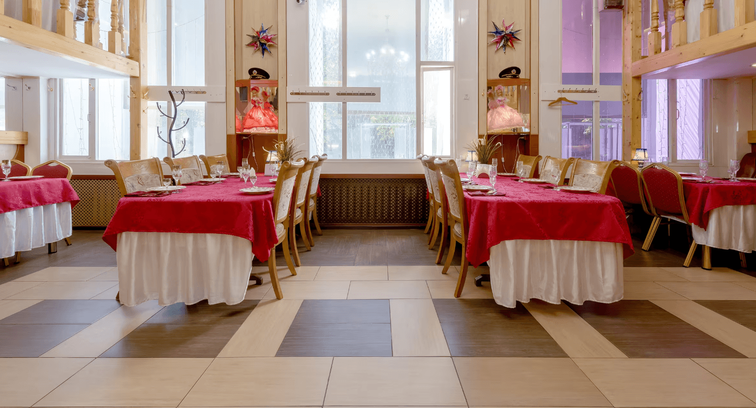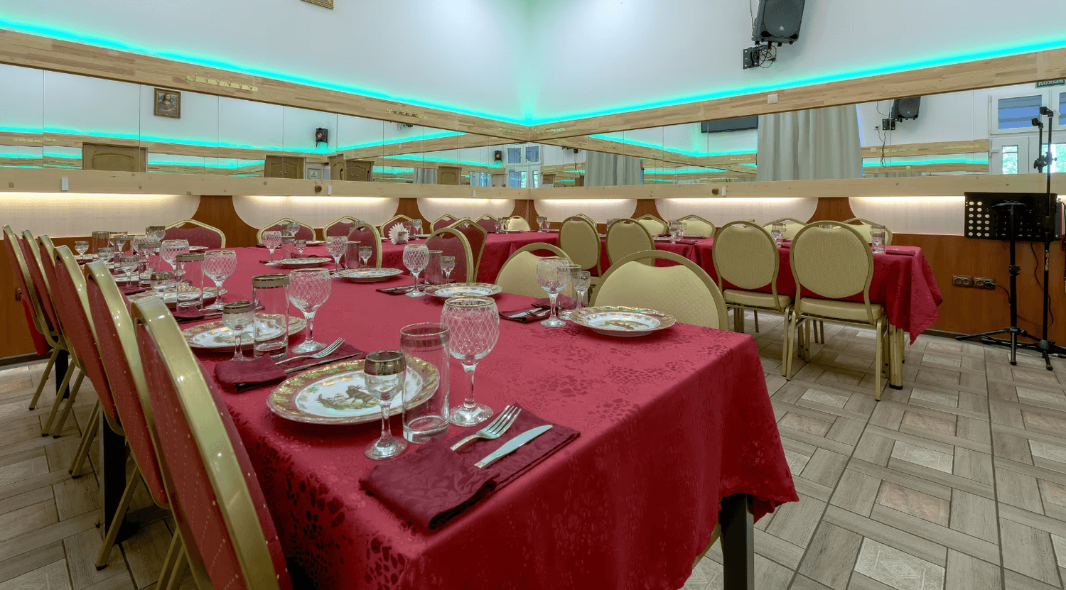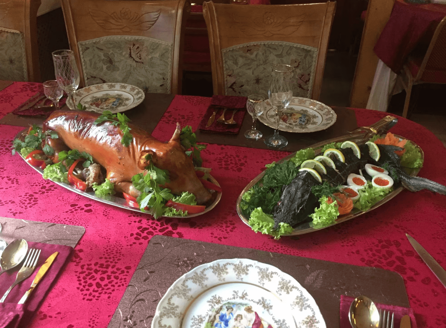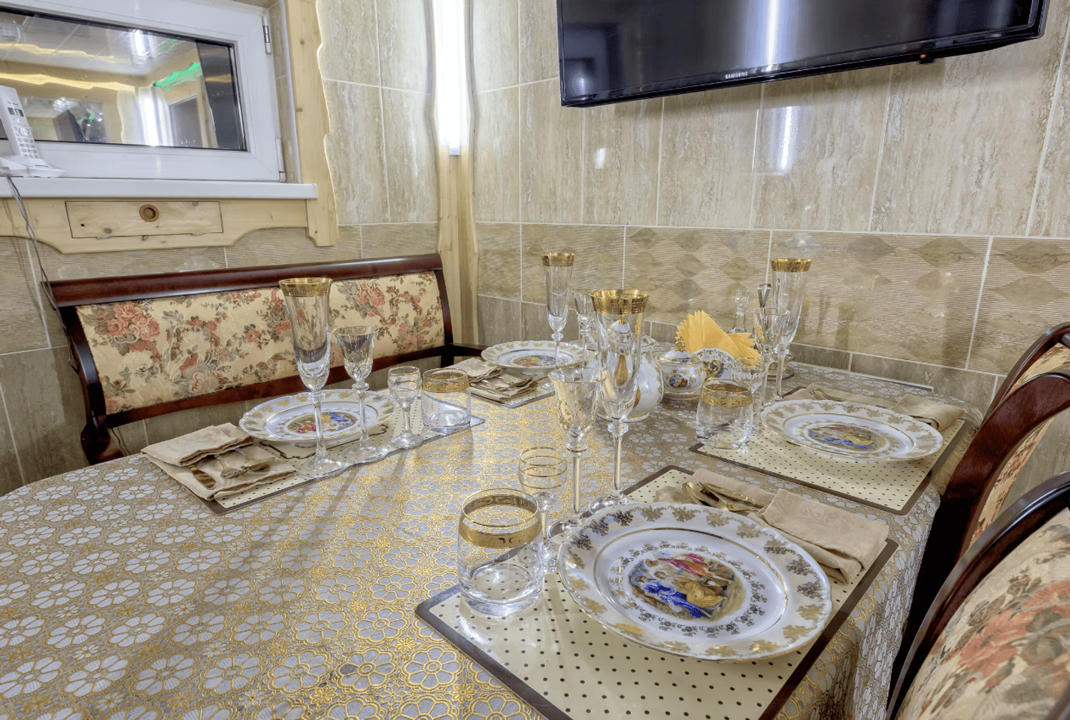 Еда и напитки. В меню — блюда русской и европейской кухни: фаршированный овощами осетр, утка, запеченная в яблоках, шашлык из свинины, немецкие шницели и говядина тушеная с черносливом. На десерт есть легкий фруктовый салат или фирменное мороженое.