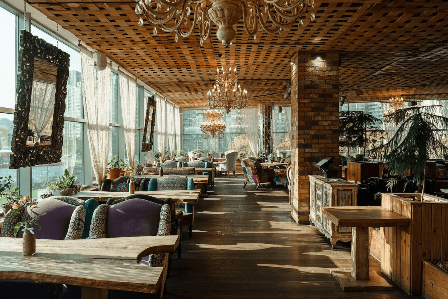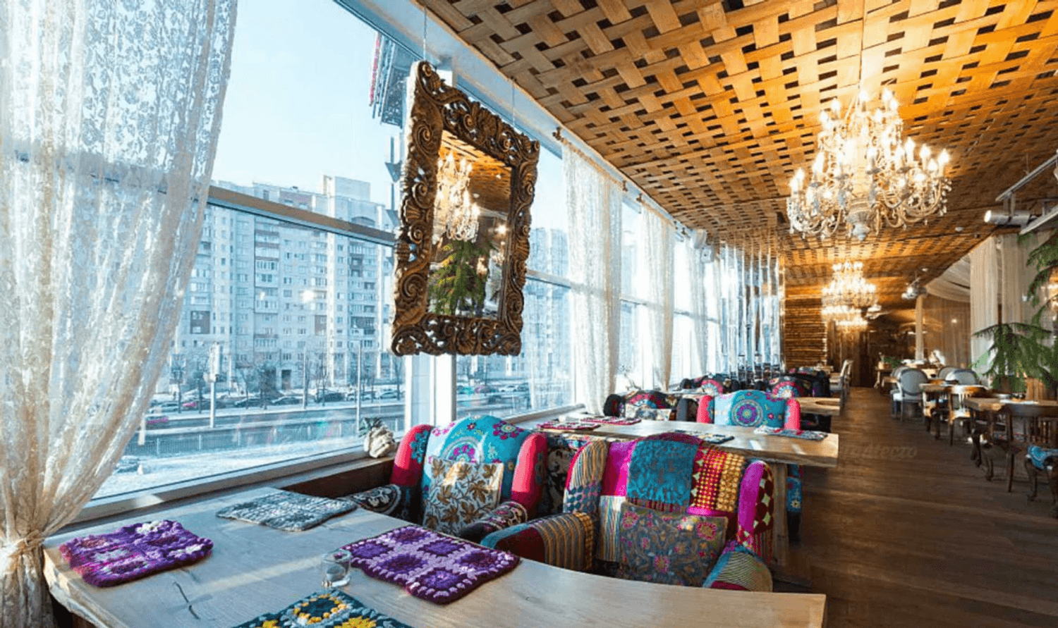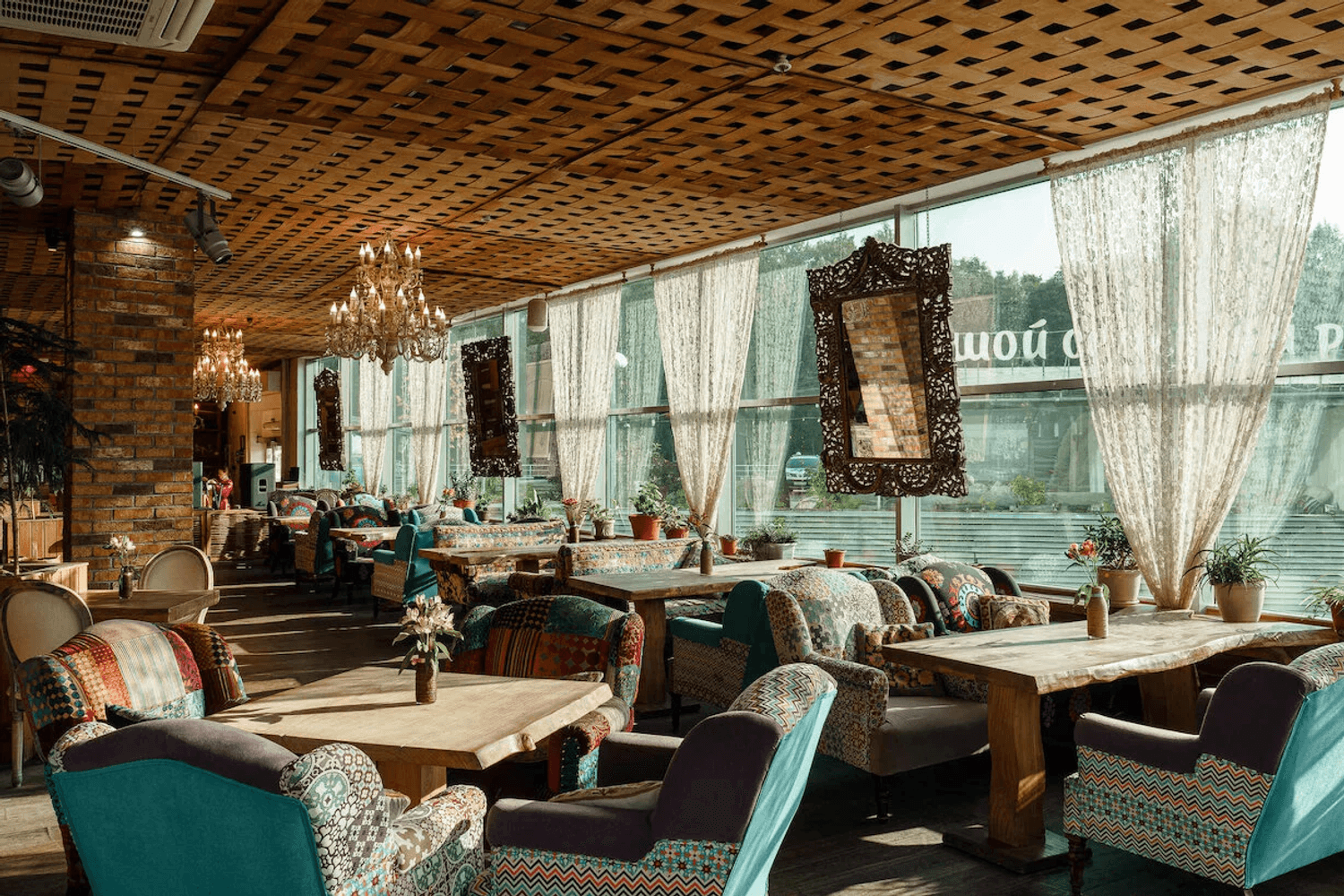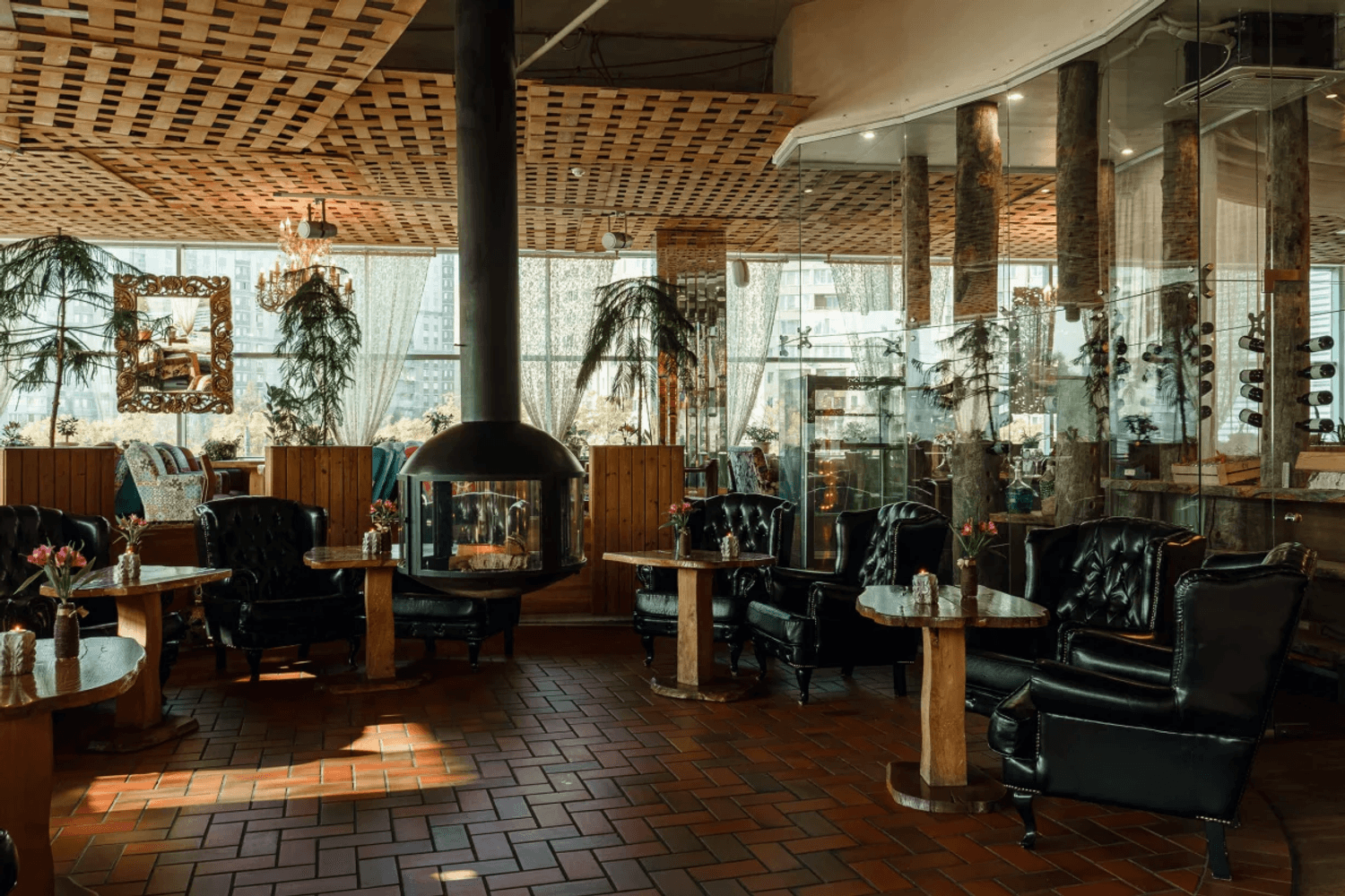 Атмосфера. Пространство напоминает деревенскую усадьбу из народных сказаний: бревенчатые стены, потолок из бересты, кирпичные столбы и винтажная утварь. Зеркала в кованых рамах и стеклянные витрины со свежей выпечкой гармонично дополняют сказочный антураж. Летом гости могут провести время на веранде с натуральным газоном, а дети — играть в комнате.
