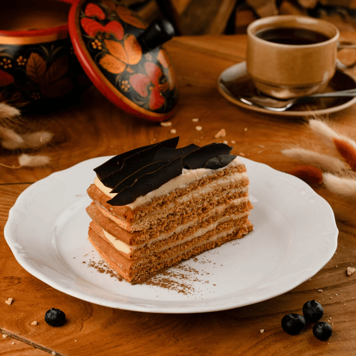 Еда и напитки. В меню — русская кухня: котлеты из щуки, деруны со шкварками, свинокабан на вертеле, чебуреки с олениной. Для любителей сладкого есть грушевый наполеон, медовик на топленом шоколаде и мороженое сметана с какао.