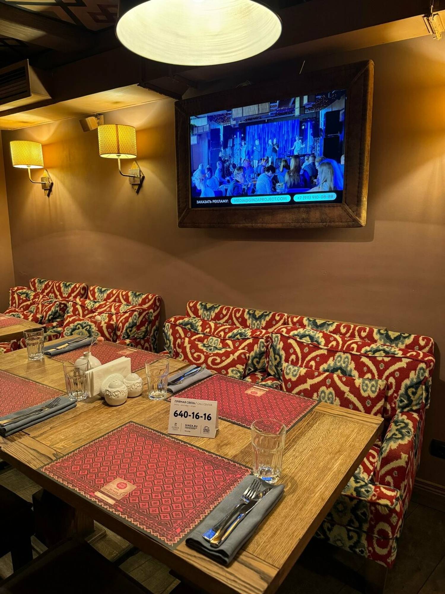 Атмосфера. Двухуровневое заведение с грузинским колоритом: национальные узоры, кадки с зеленью и предметами утвари. Летняя терраса, круглосуточный формат и возможность шумных застолий сохраняют дух гостеприимства Грузии.