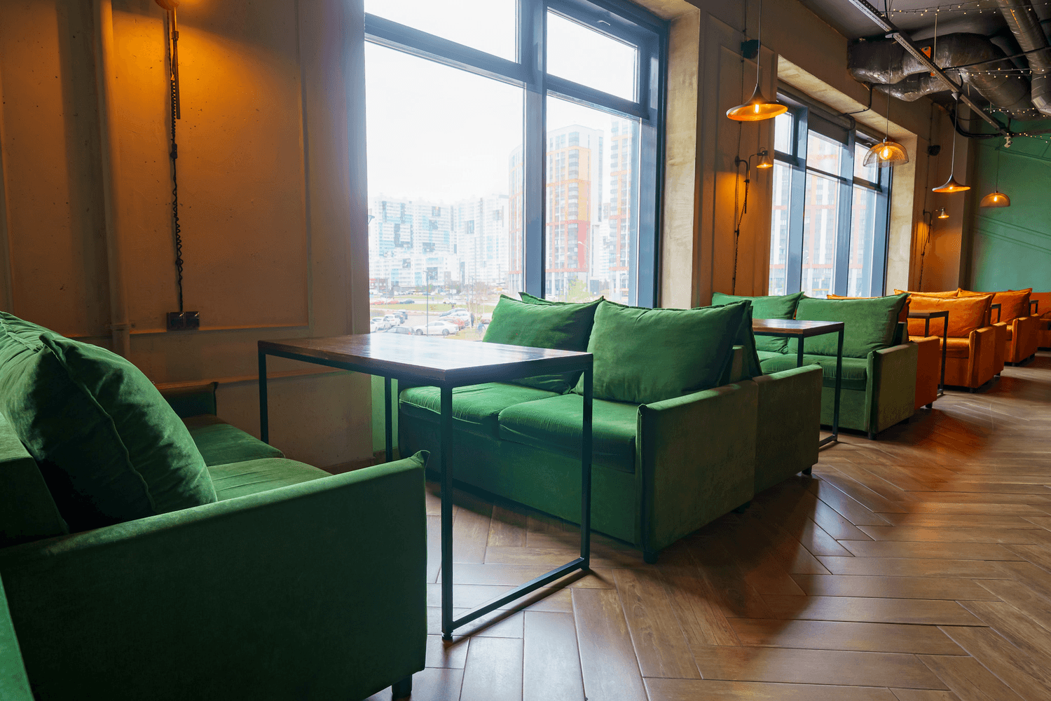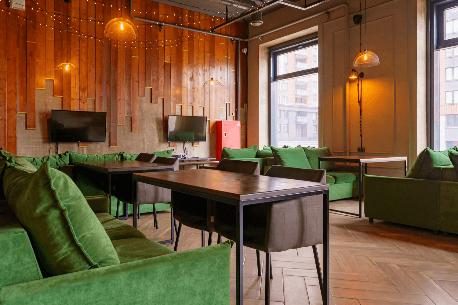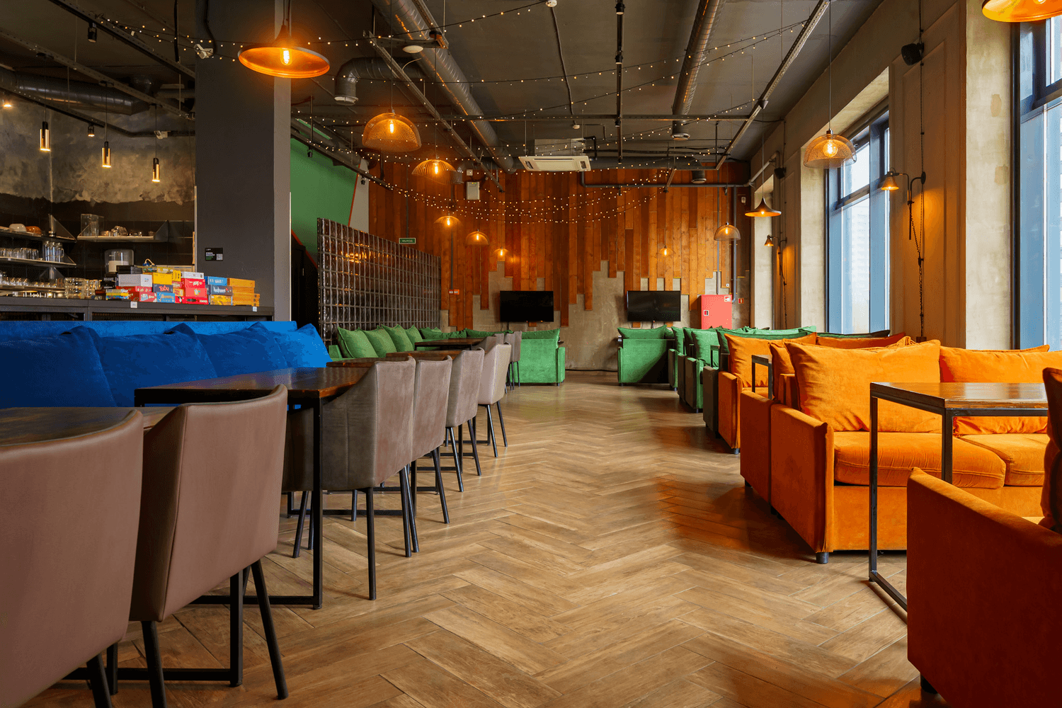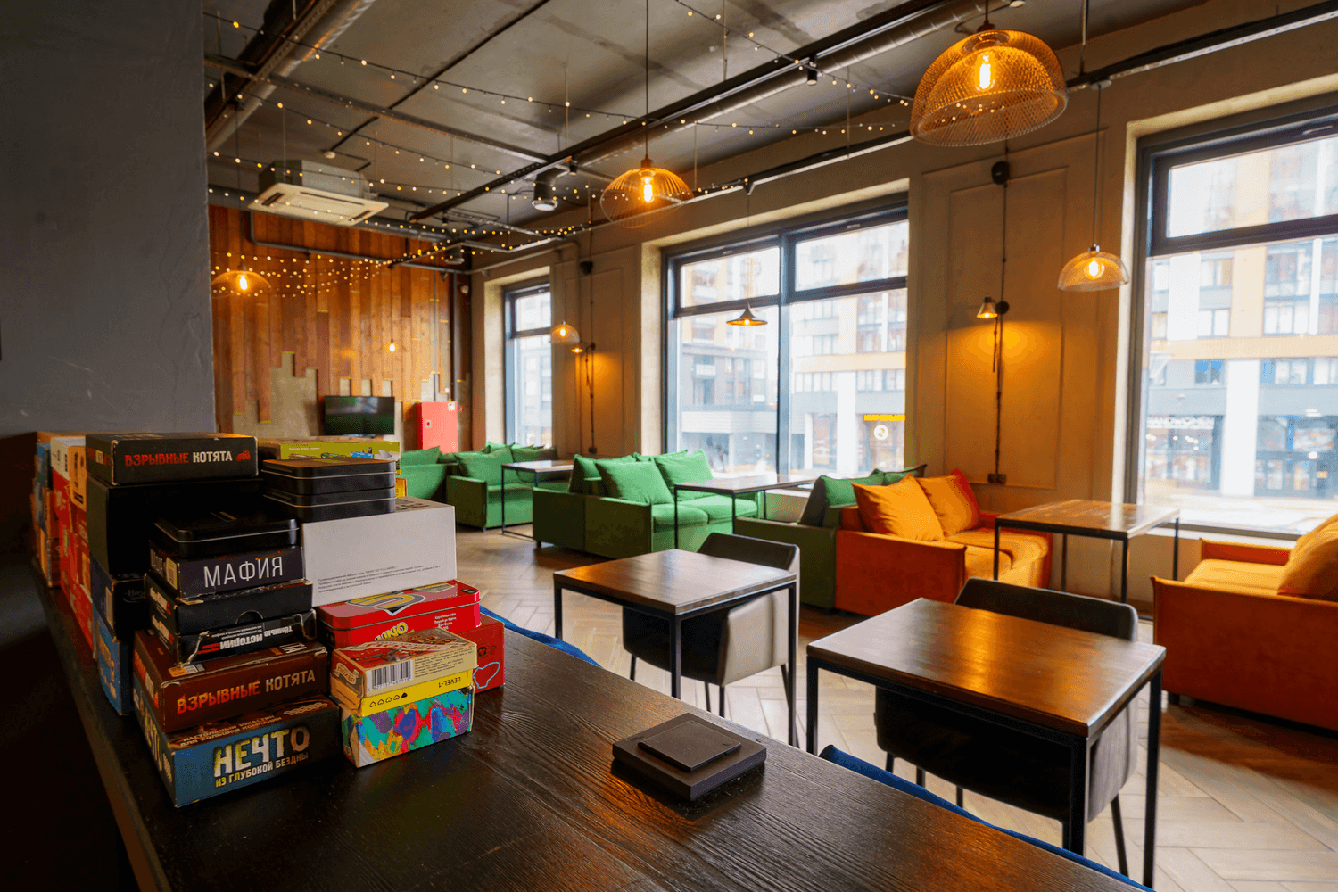 Атмосфера. Дизайн в спокойных бежевых тонах с изумрудными диванами, барными стойками и зонами для разных компаний. Здесь собираются, чтобы отдохнуть с друзьями за настольными играми или приставкой.
