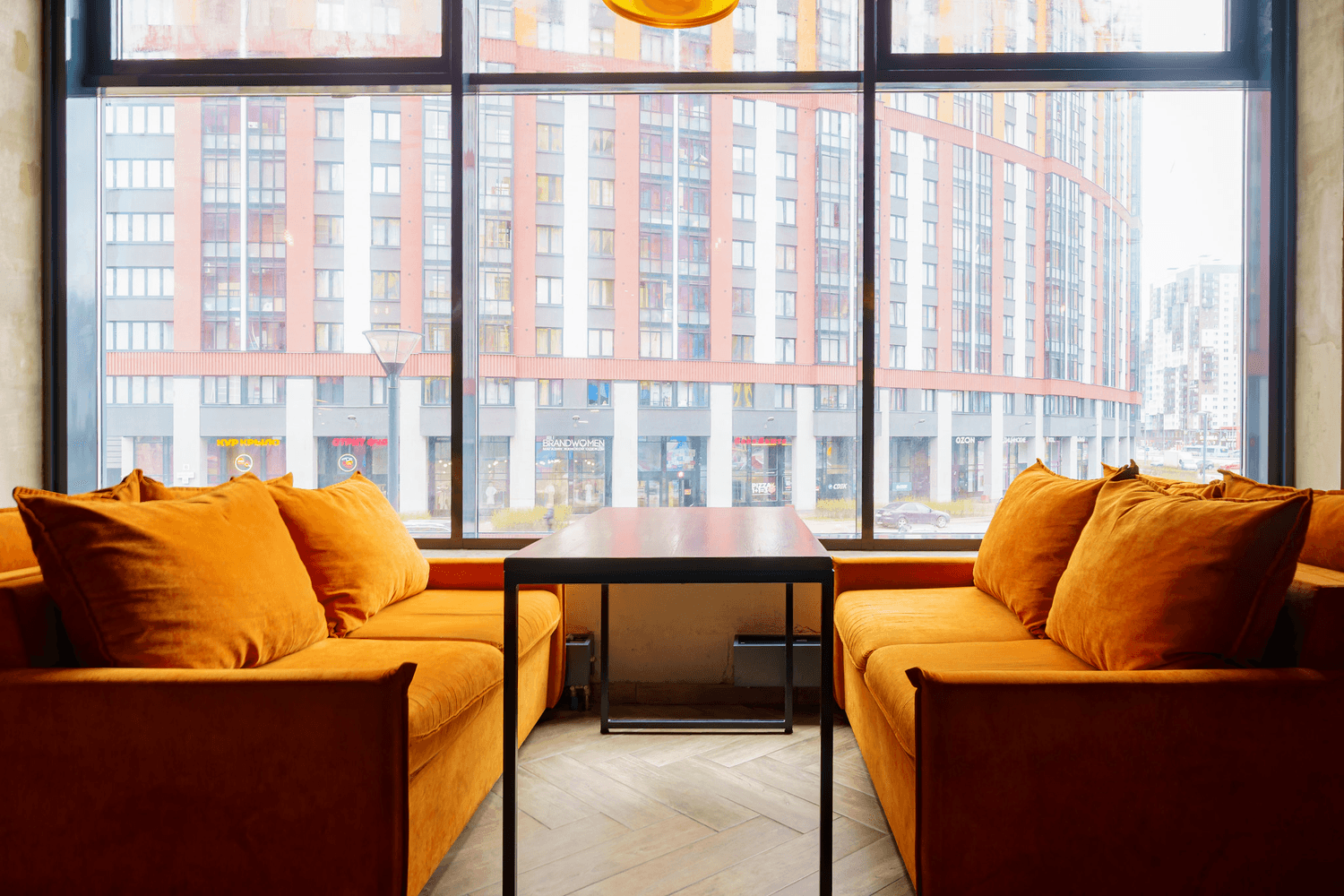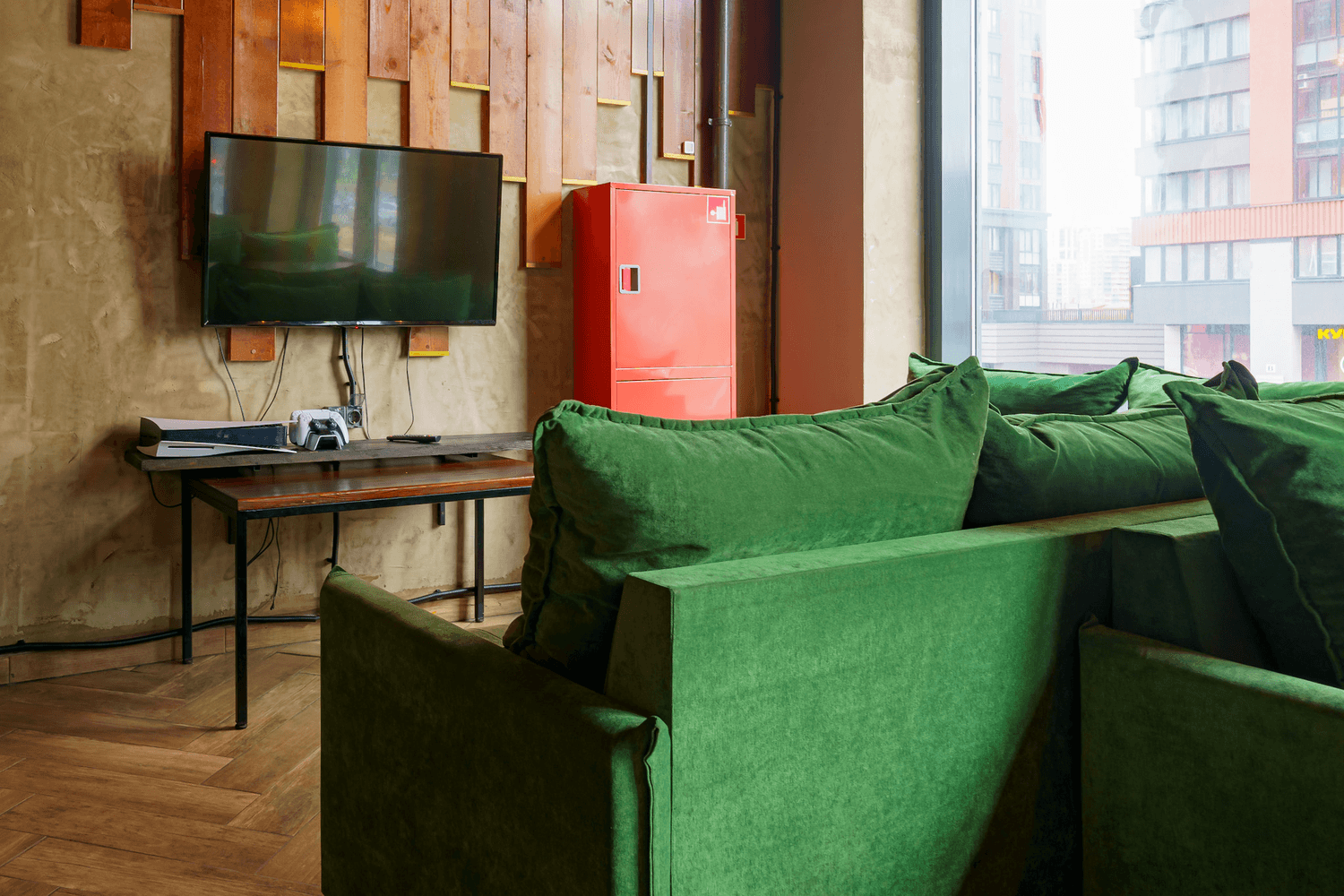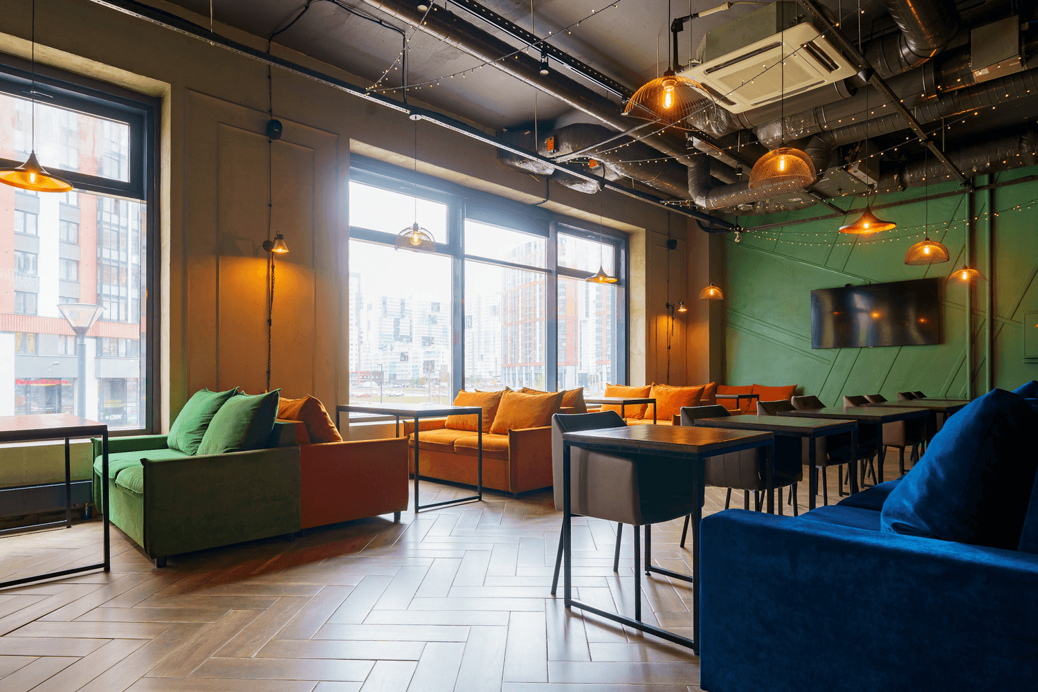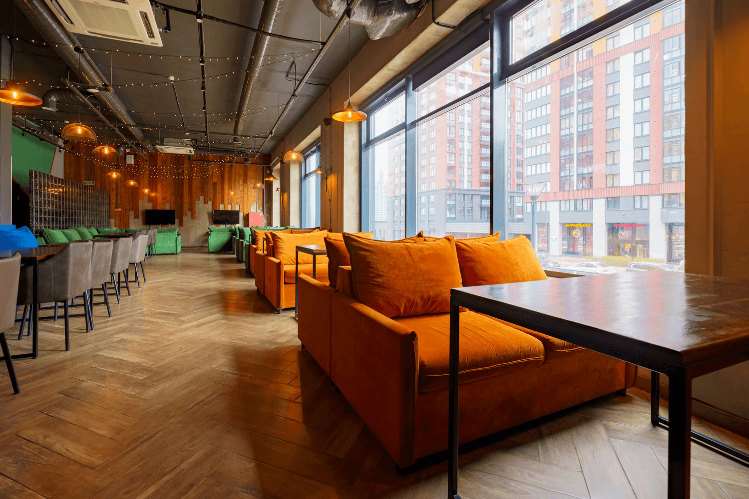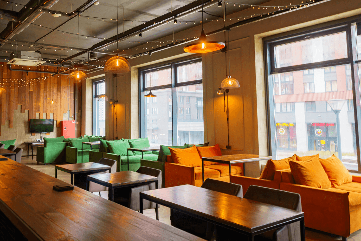 Атмосфера. Дизайн в спокойных бежевых тонах с изумрудными диванами, барными стойками и зонами для разных компаний. Здесь собираются, чтобы отдохнуть с друзьями за настольными играми или приставкой.