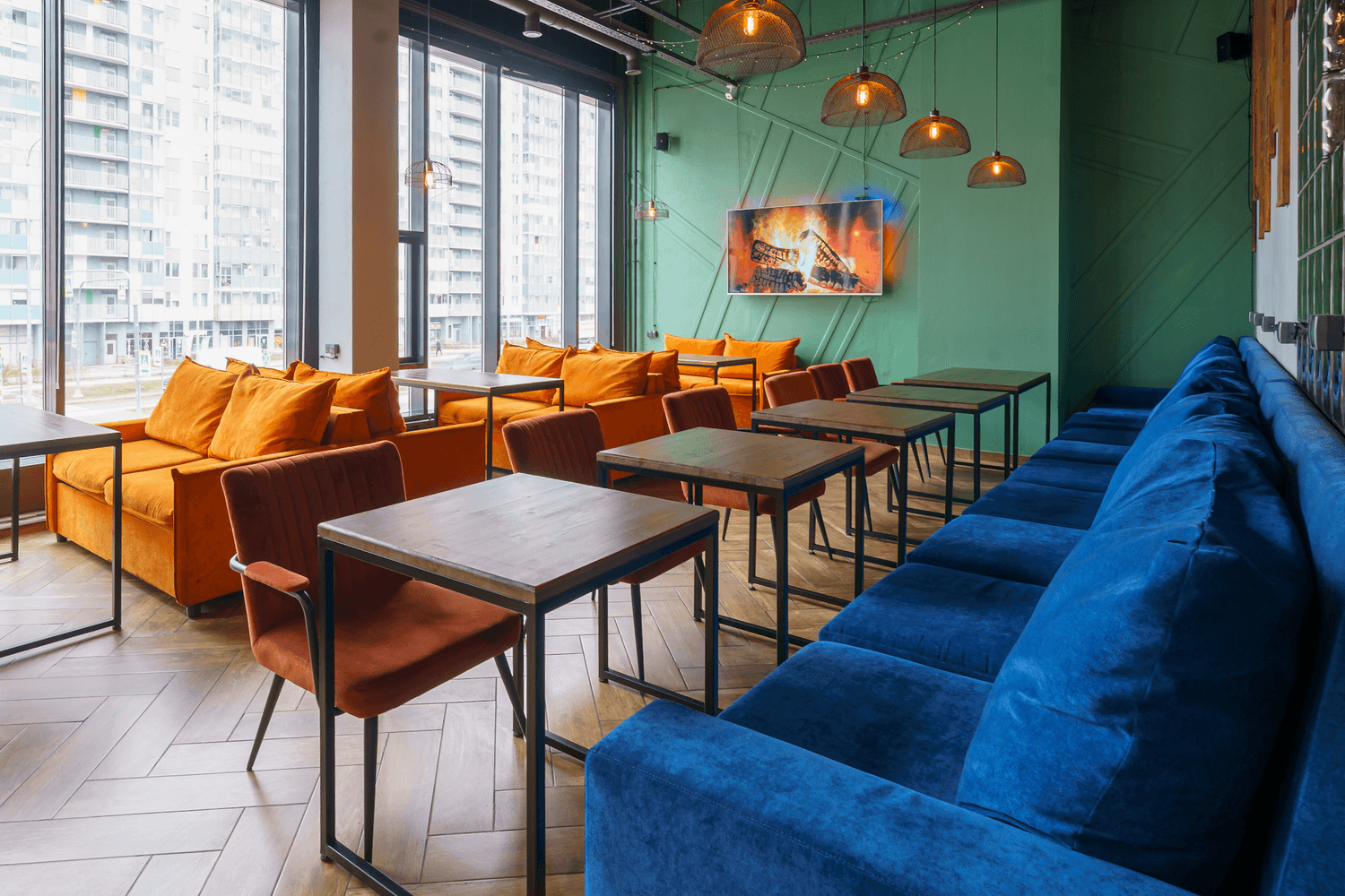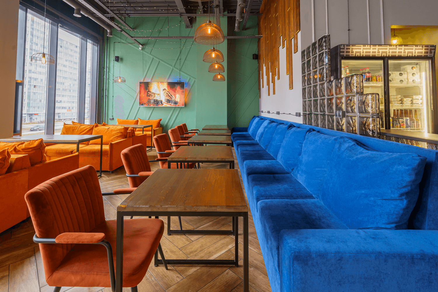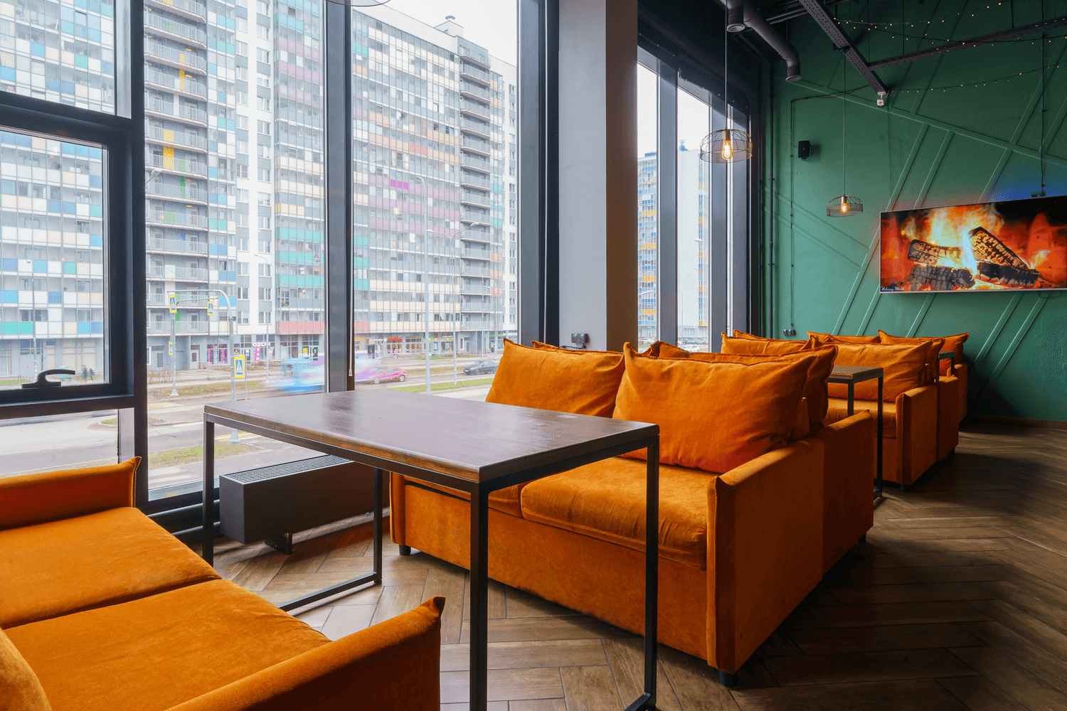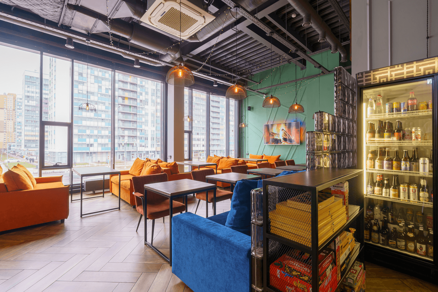 Атмосфера. Яркое пространство с синими и оранжевыми диванами и панорамными окнами. Это место, где можно расслабиться на удобном диване и поиграть в настольные игры, приставку.