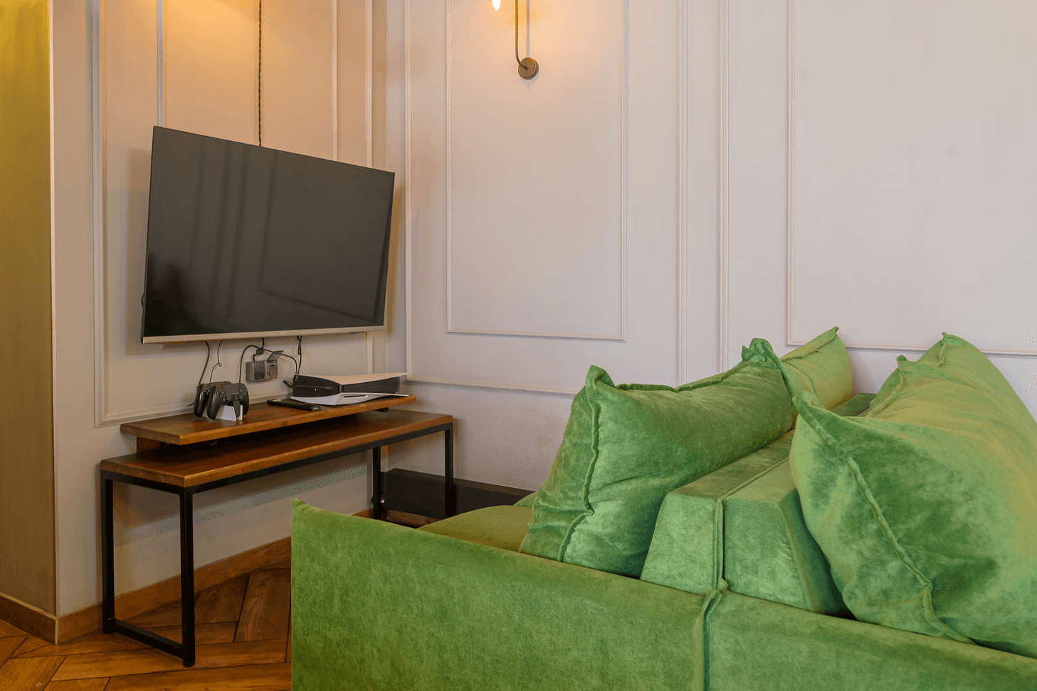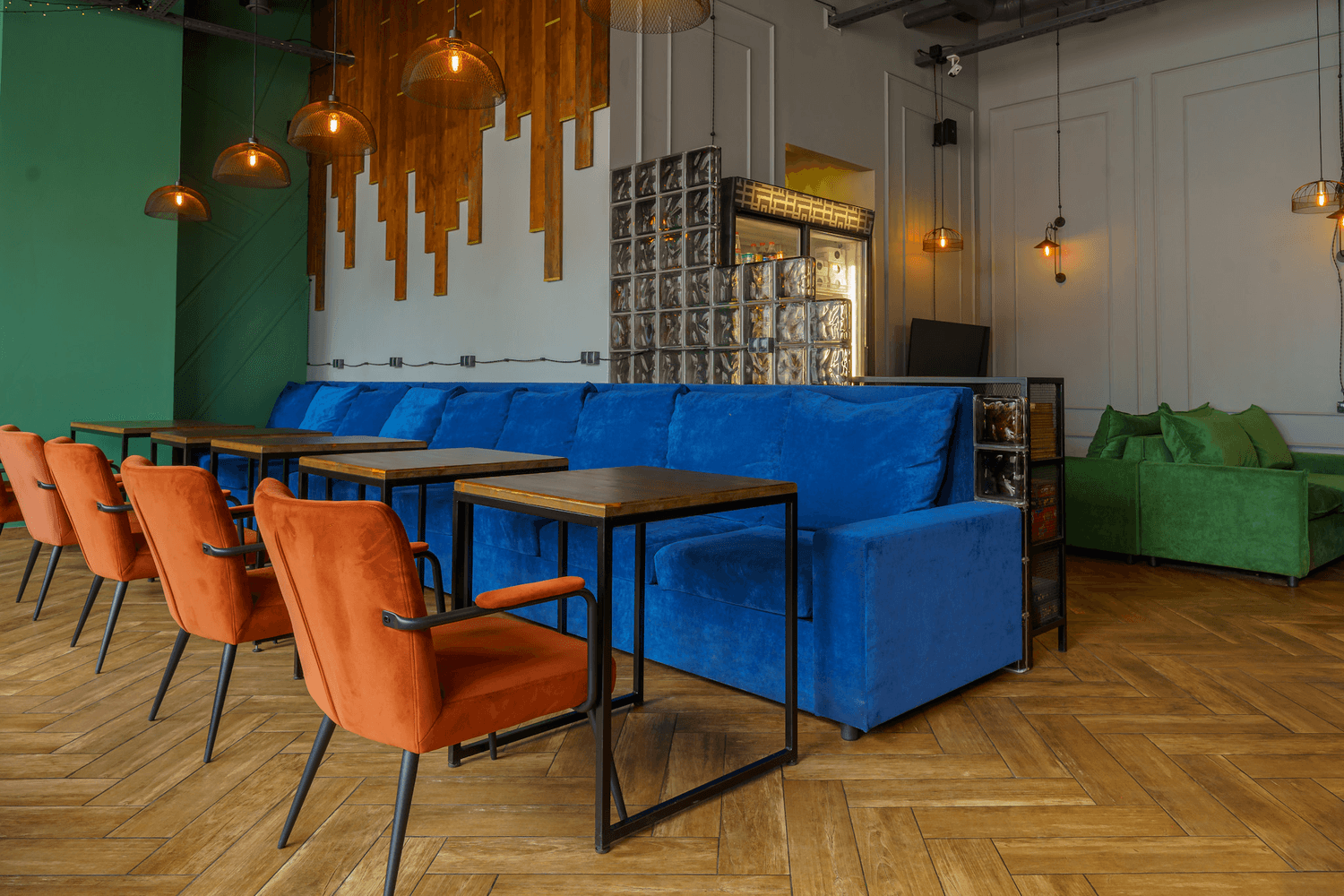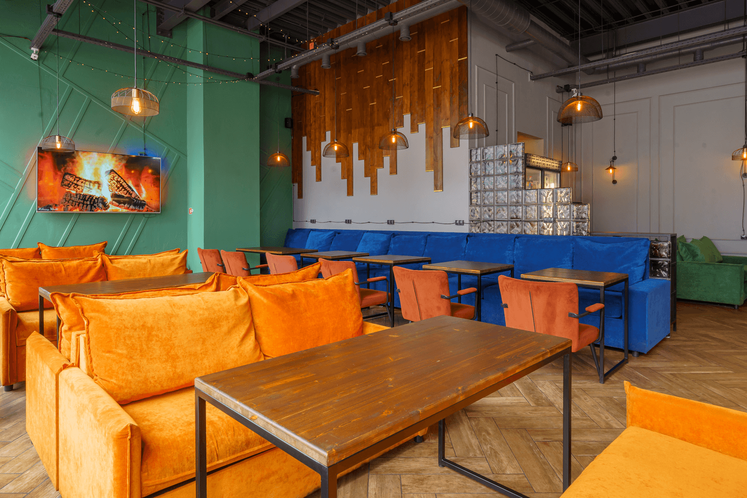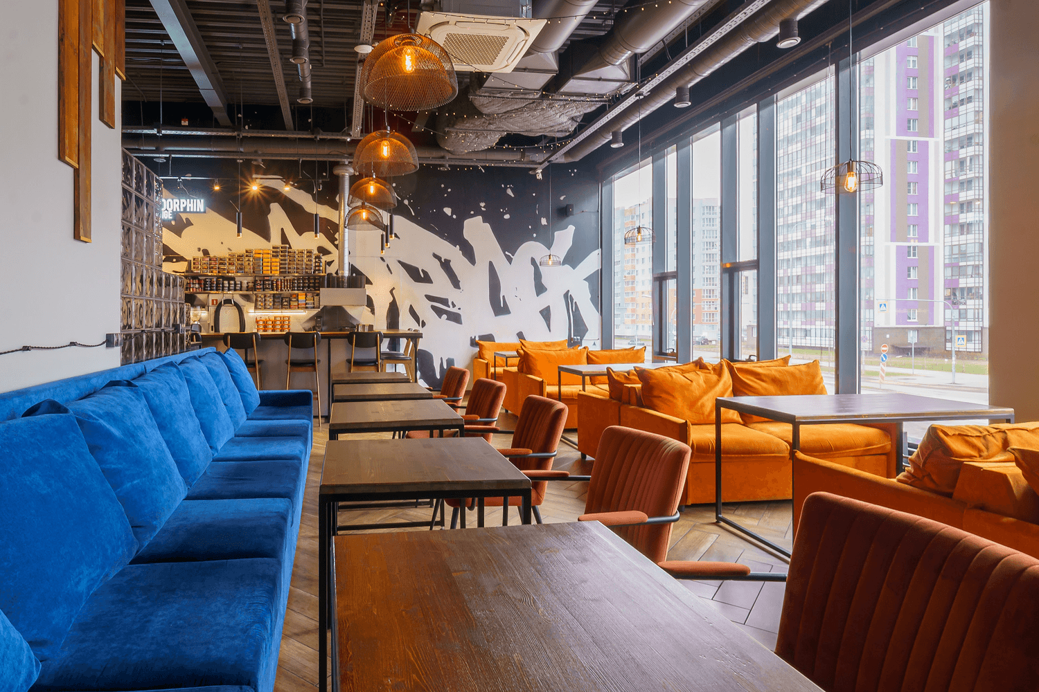 Атмосфера. Яркое пространство с синими и оранжевыми диванами и панорамными окнами. Это место, где можно расслабиться на удобном диване и поиграть в настольные игры, приставку.