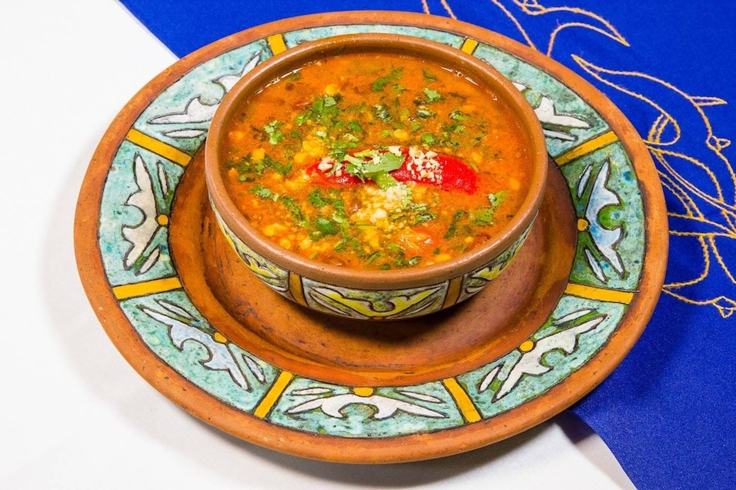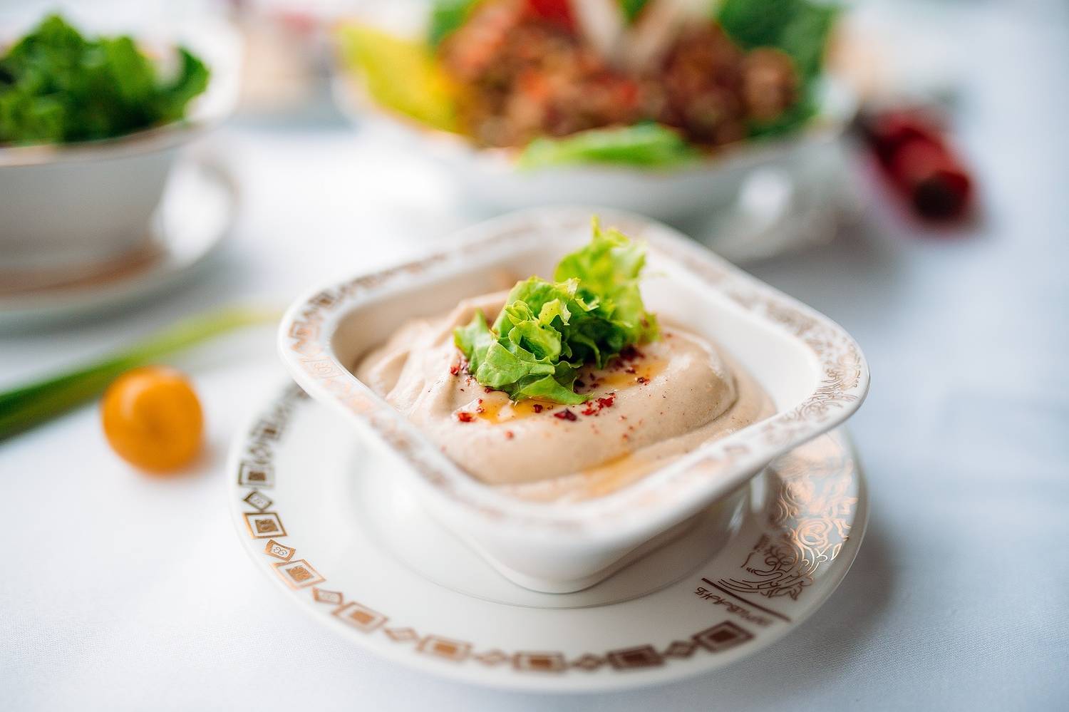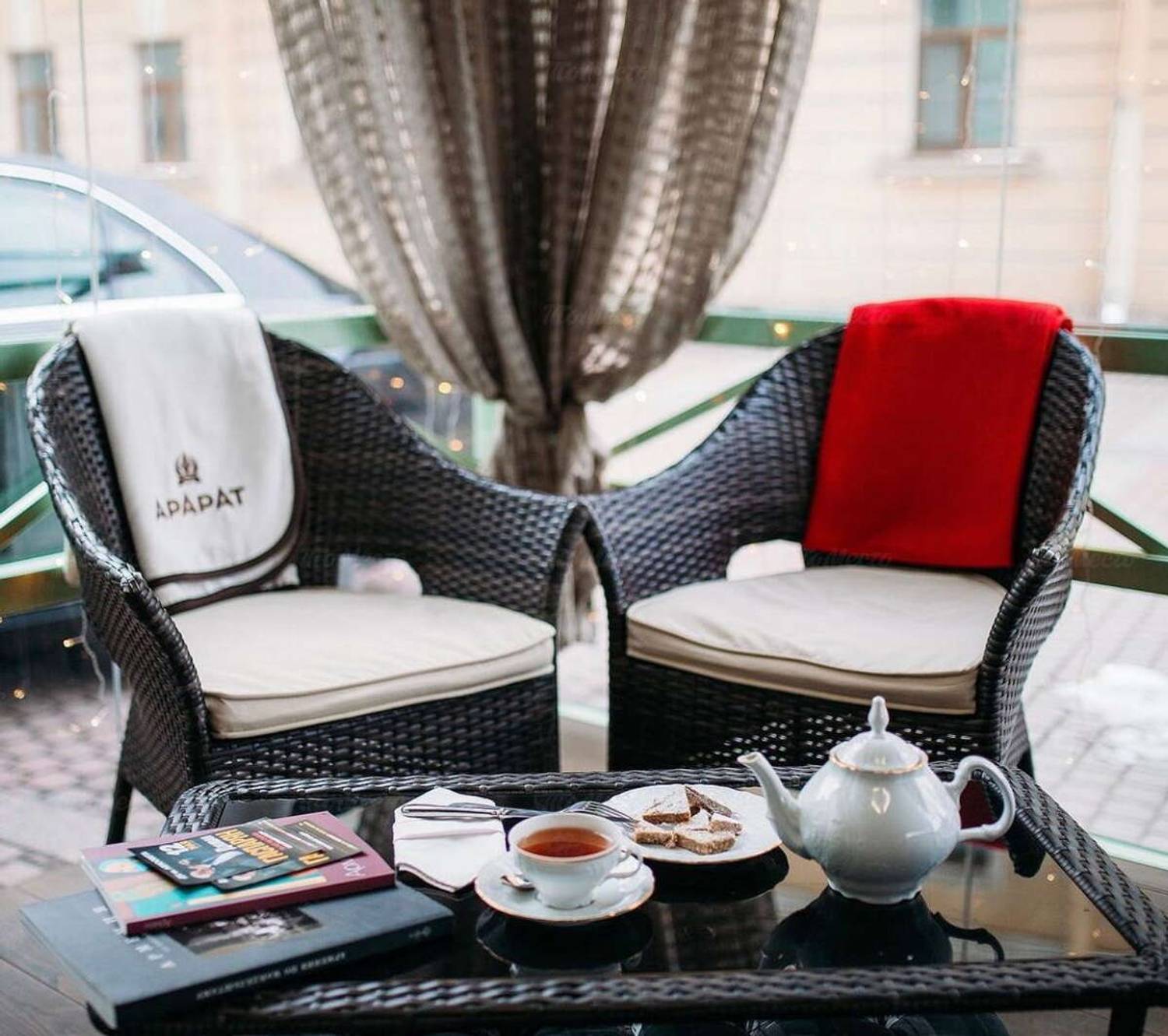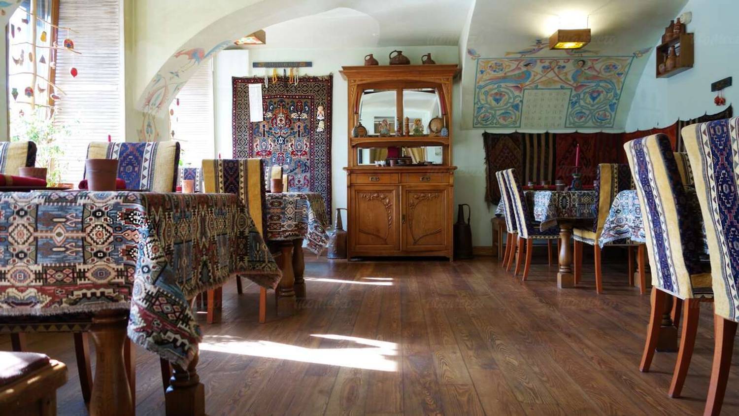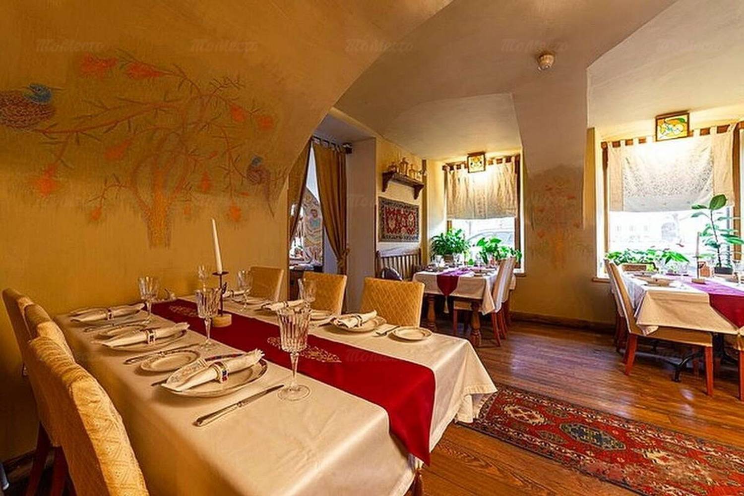 Атмосфера. Пространство разделено на три зала: этнический с коврами и глиняной посудой, классический с камином из розового туфа и VIP-зал в стиле ереванской гостиной XIX века. Каждый вечер здесь звучит живая музыка — дудук и вокал солистов Мариинского театра, многократно усиливая погружение в культуру. Благодаря общему антуражу, большому количеству света, гостеприимству хозяев и продуманным до мелочей элементам декора создается полное ощущение того, что вы выйдете из ресторана не на дождливые улицы Петербурга, а на оживленный проспект Маштоца в Ереване.