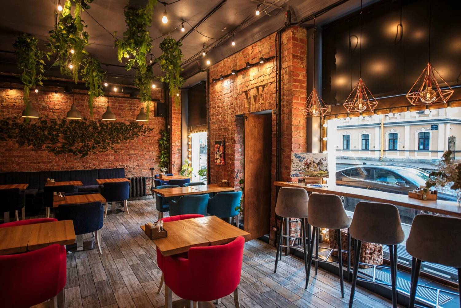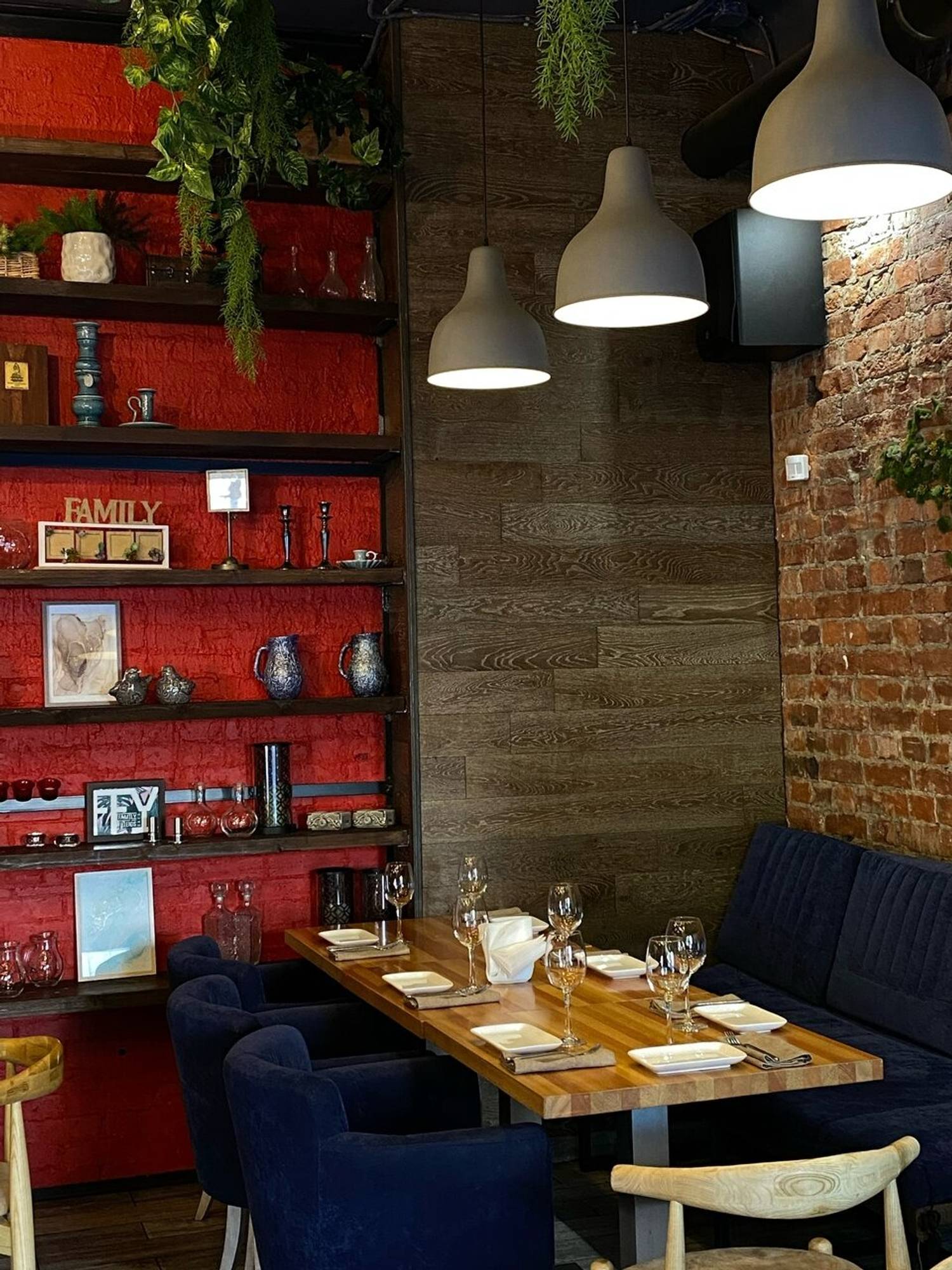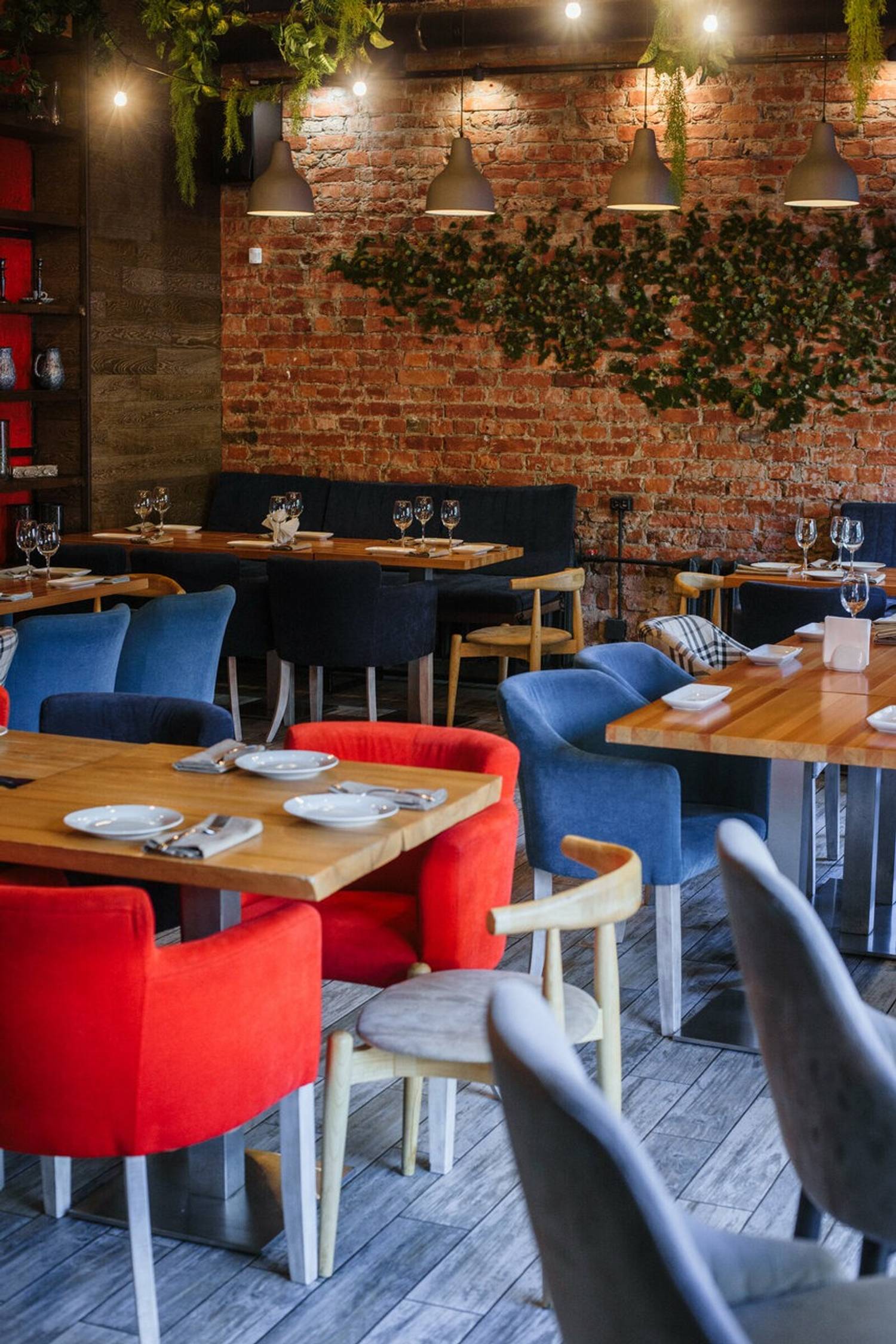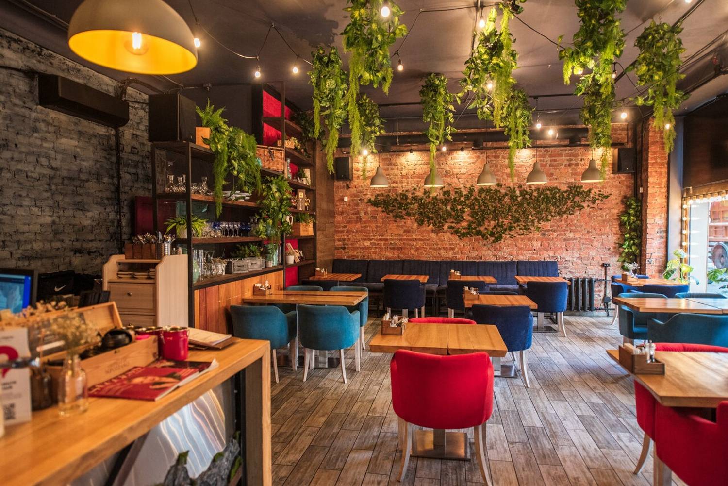 Атмосфера. Стиль с элементами лофта: кирпичная кладка, высокие столы с барными стульями. Одновременно с этим здесь видна любовь к минимализму: живые растения, гирлянды, панно из травы на стене и открытые полки с посудой и декором. Акцентами стали синие и красные мягкие стулья.