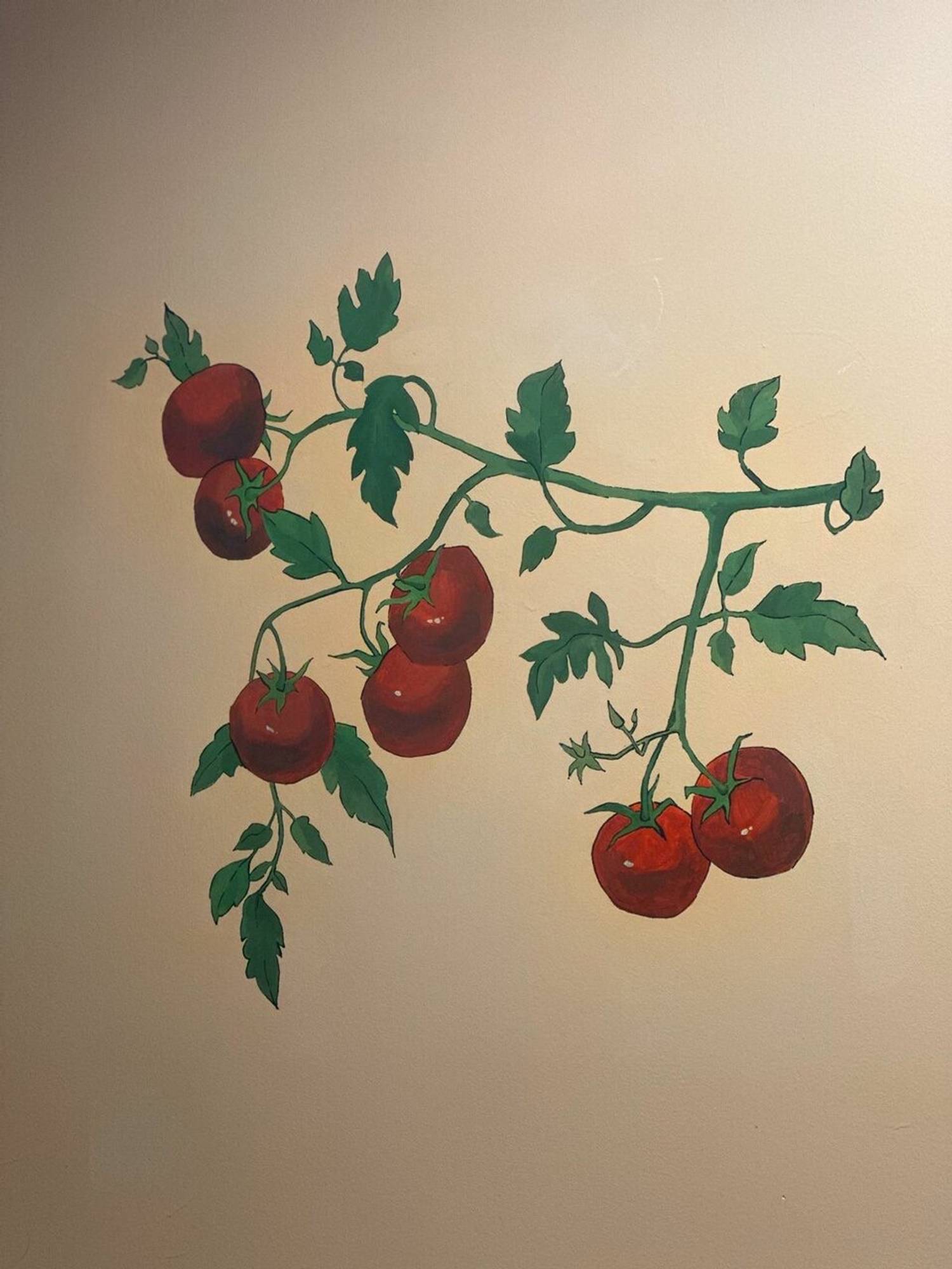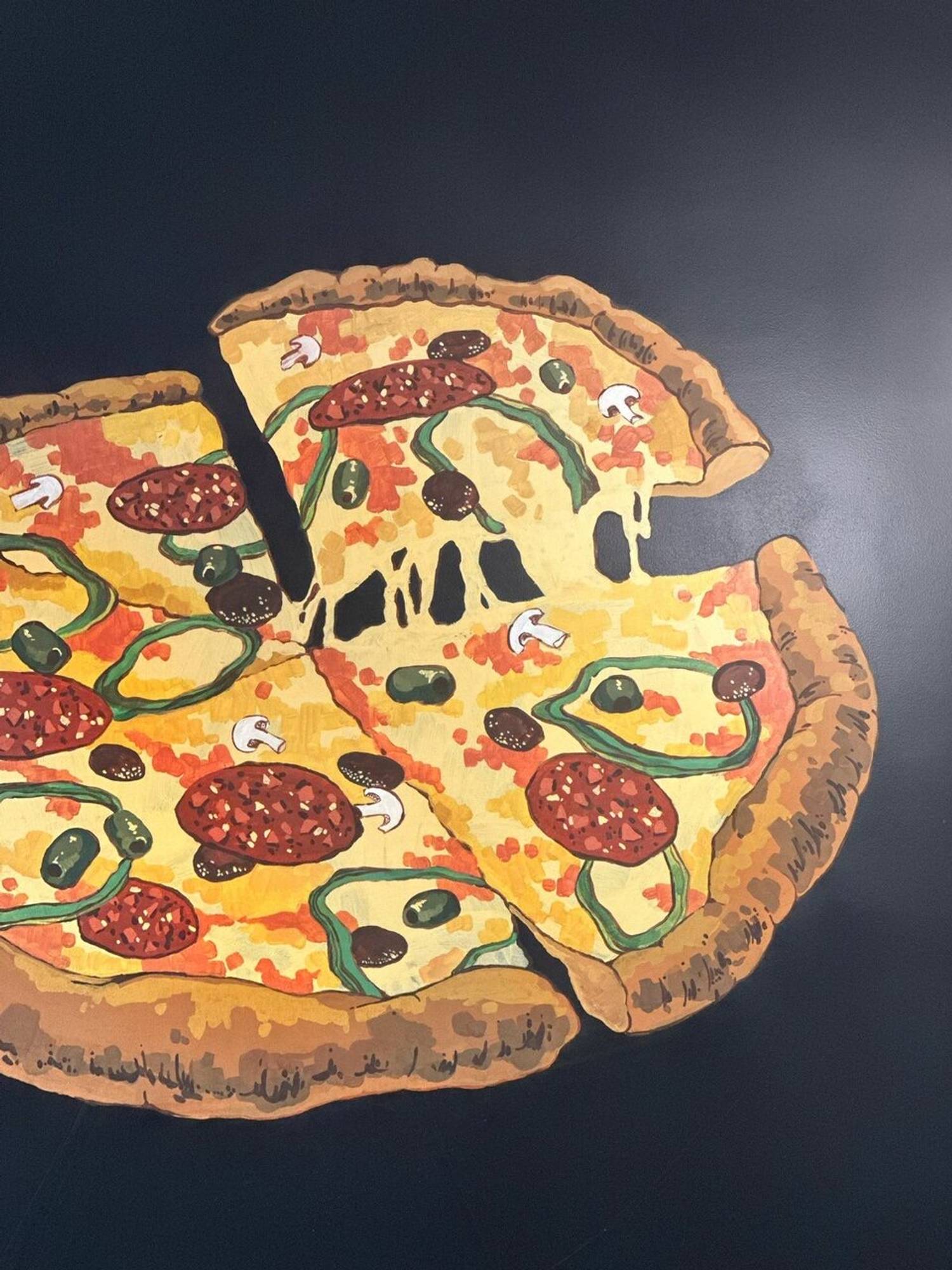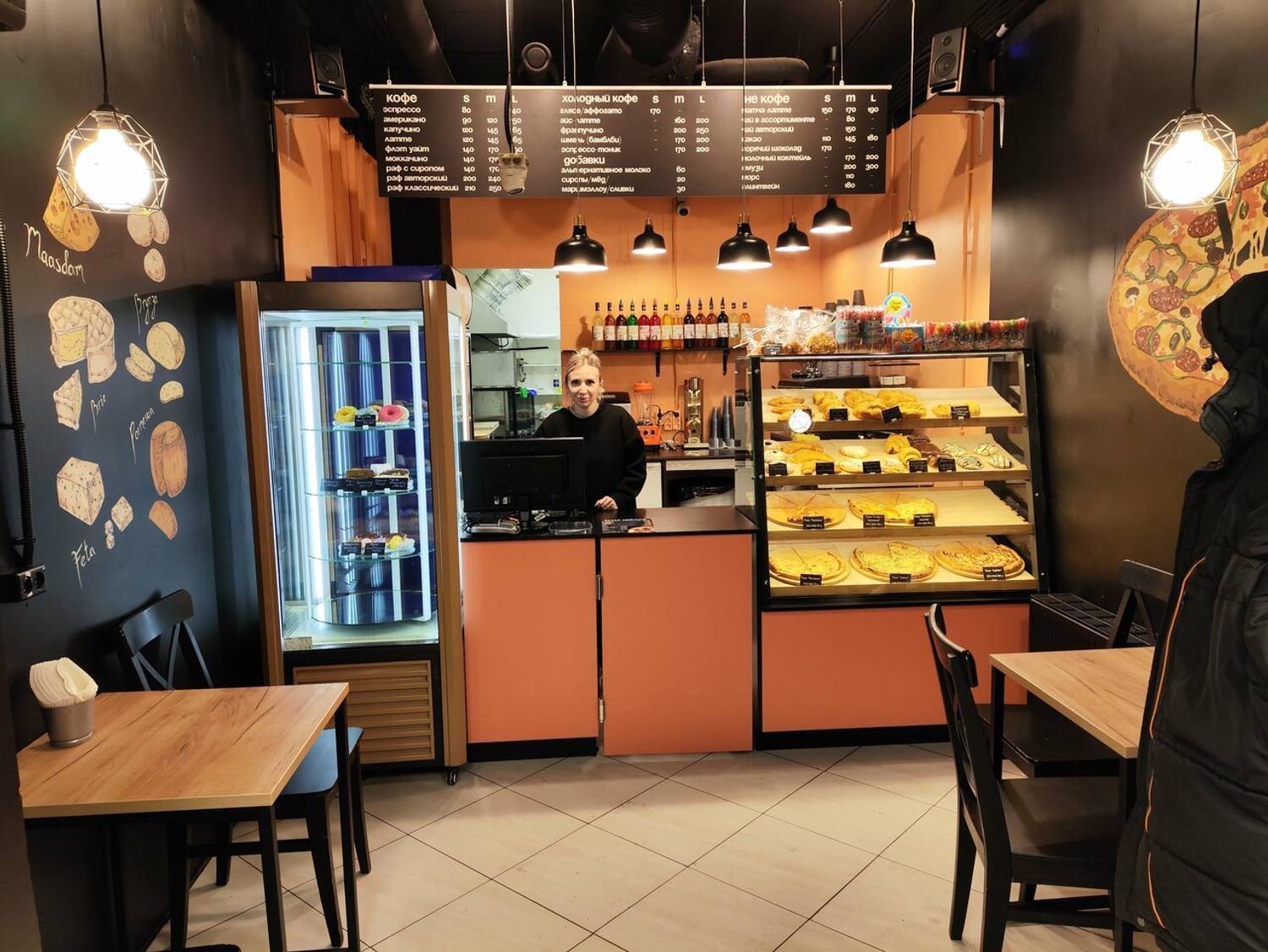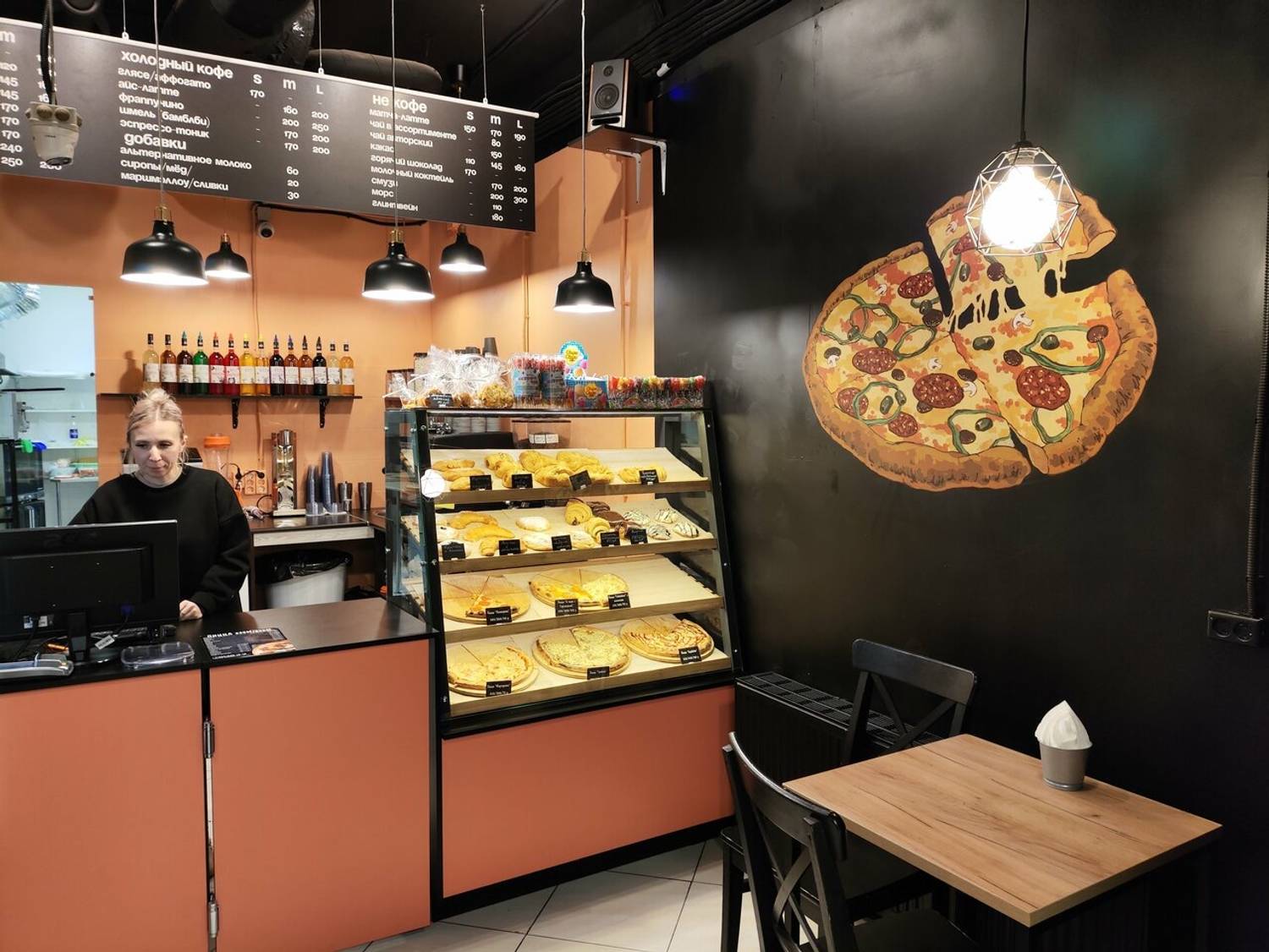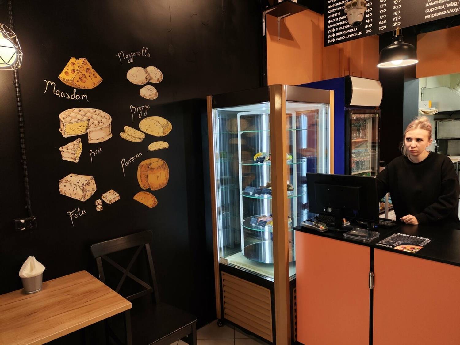 Атмосфера. Яркий акцентный дизайн: на одной стене — изображение пиццы, на другой — роспись с сырами. Высокие барные столы, черные стеганые стулья и стеклянные витрины со свежей выпечкой дополняют стильное пространство.