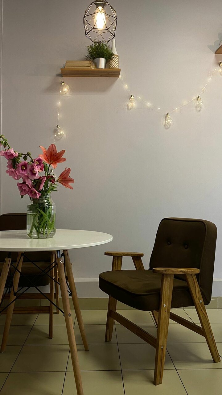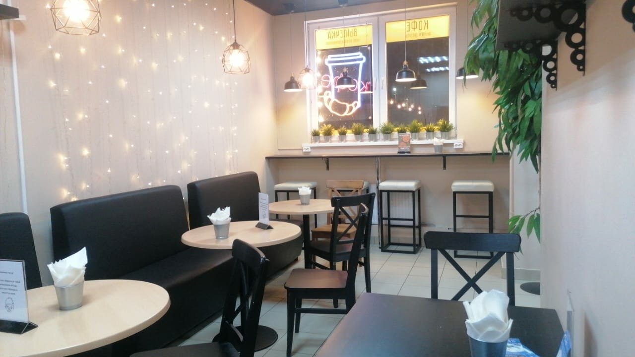 Атмосфера. Контрастный интерьер в бело-черной гамме: высокие столы у окон с белыми барными стульями, блестящая гирлянда на стене и открытая полка с книгами и зеленым растением в кадке. Детали создают сочетание современного минимализма и домашнего уюта.