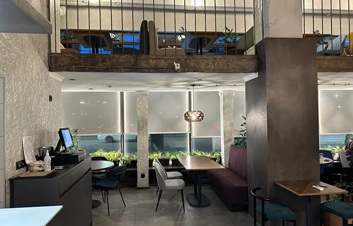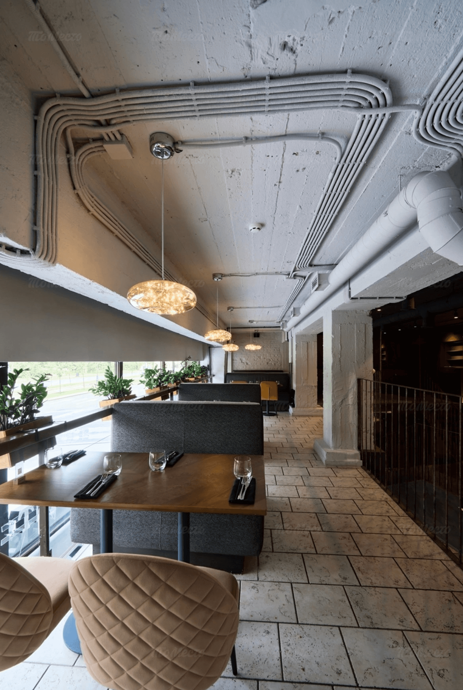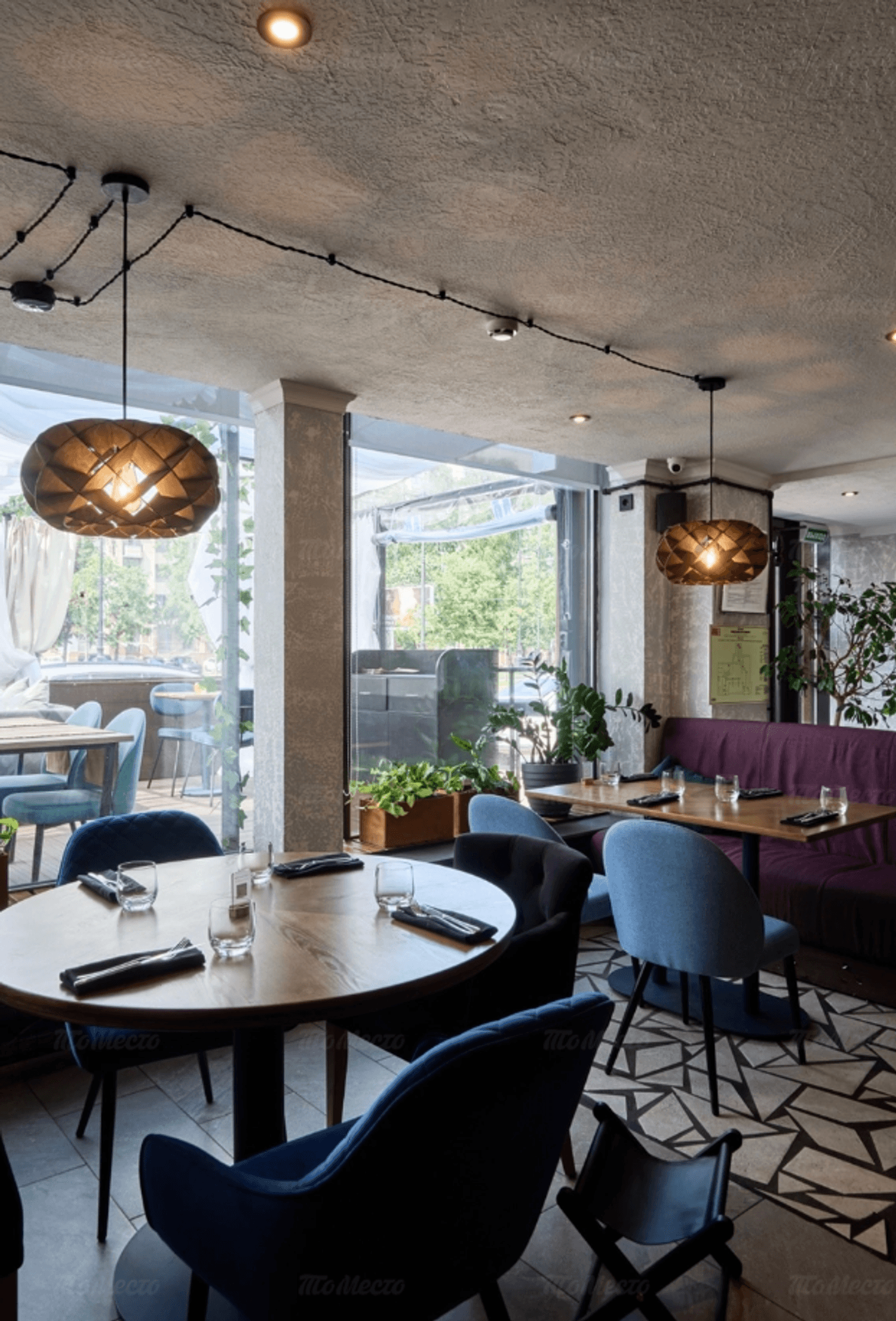 Интерьер ресторана — это два этажа, оформленные в спокойных серых и бежевых тонах. Везде натуральные материалы, стильные люстры, уютные диваны и кресла, а живые растения добавляют свежести. В ресторане можно выбрать место, подходящее для вас: будь то диван для посиделок с друзьями, столик с видом или комфортное кресло для одиночного отдыха. Барная зона оформлена светильниками, которые напоминают ветви деревьев, и создают особенную атмосферу. Музыка играет так, чтобы не мешать разговору, а только подчеркивать атмосферу.