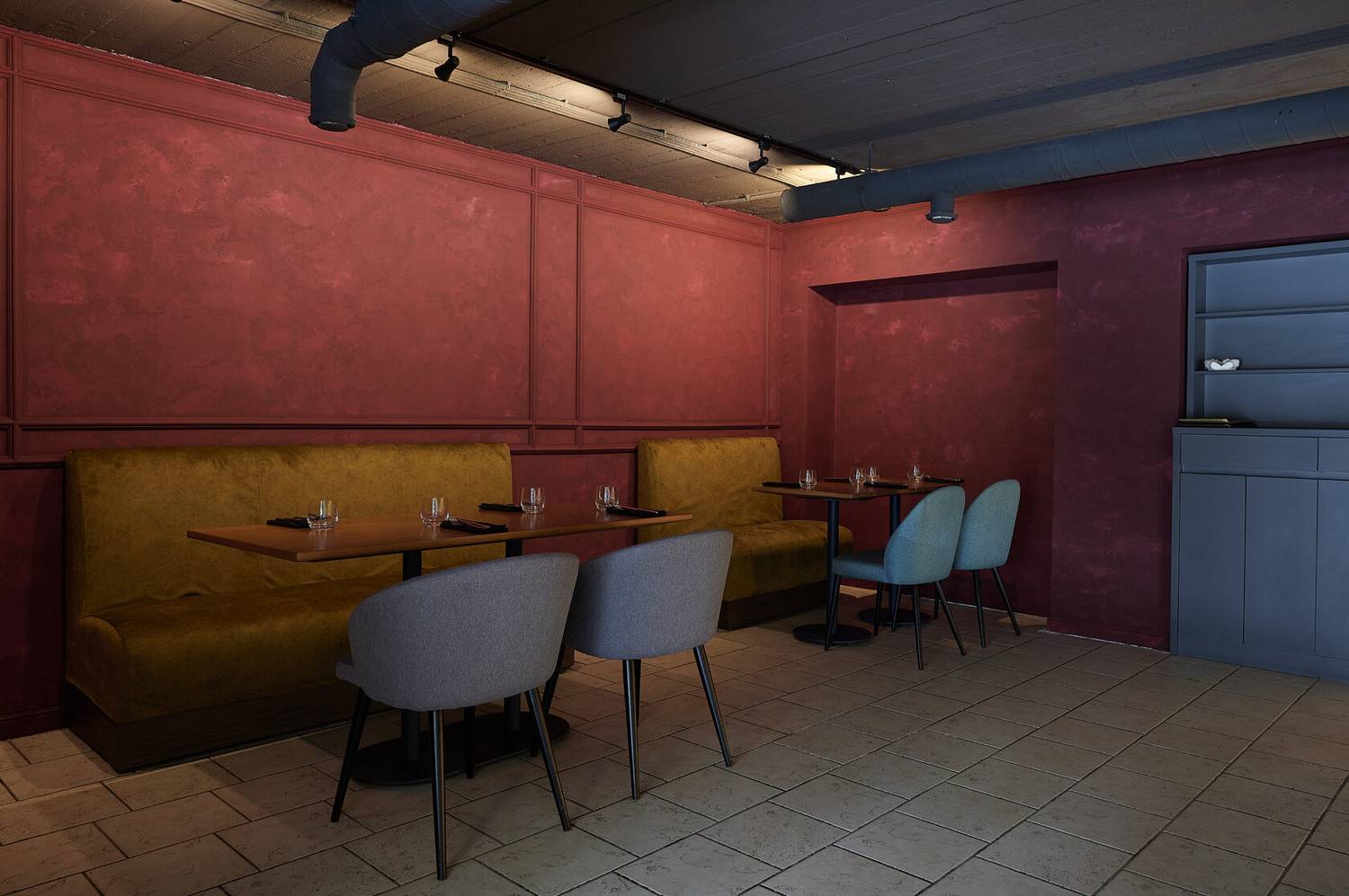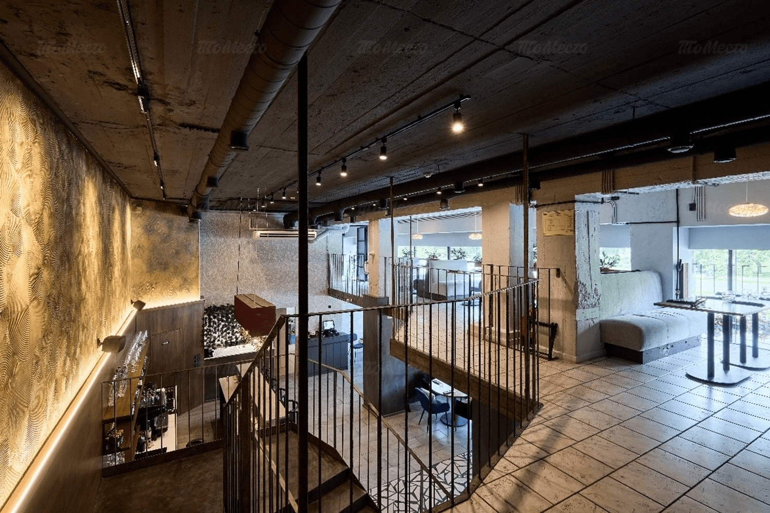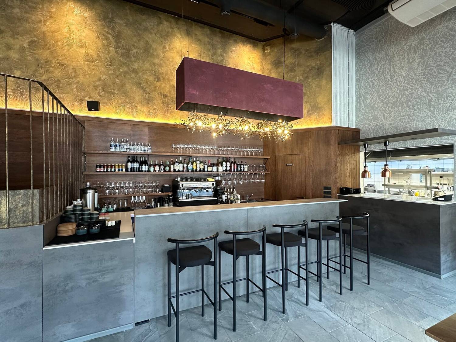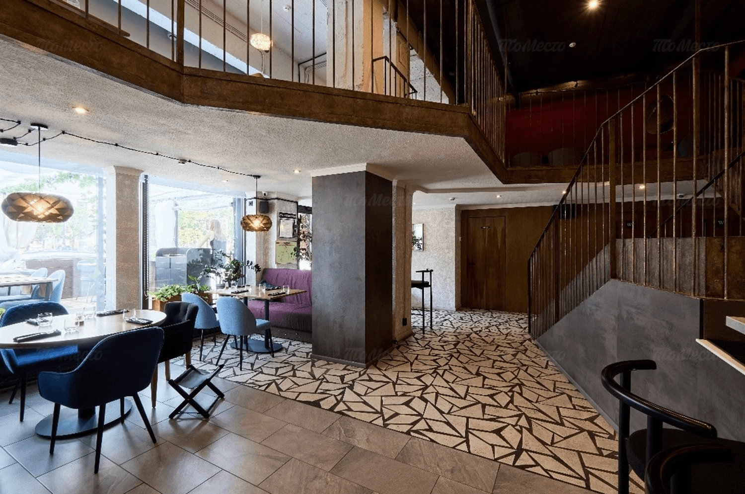 Интерьер ресторана — это два этажа, оформленные в спокойных серых и бежевых тонах. Везде натуральные материалы, стильные люстры, уютные диваны и кресла, а живые растения добавляют свежести. В ресторане можно выбрать место, подходящее для вас: будь то диван для посиделок с друзьями, столик с видом или комфортное кресло для одиночного отдыха. Барная зона оформлена светильниками, которые напоминают ветви деревьев, и создают особенную атмосферу. Музыка играет так, чтобы не мешать разговору, а только подчеркивать атмосферу.
