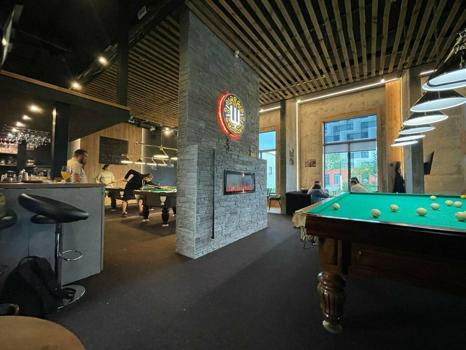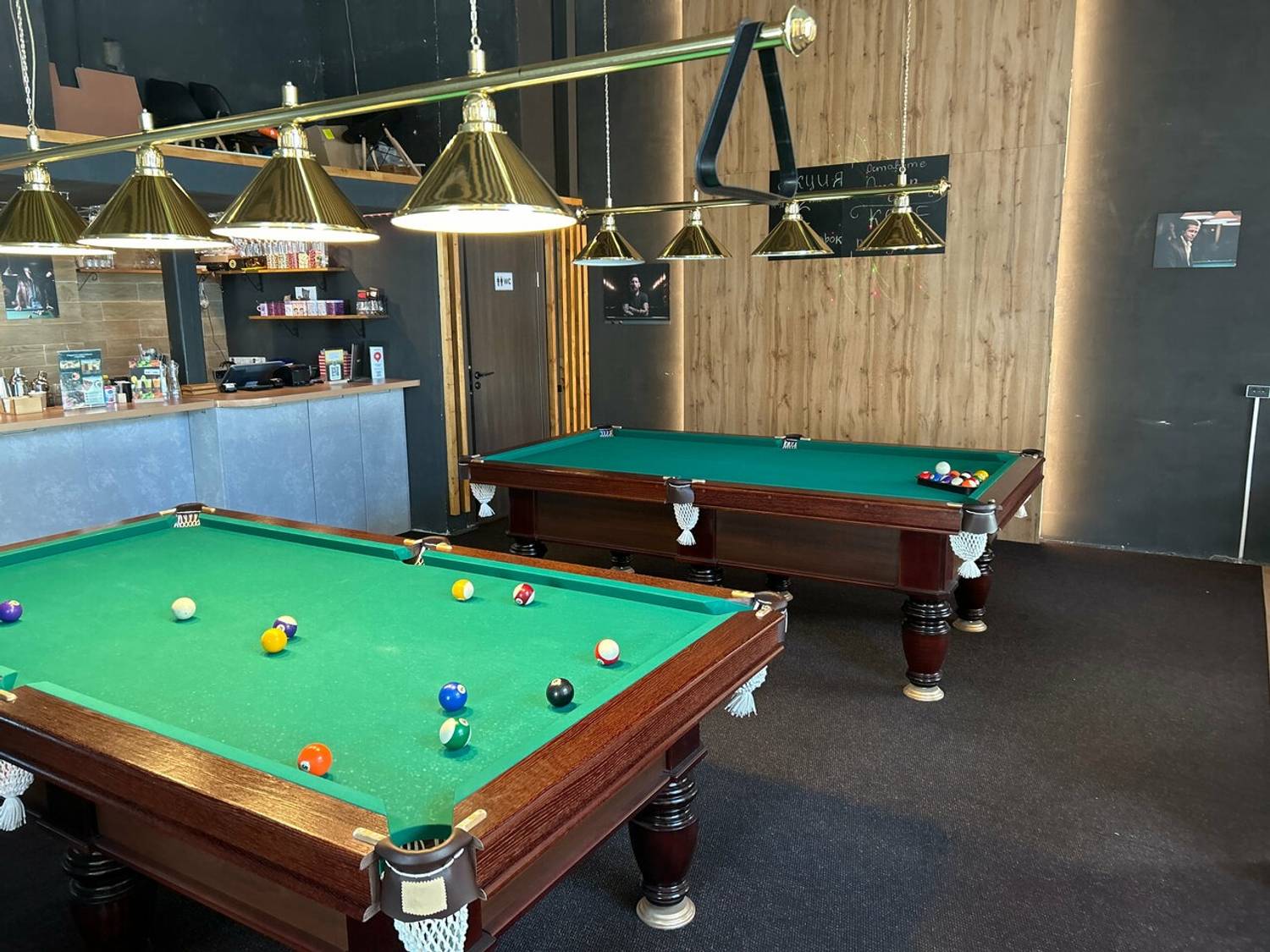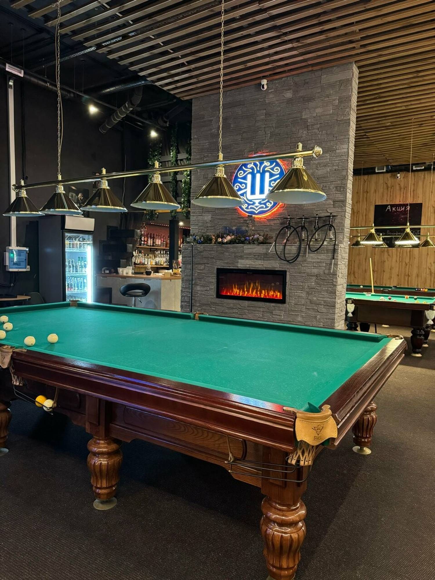 Атмосфера. Здесь три профессиональных стола один для русского бильярда и два для пула с качественным сукном и подборкой киев, просторные диваны для зрителей и отдельная зона с настольными играми. Приглушенный свет и фоновая музыка создают комфортную среду для вечера в кругу друзей.