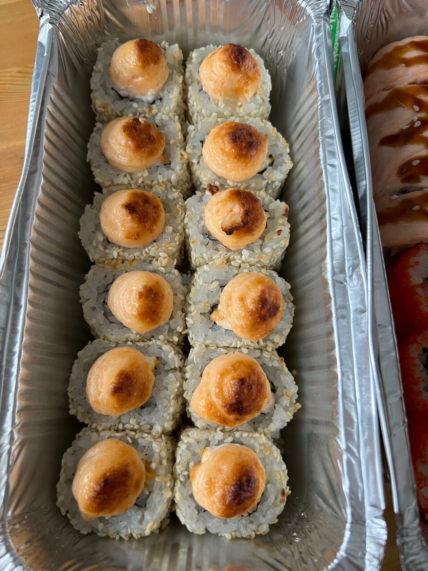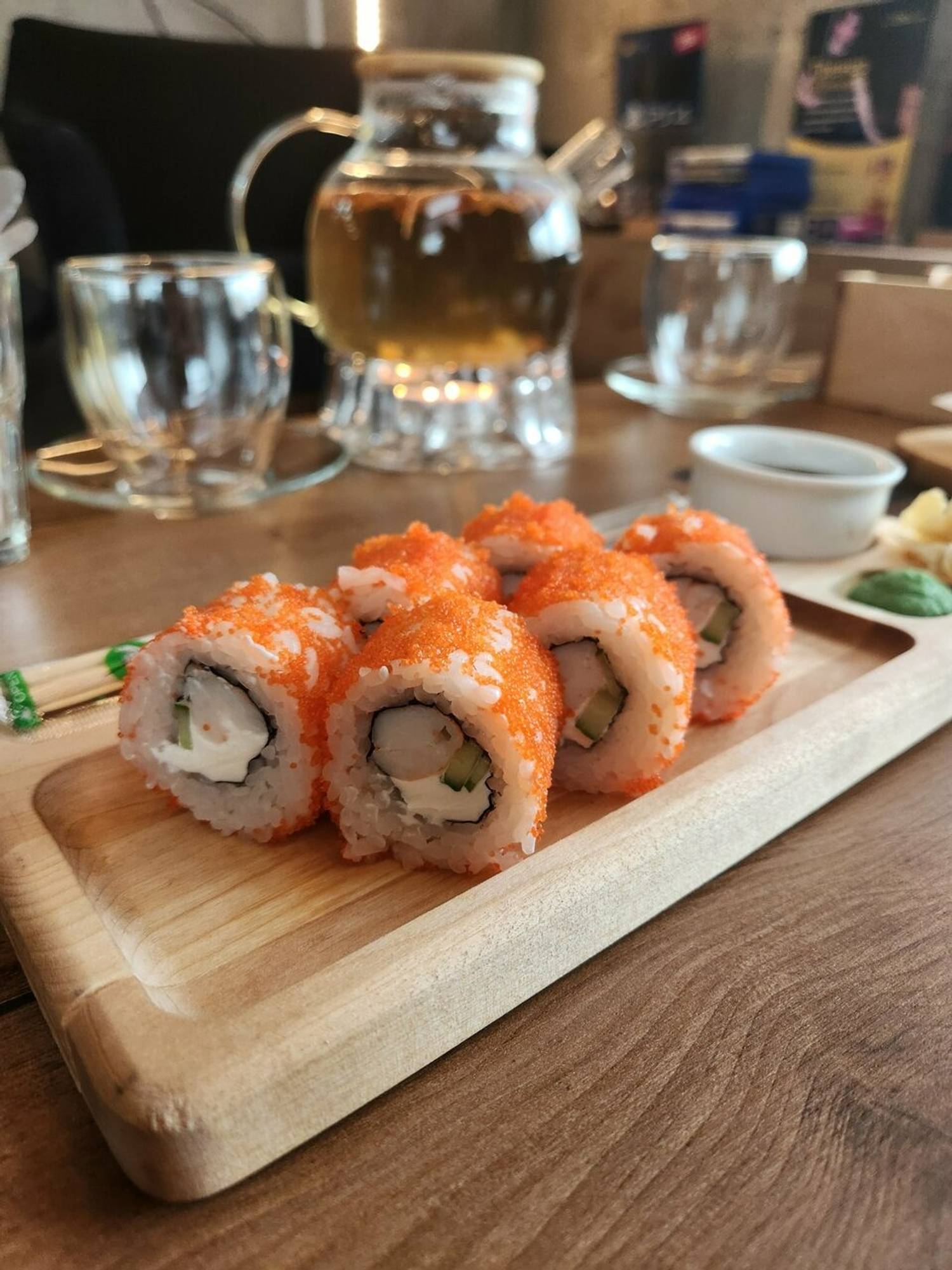 Еда и напитки. В меню — классические и запеченные роллы: Филадельфия люкс, калифорния с креветкой, бонито с тунцом, гункан с крабом, горячий с ананасом и пицца-ролл.