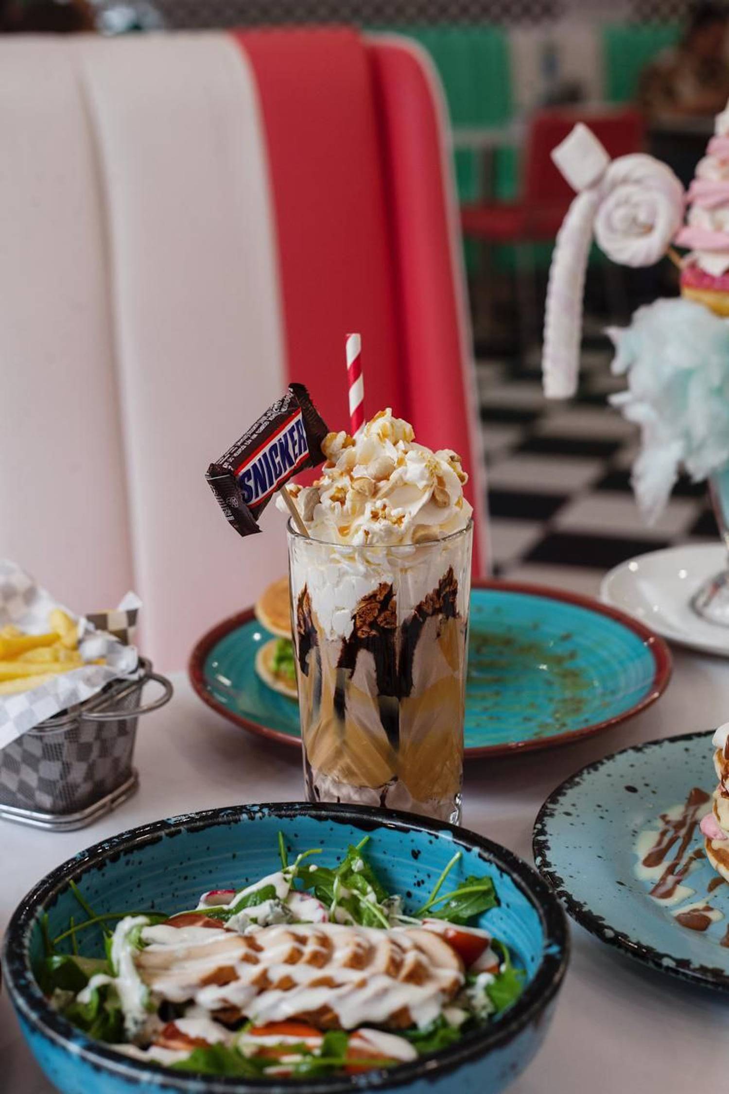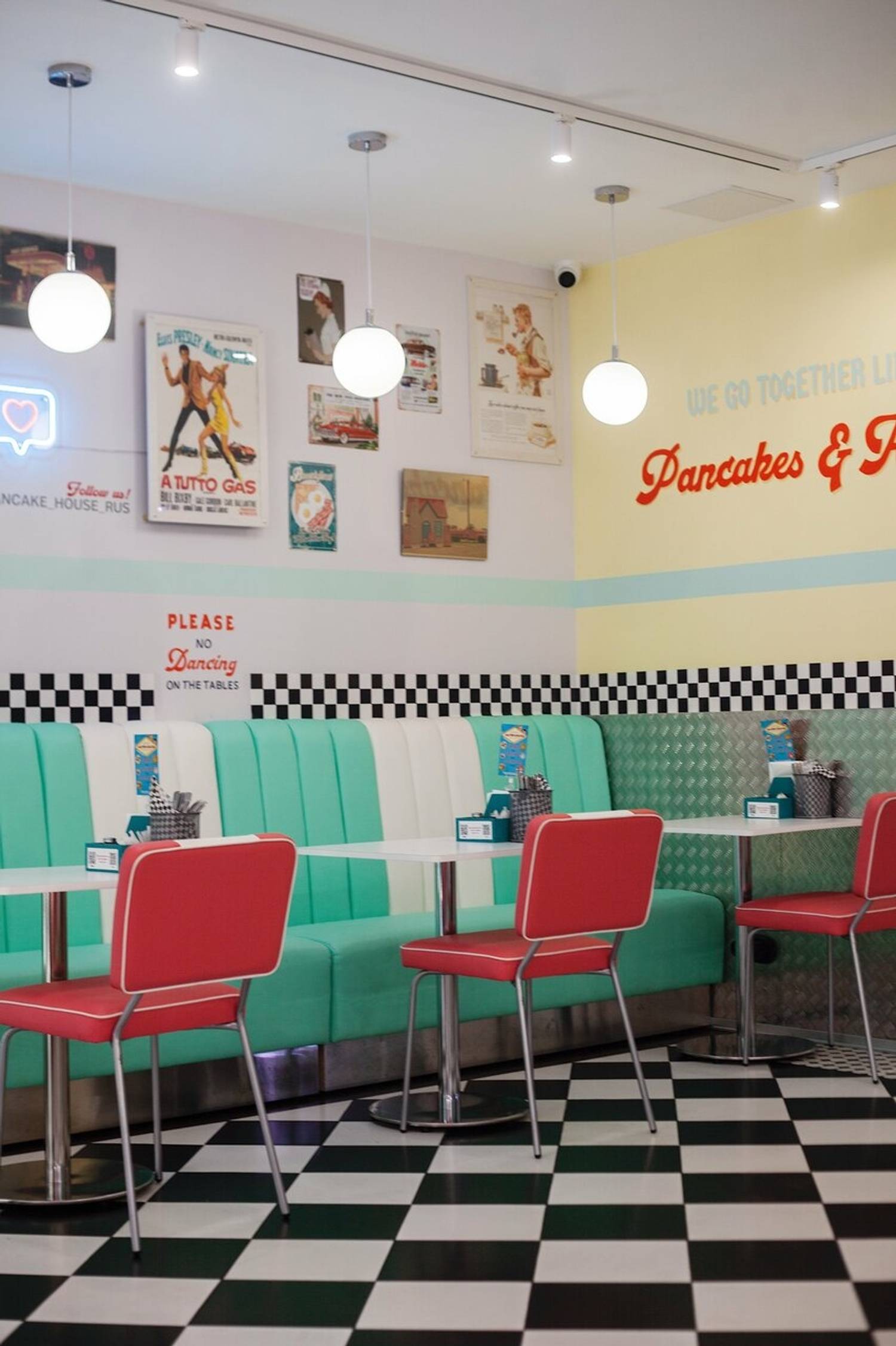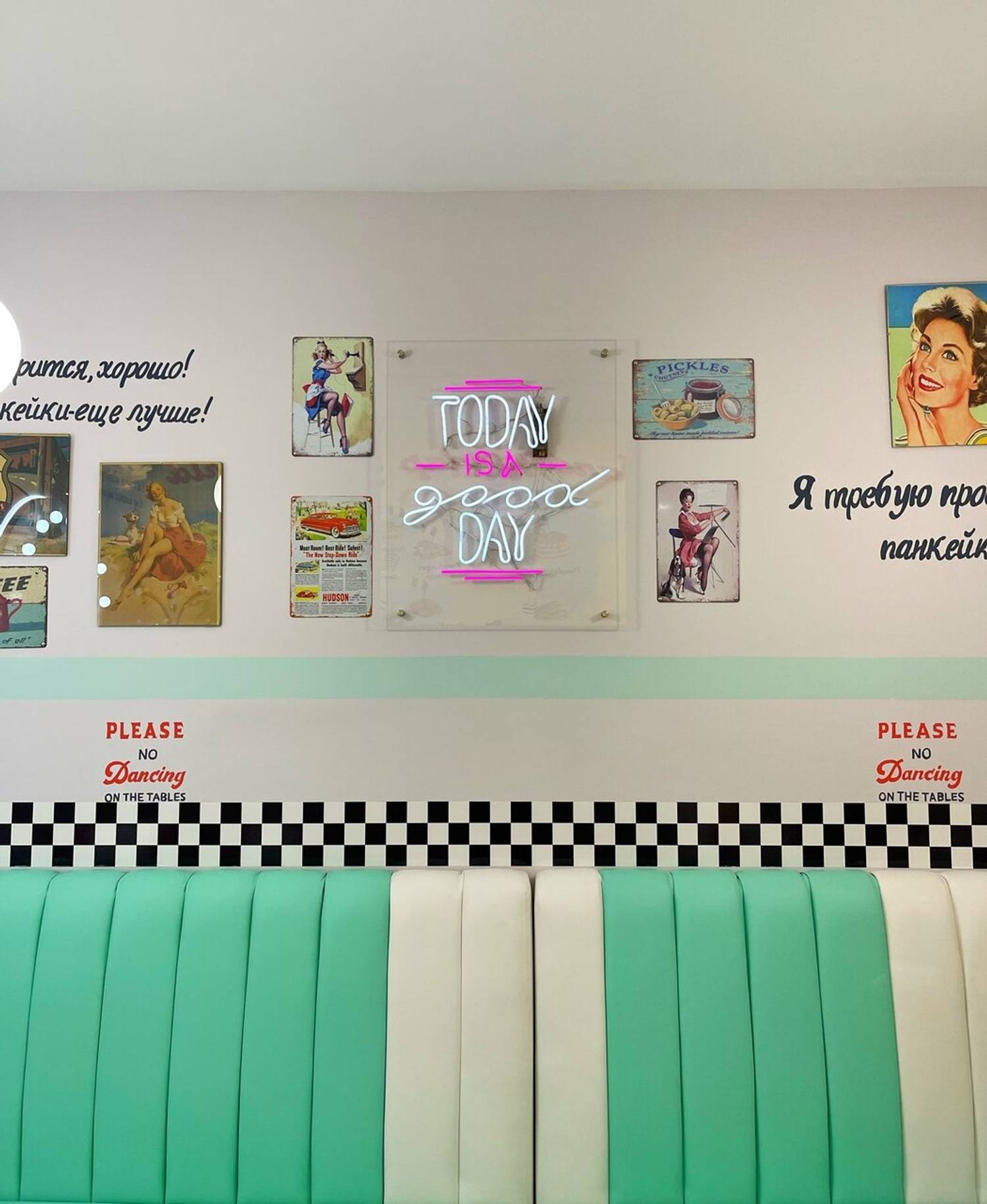Атмосфера. Яркие неоновые вывески, винтажная стойка и сиденья в стиле ретро-автомобилей создают атмосферу классической придорожной закусочной, которую все хоть раз видели в фильмах. Динамичная музыка, открытая кухня и яркие, словно с картинки, блюда — все это добавляет ощущения того, что вы находитесь в кино.