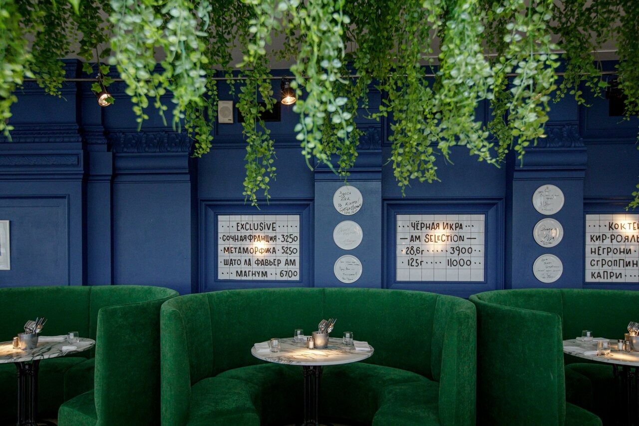 Атмосфера. Сдержанный современный стиль с изумрудной и синей мебелью. Серые круглые столбы под мрамор дополняют элегантный интерьер. В центтре внимания барная стойка и открытая кухня с дровяной печью Forni Valoriani. Панорамные окна открывают вид на Неву, а для детей по выходным работает игровая комната с няней.