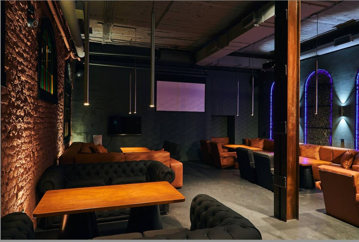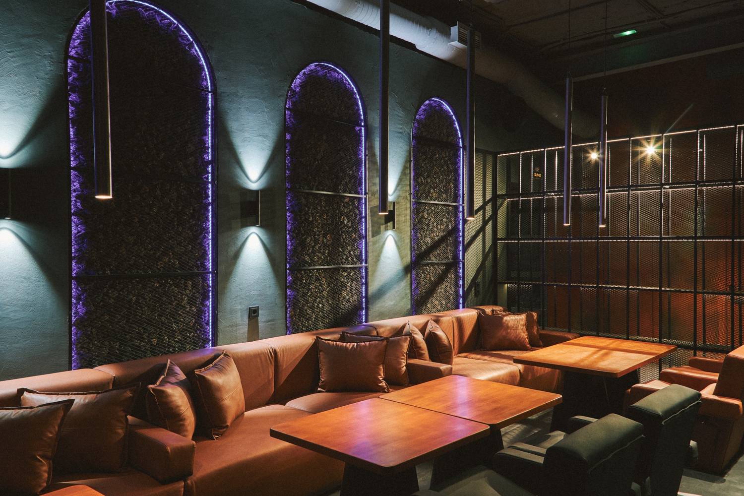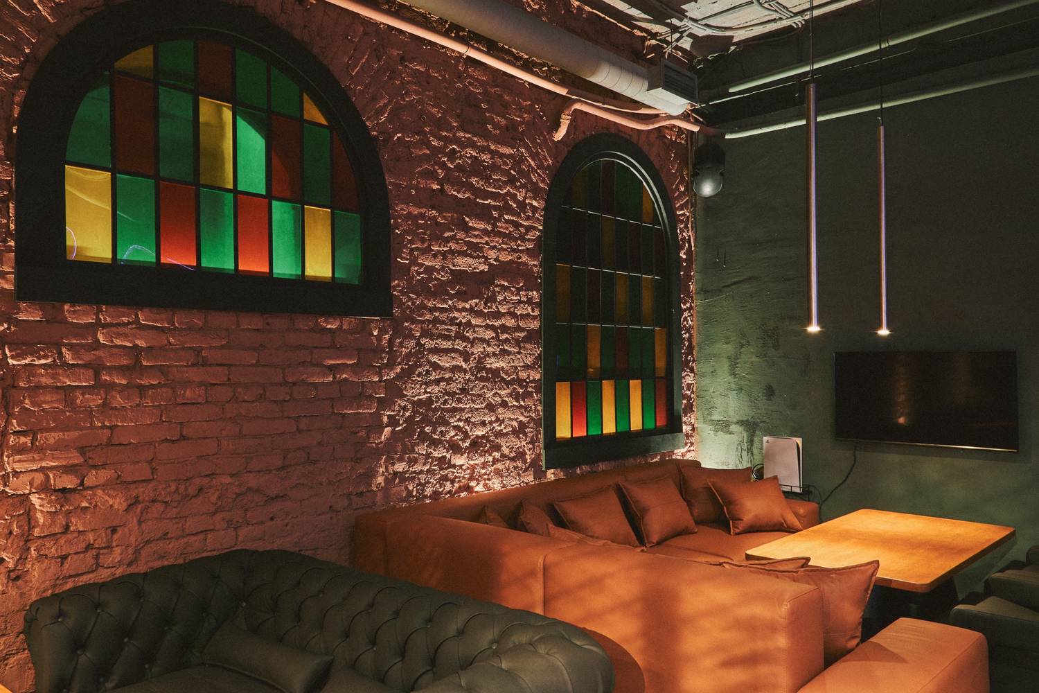 Атмосфера. Внутри арочные своды на стенах с синей подсветкой, живыми и мягкие диваны. Для развлечений собрали целую полку с настольными играми.
