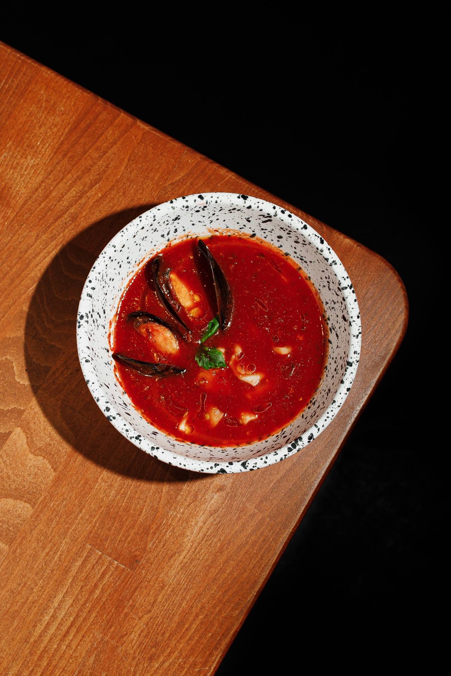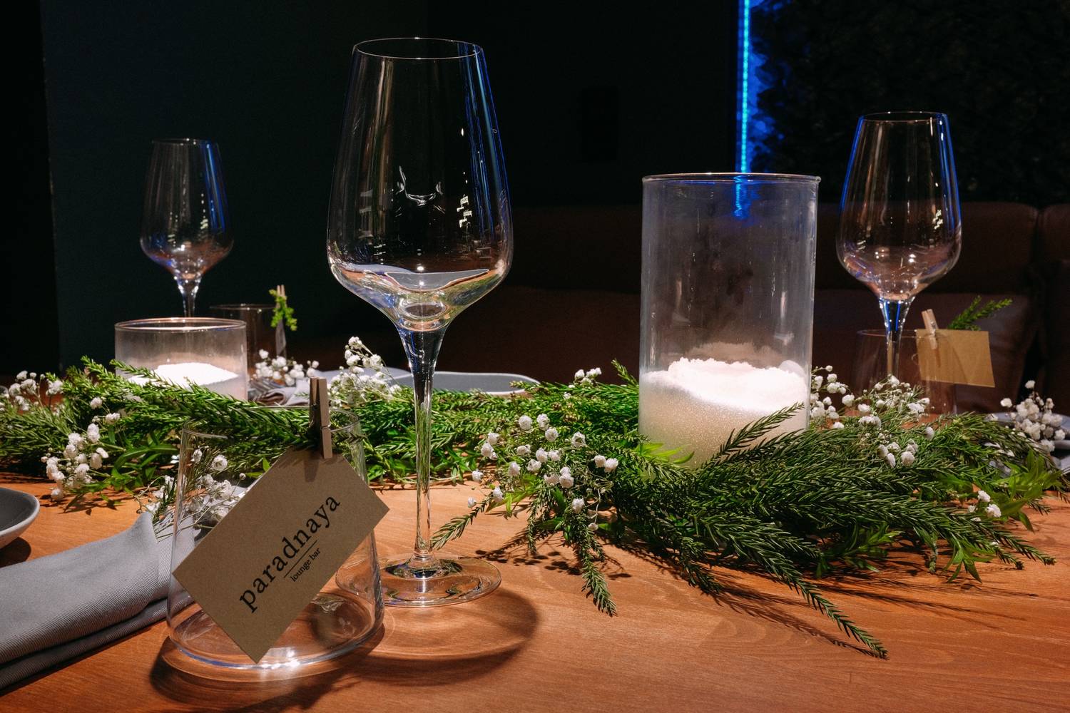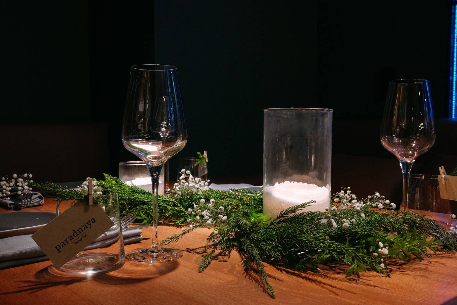 Еда и напитки. В меню — салат с грушей и горгонзолой, свекольник, ньокки с кальмаром, шаверма с креветками. Среди напитков —, авторские и классические коктейли, китайские и травяные чаи. Также есть кальяны на ананасовой, гранатовой и грейпфрутовой чашах.