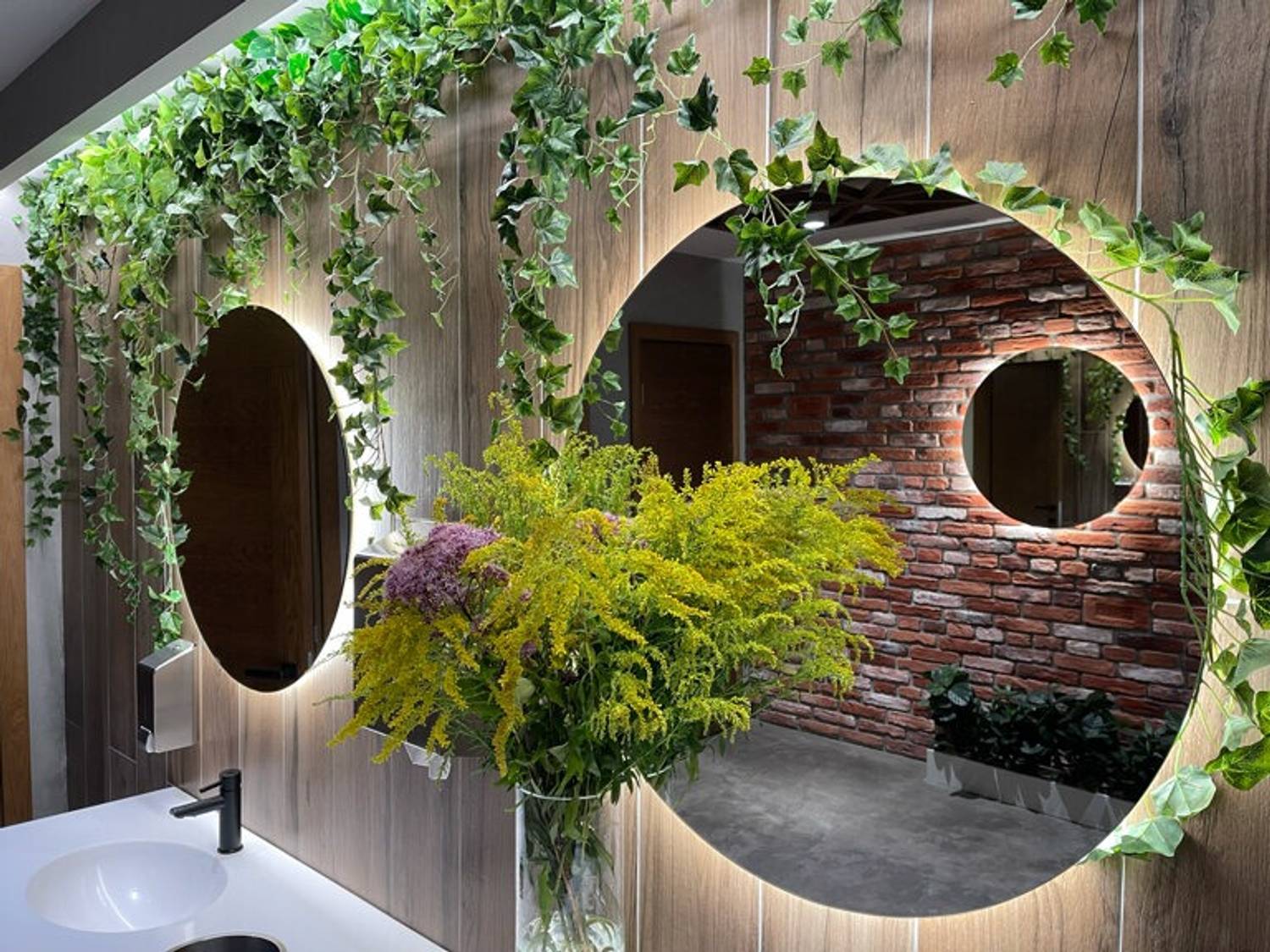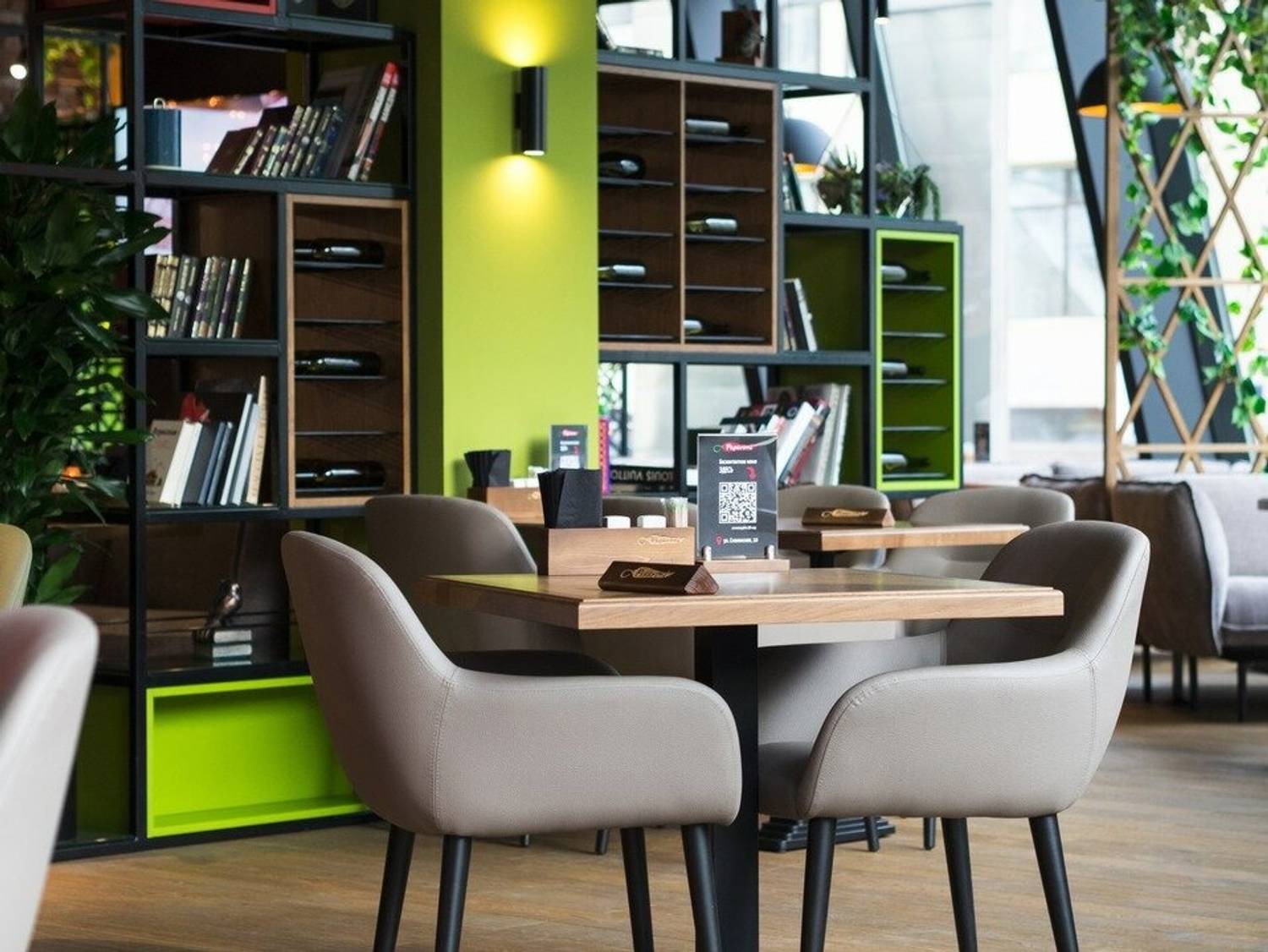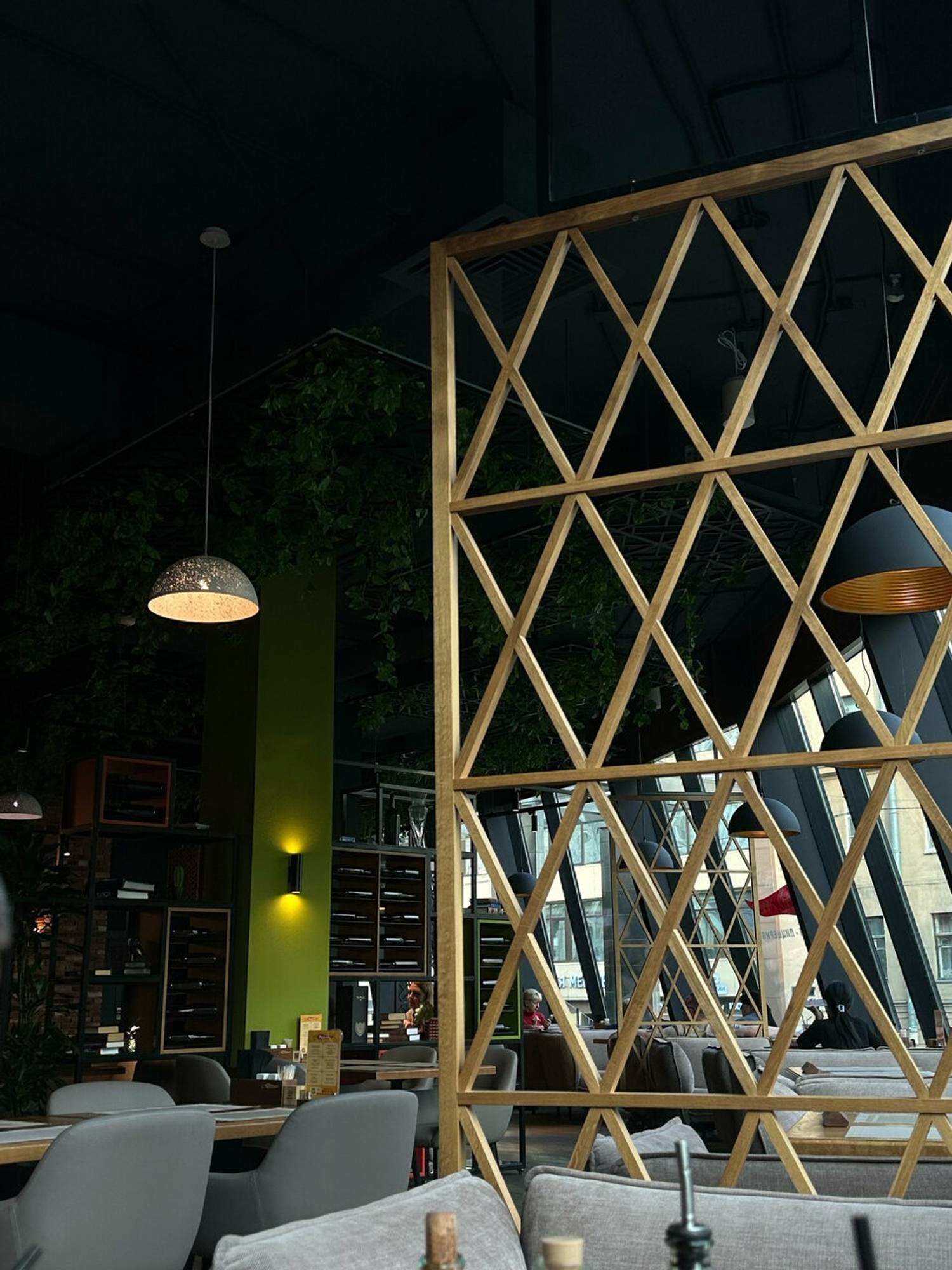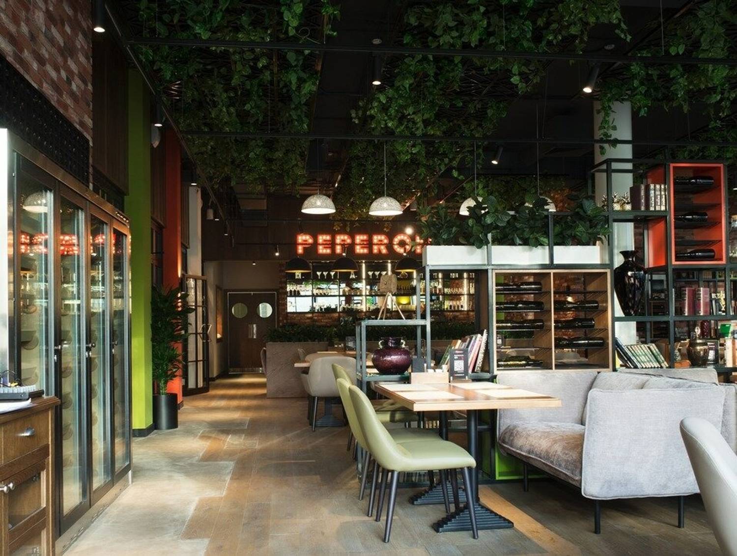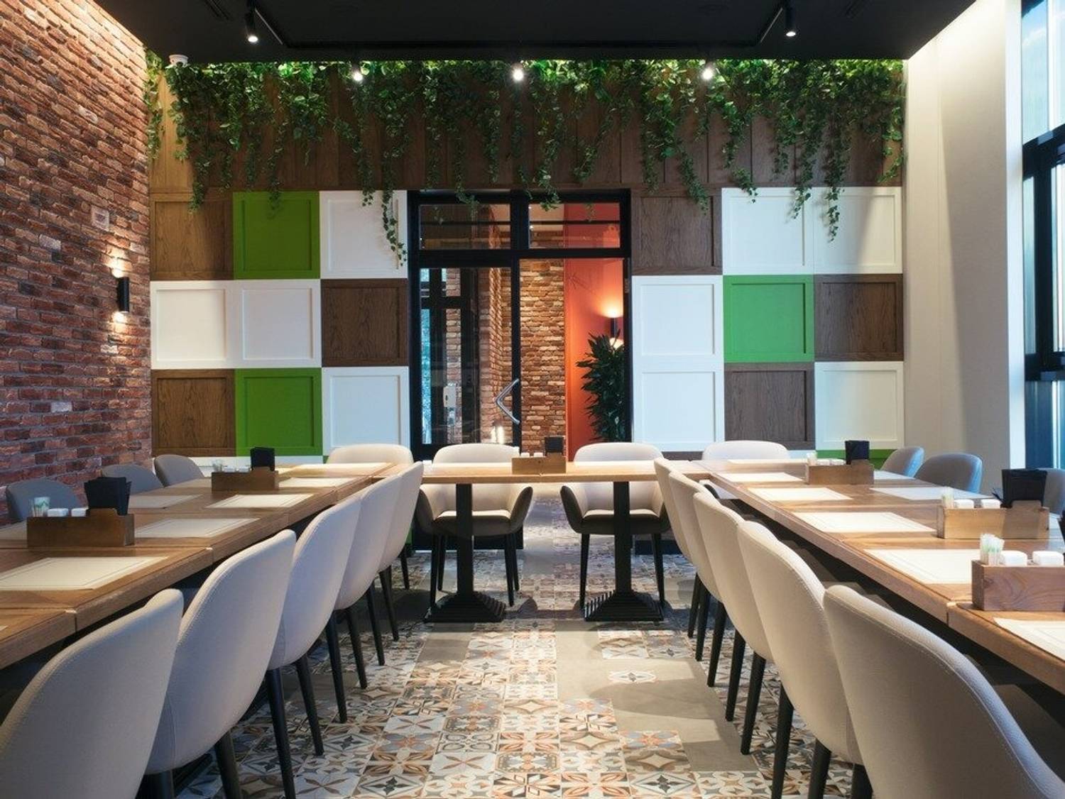Атмосфера. Ресторан со светлым залом в стиле лофт и большими окнами. Зеленые и красные колонны, стена из бело-зеленых плит, свисающие тропические растения и мягкое освещение круглых зеркал создают ощущение уединенного сада в сердце города.