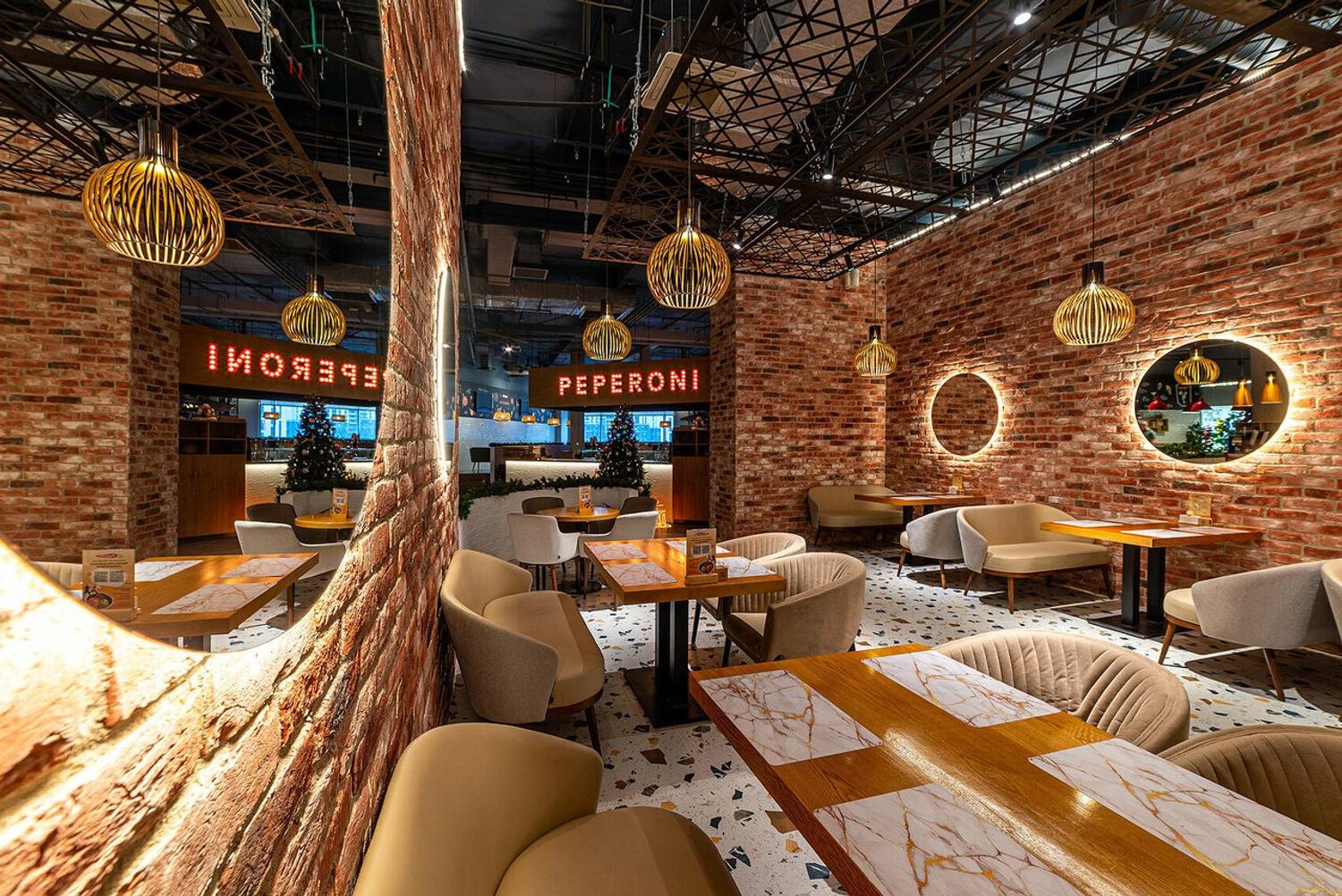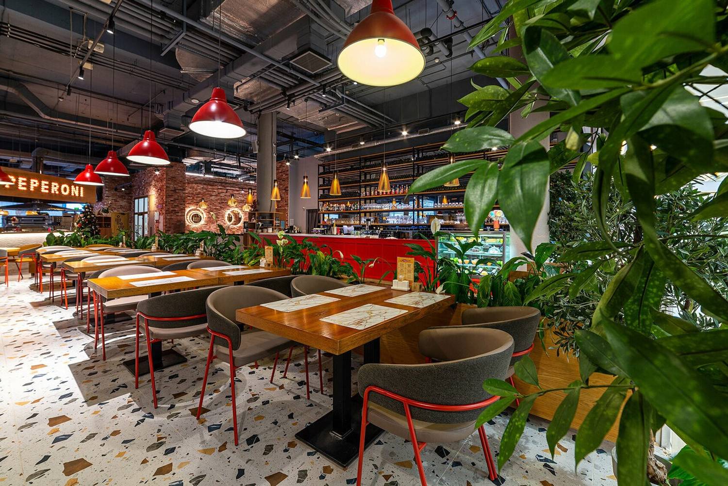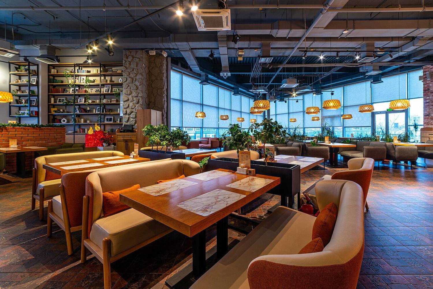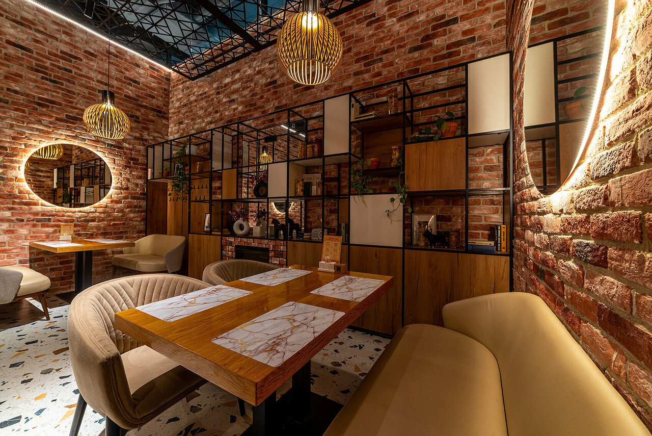 Атмосфера. Пространство, в котором индустриальный лофт встречается с уютом: кирпичные стены, деревянные детали и стекло создают многослойный интерьер, а зелень и дизайнерские светильники добавляют тепла. В центре зала — открытая кухня, где можно наблюдать за работой поваров.