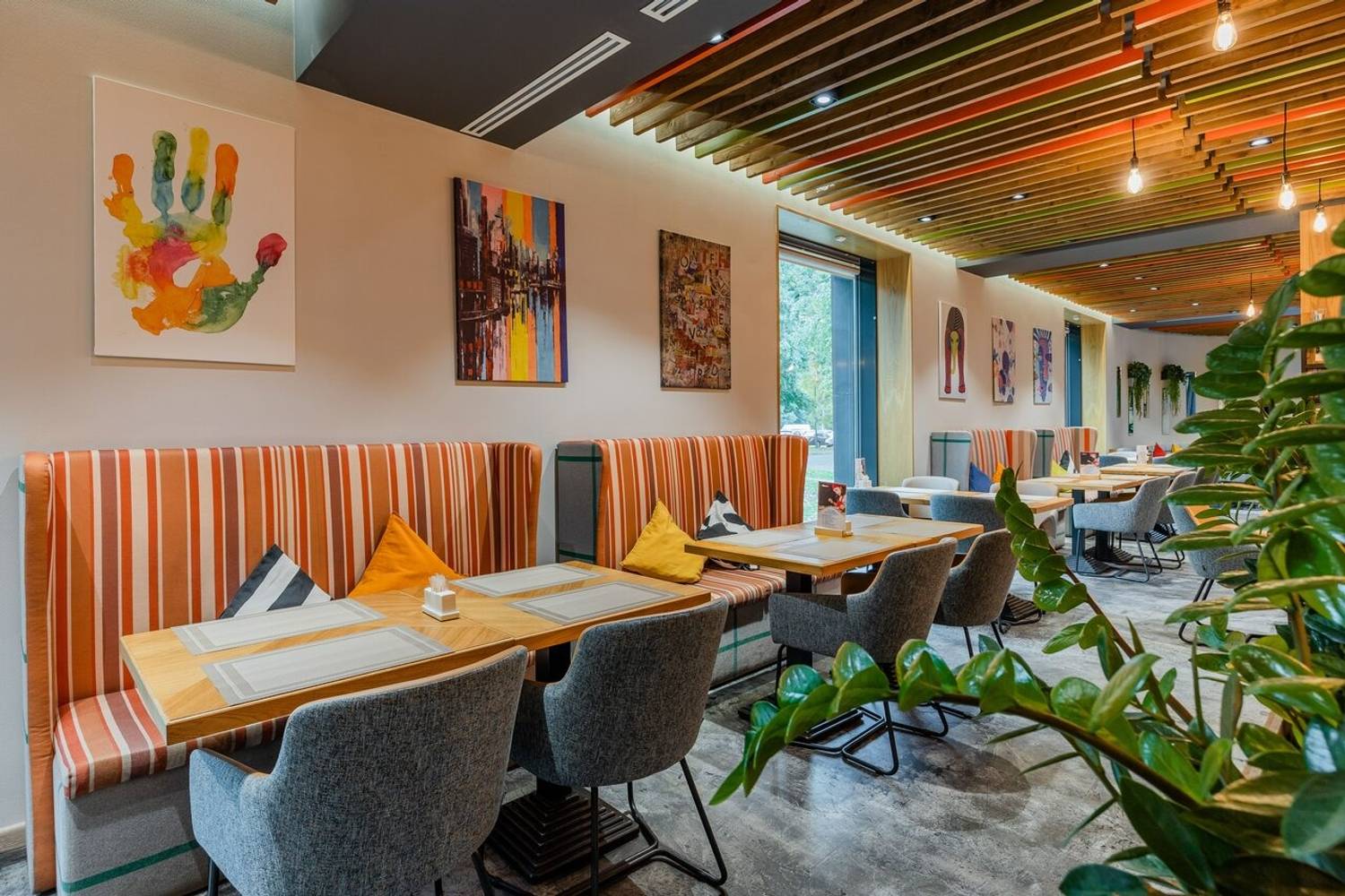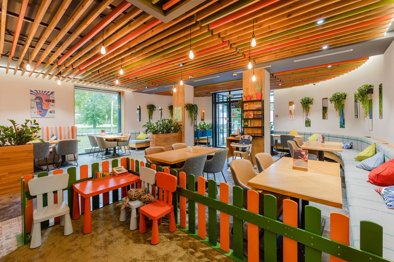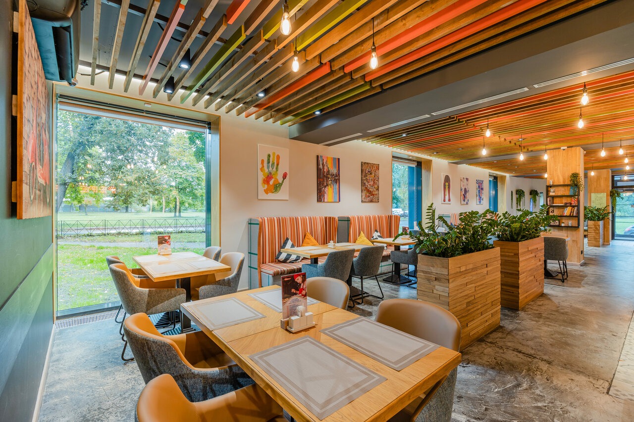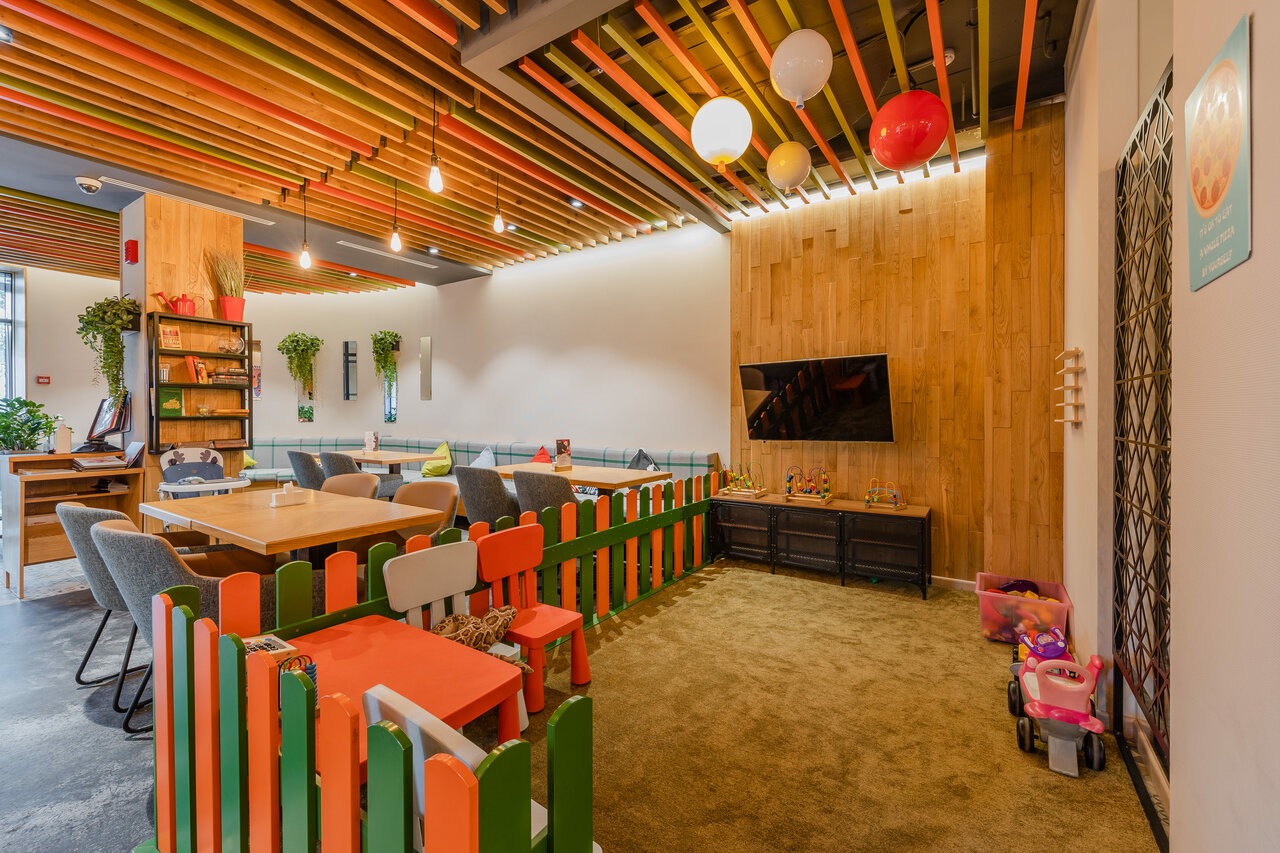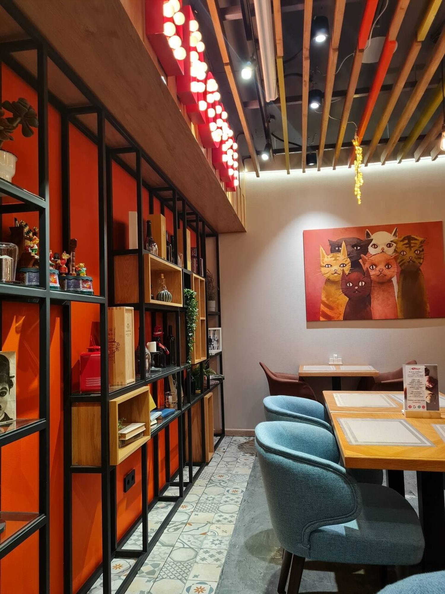 Атмосфера. Яркий и солнечный интерьер в духе итальянской траттории: оранжевые стены и пестрые кресла и создают настроение праздника. Детали вроде ретро-фотографий, картин с кошками и зеркал с подсветкой на кирпичной стене добавляют помещению домашнего тепла.