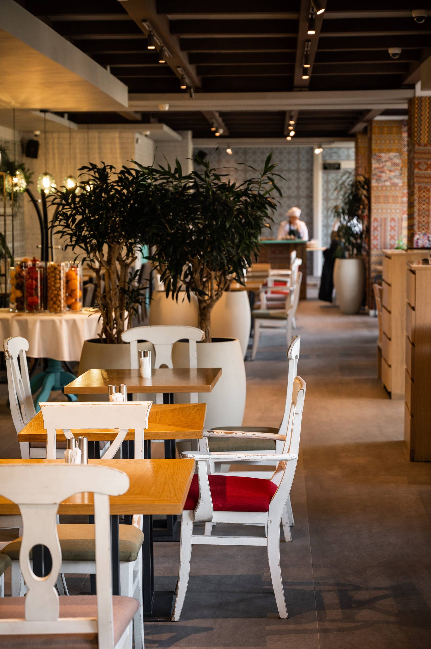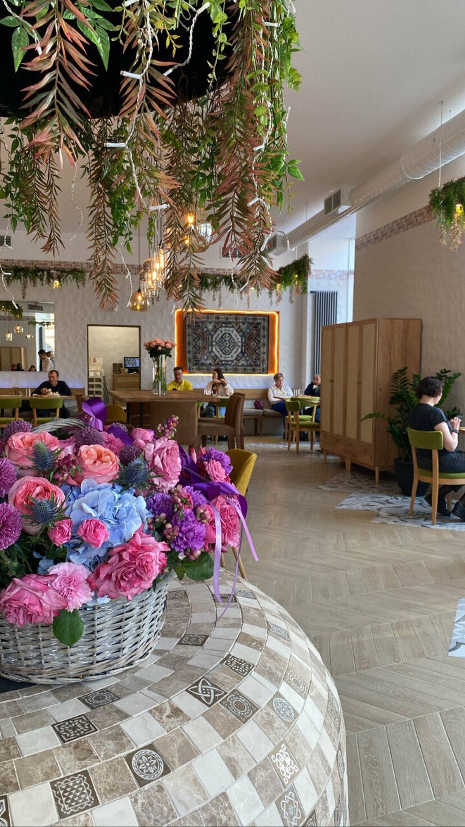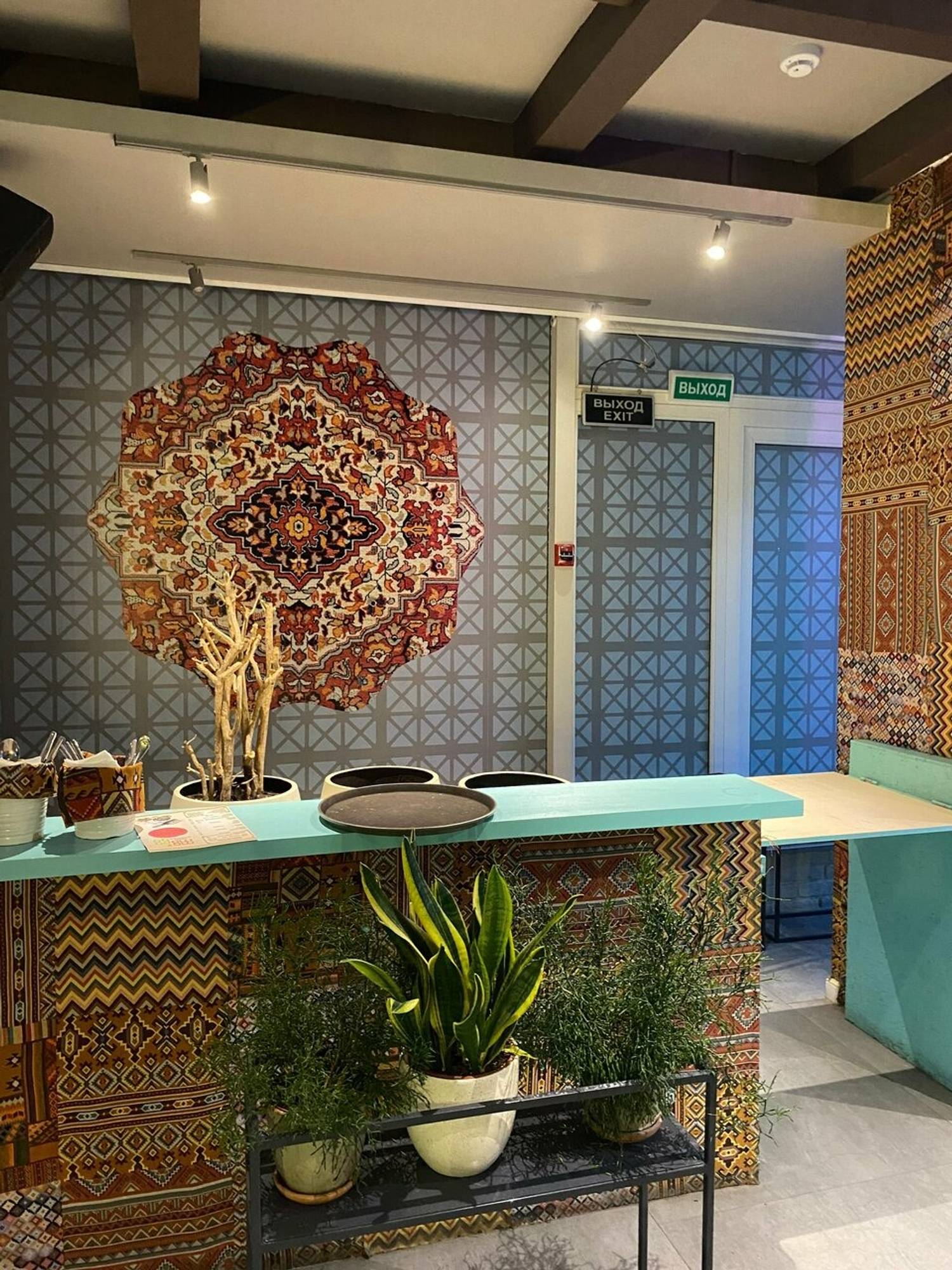 Атмосфера. Находясь внутри, легко забыть, что вы на шумном Московском проспекте. Панорамные окна впускают много света, а обилие зелени создает ощущение летнего сада. Узоры домотканых ковров и теплое свечение ламп добавляют уюта, в воздухе витает аромат выпечки и специй. Все это рождает настроение неспешного вечера, когда можно расслабиться и просто наслаждаться моментом.