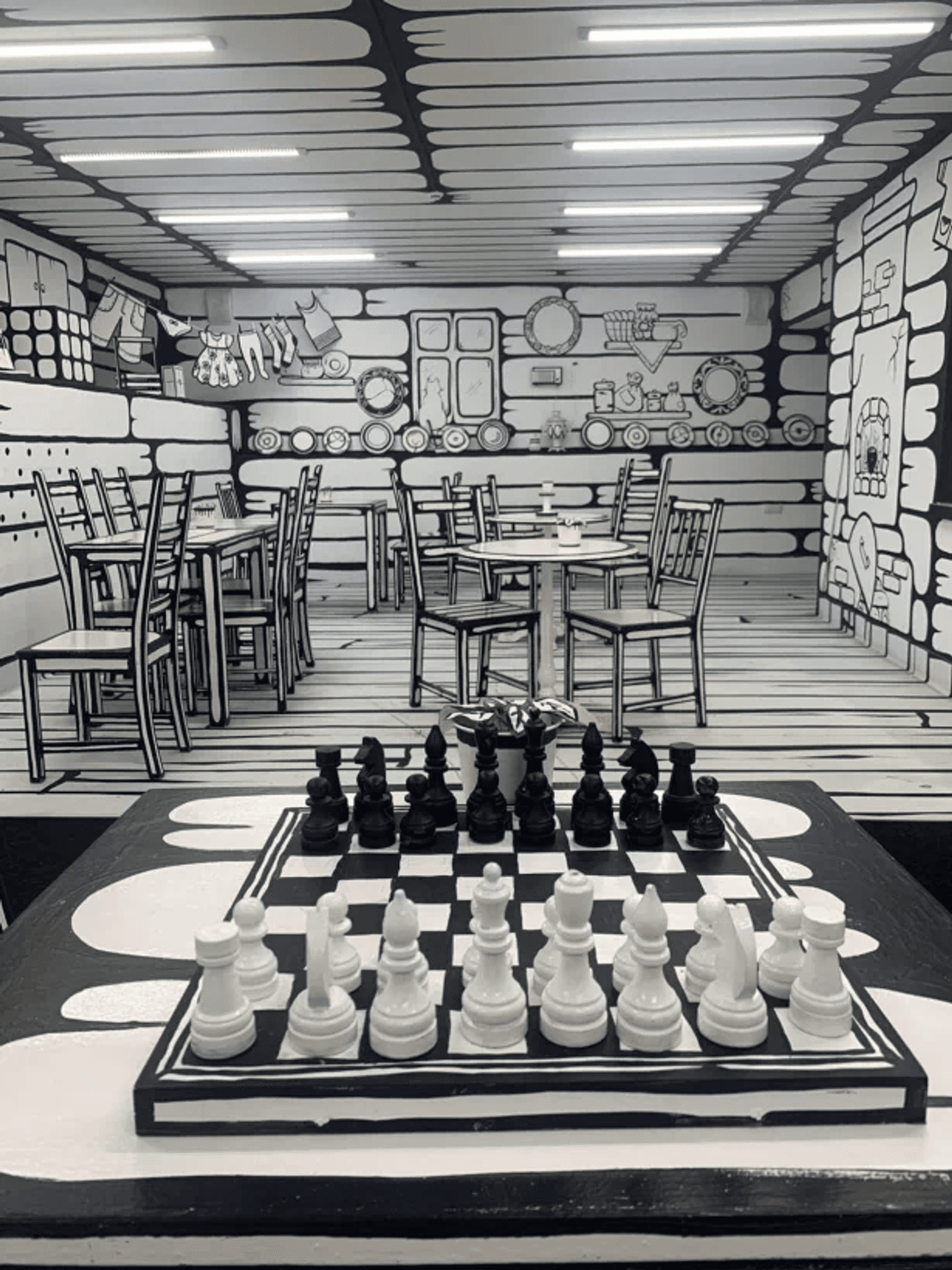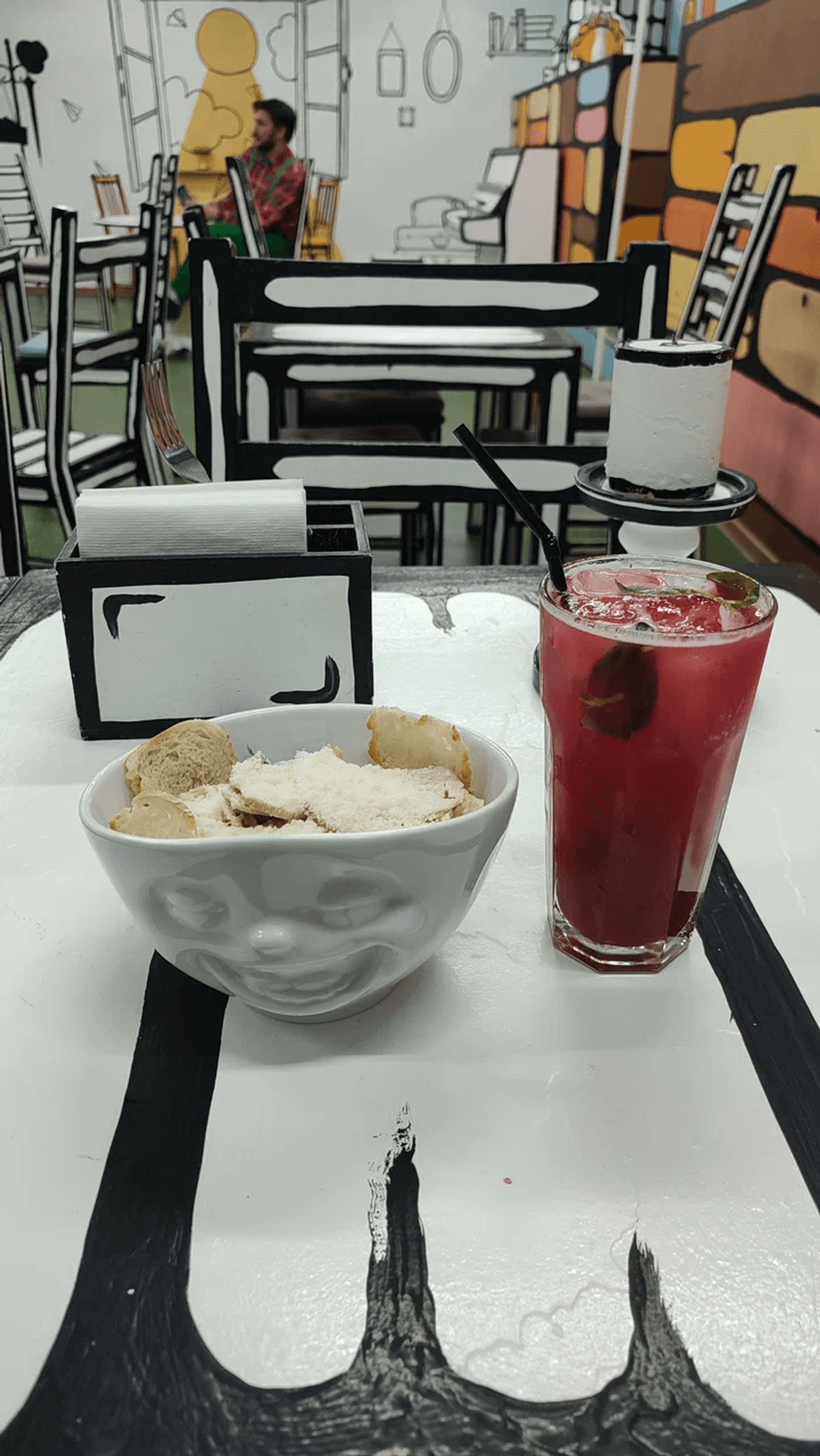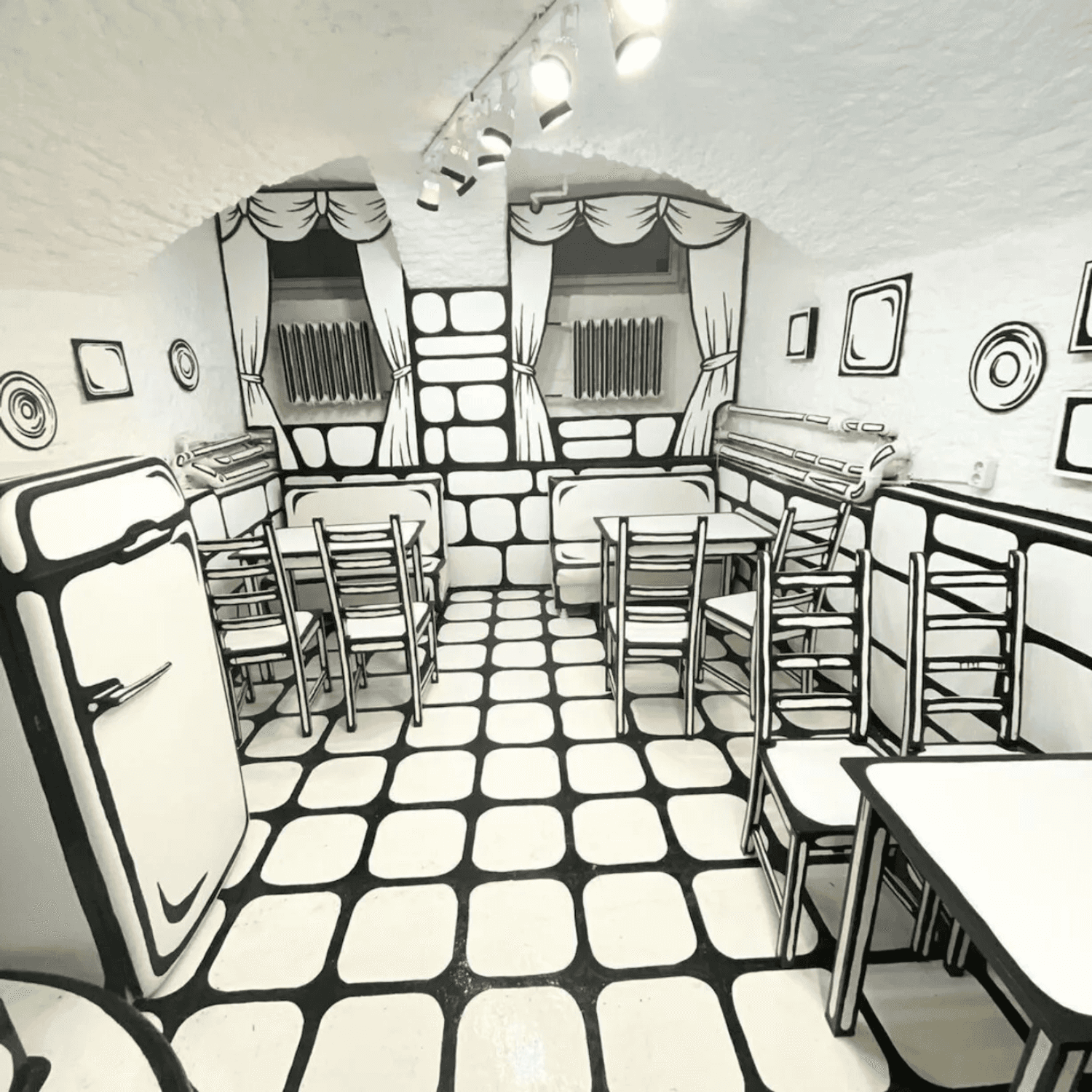 Интерьер здесь будто нарисовал веселый художник. Стены и мебель выкрасили белым, а грани предметов обстановки выделили черным. Идеальный эффект для креативных селфи «я внутри комикса»! Раньше кафе целиком было черно-белым как «ЧБКафе» на Мойке. Теперь один зал «раскрасили» в яркие цвета.