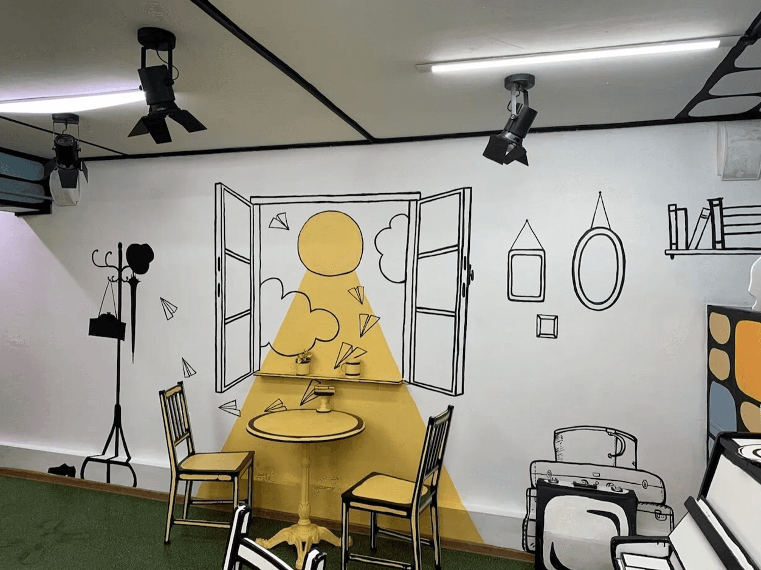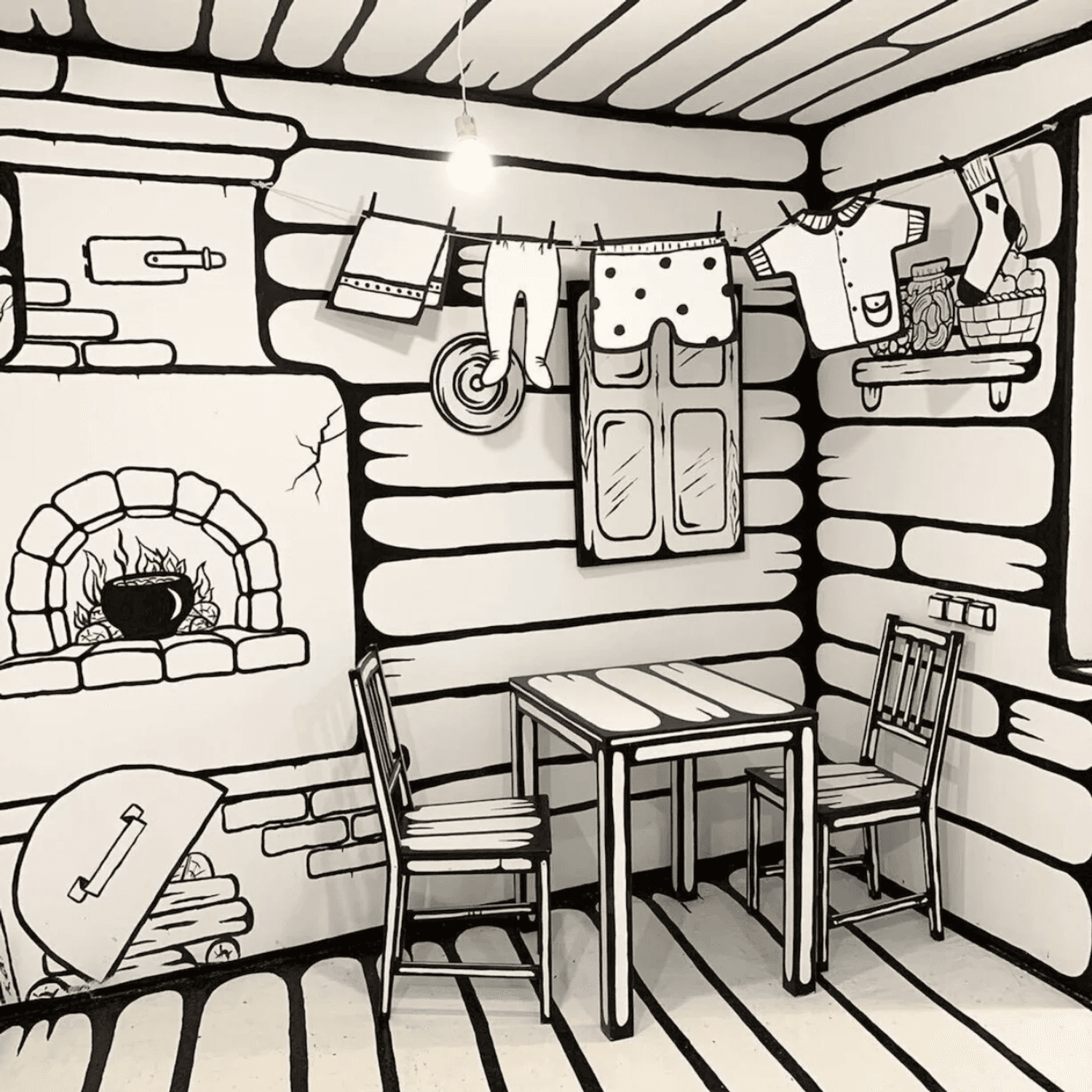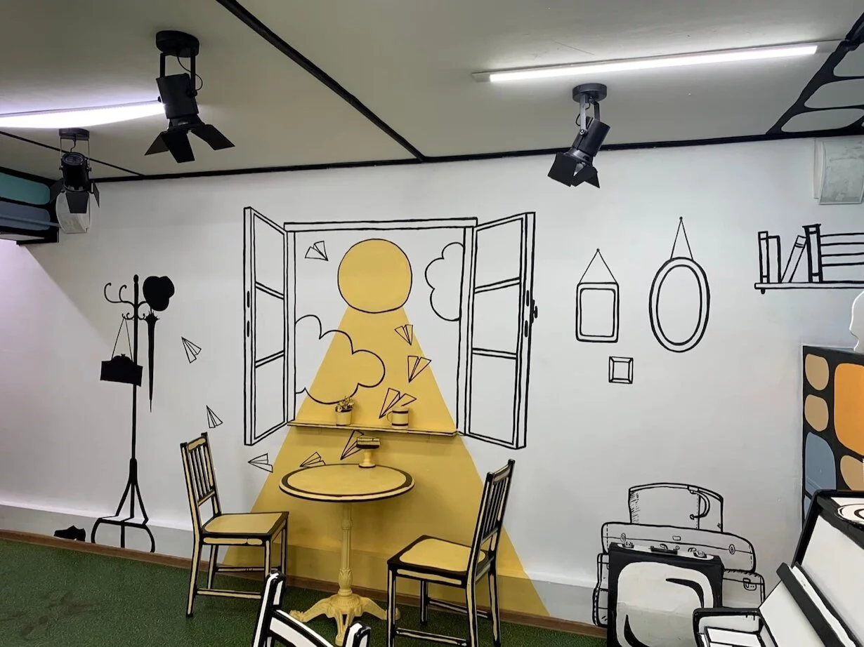 Интерьер здесь будто нарисовал веселый художник. Стены и мебель выкрасили белым, а грани предметов обстановки выделили черным. Идеальный эффект для креативных селфи «я внутри комикса»! Раньше кафе целиком было черно-белым как «ЧБКафе» на Мойке. Теперь один зал «раскрасили» в яркие цвета.