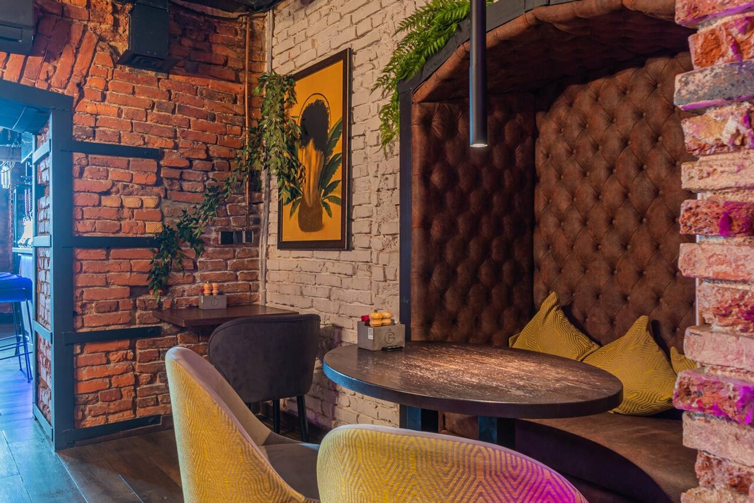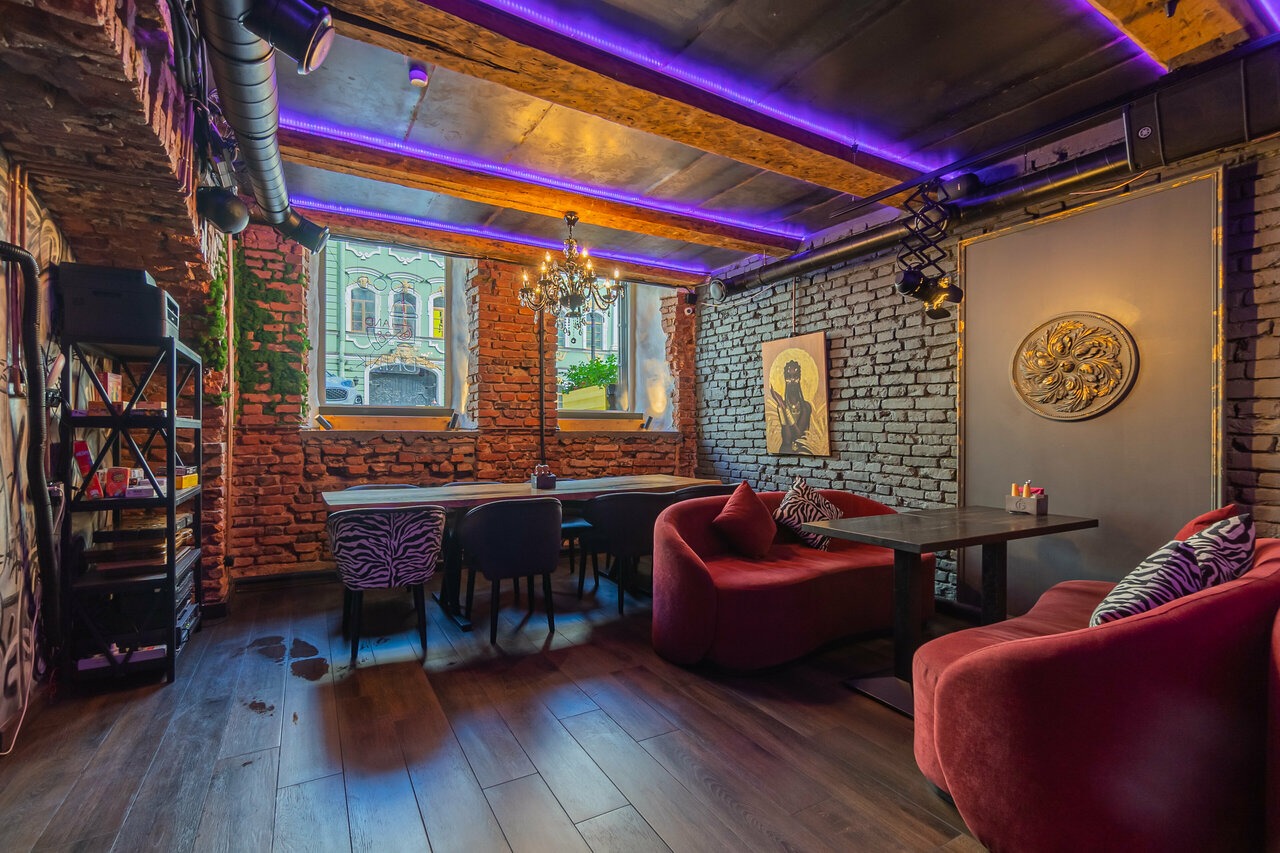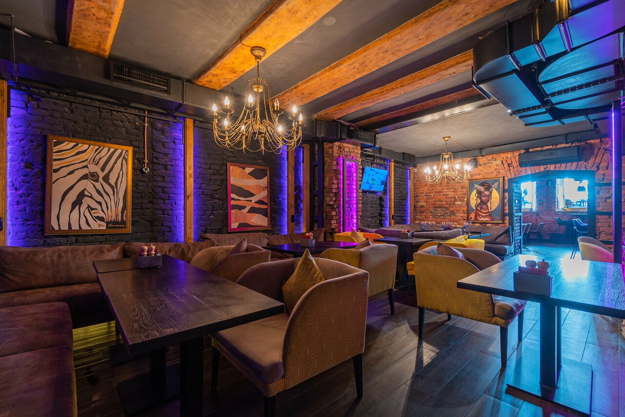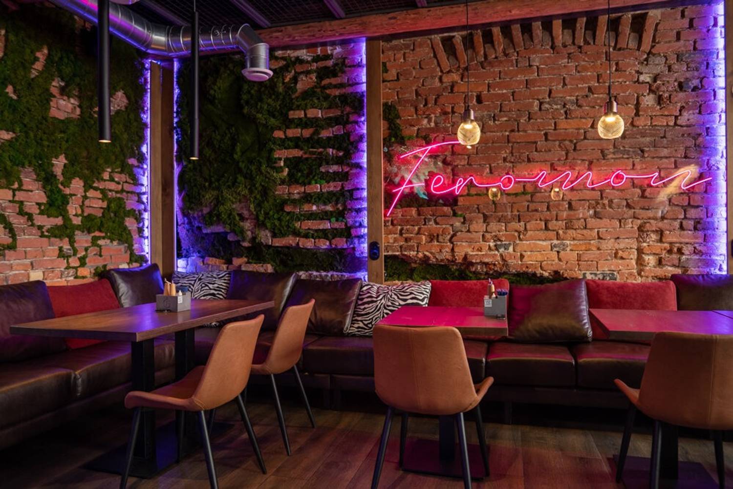 Атмосфера. В этом сетевом заведении 3 зала с кирпичными стенами и лофтовым дизайном: золотые декоративные элементы, граффити, розовые неоновые надписи и синяя барная подсветка создают. Кожаные коричневые и красные мягкие диваны и картины в стиле поп-арт формируют среду для разных сценариев — от уединенных встреч до шумных компаний.
