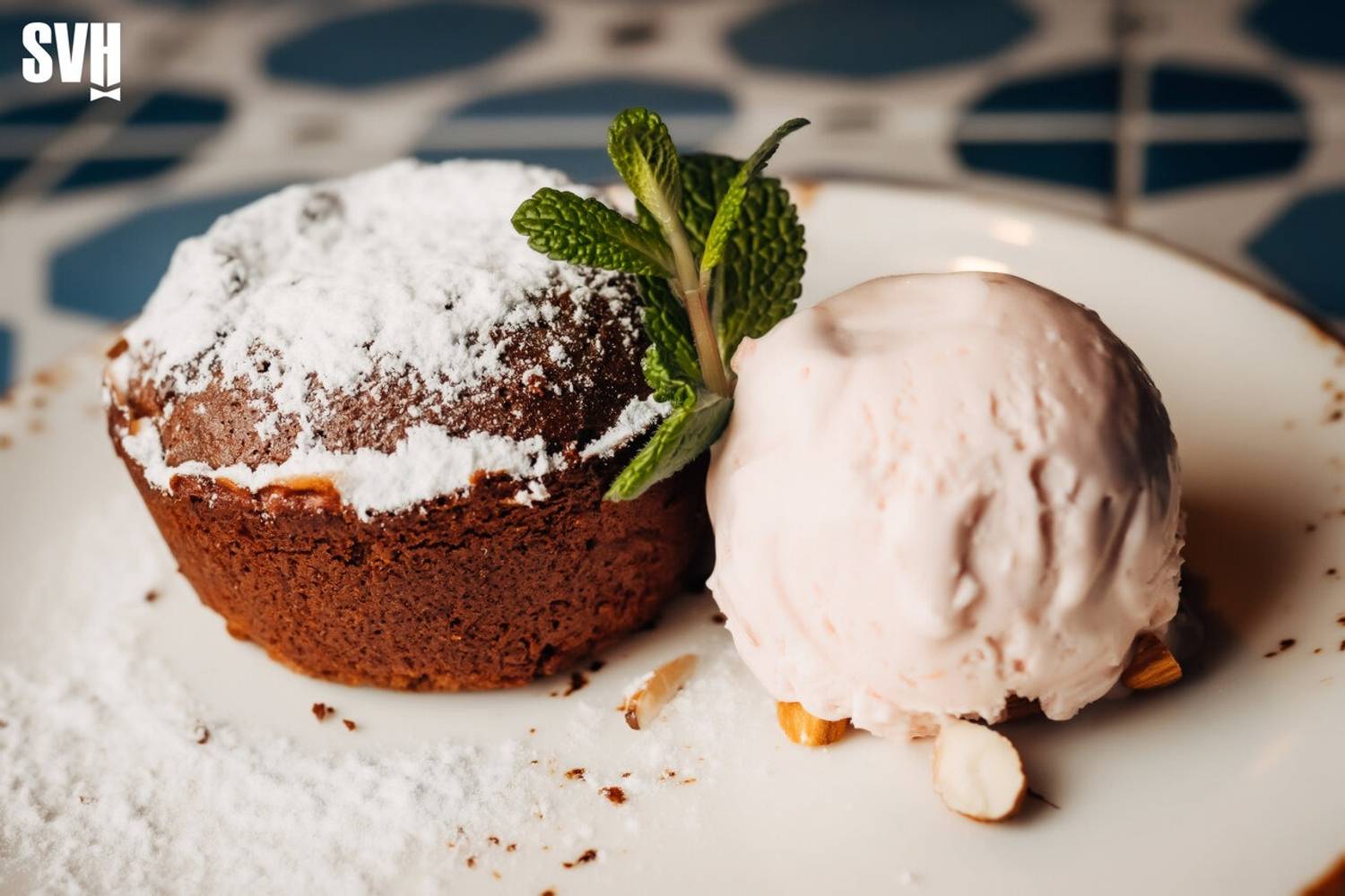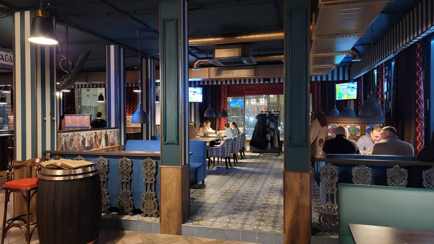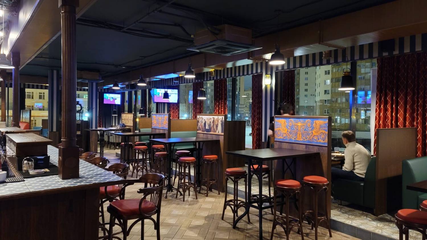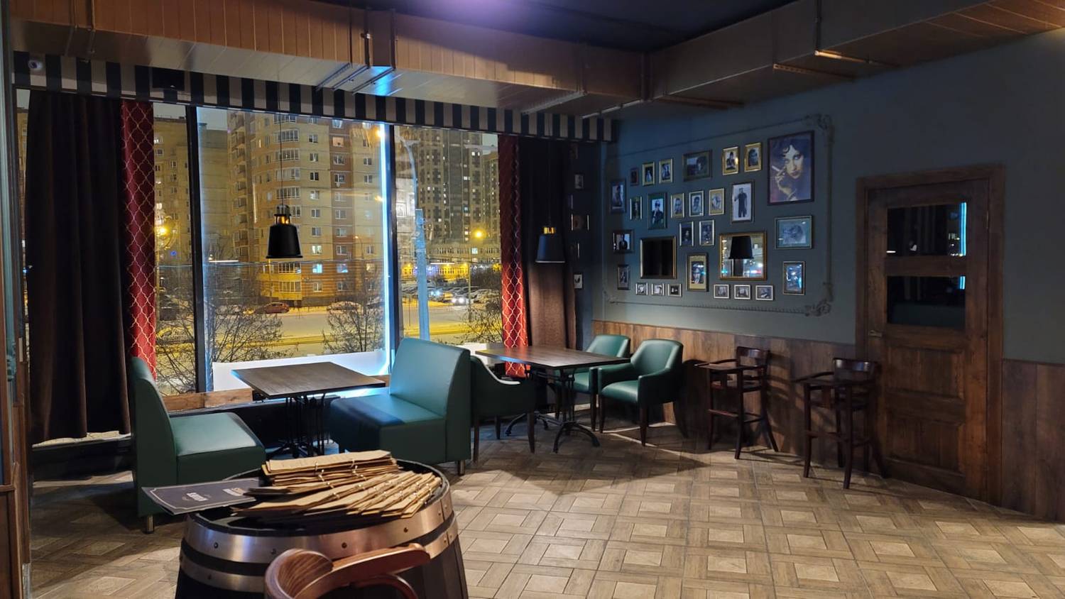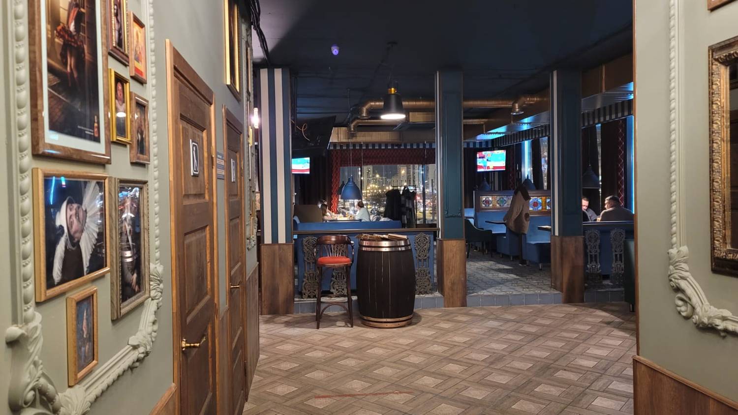 Атмосфера. Стиль в спокойной серо-синей гамме с деревянными акцентами и кожаными креслами: барная зона с высокими столиками разделена колоннами. Черно-белые фотографии и старинные детали добавляют интерьеру винтажный стиль.