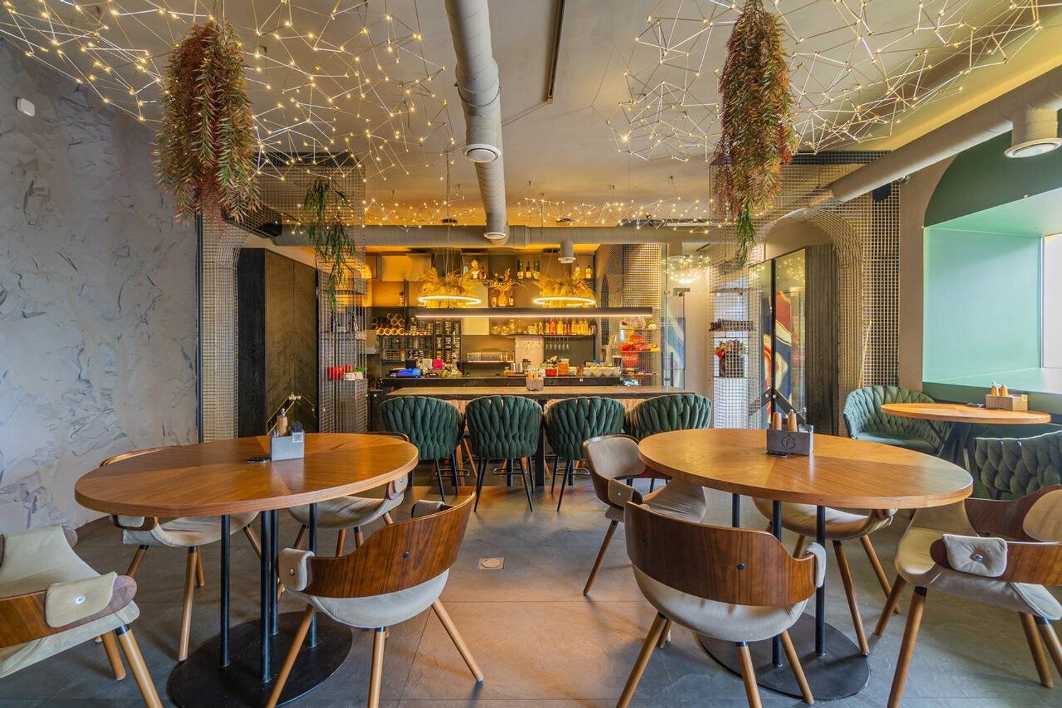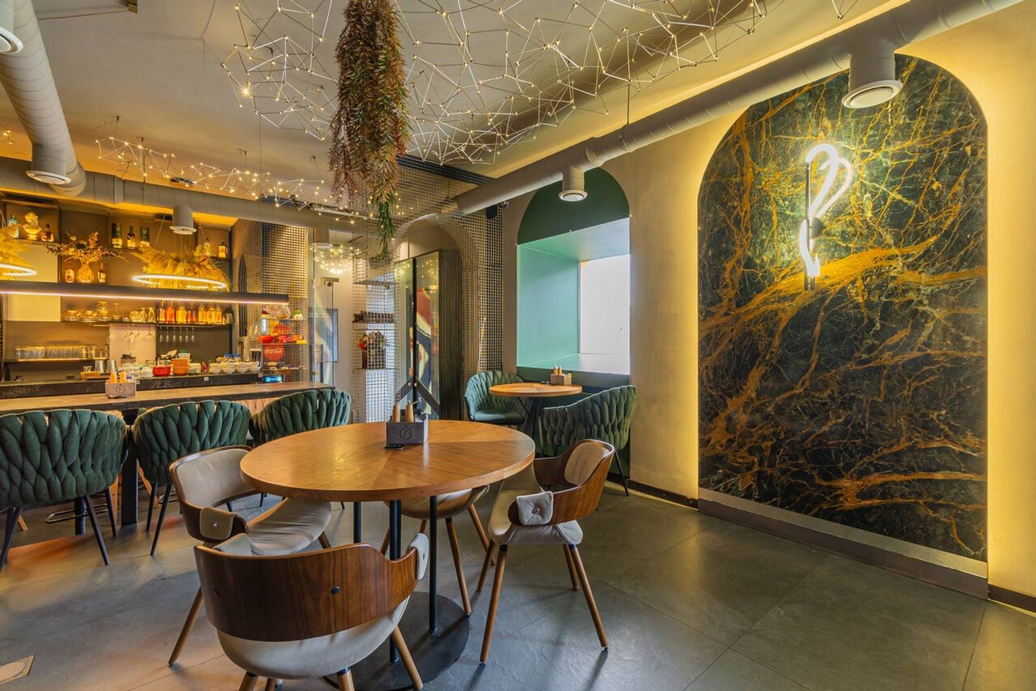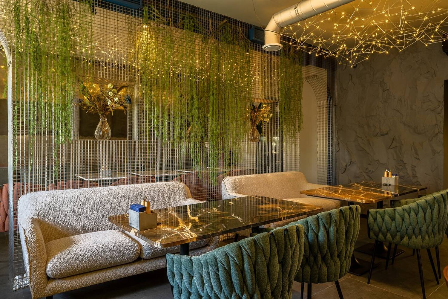 Атмосфера. Премиальный дизайн: мраморная барная стойка, современная мебель и панорамные окна с видом на исторический центр создают атмосферу столичного лаунжа. На потолке оформили золотой декор, похожий на сетку с золотыми огоньками, по металлическим перегородкам спускаются зеленые растения, а внутри перегородок сделали отделения для растений в кадках.