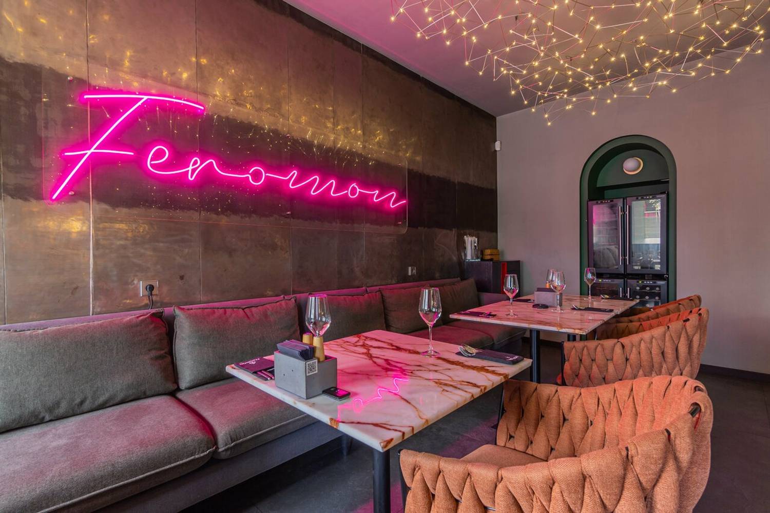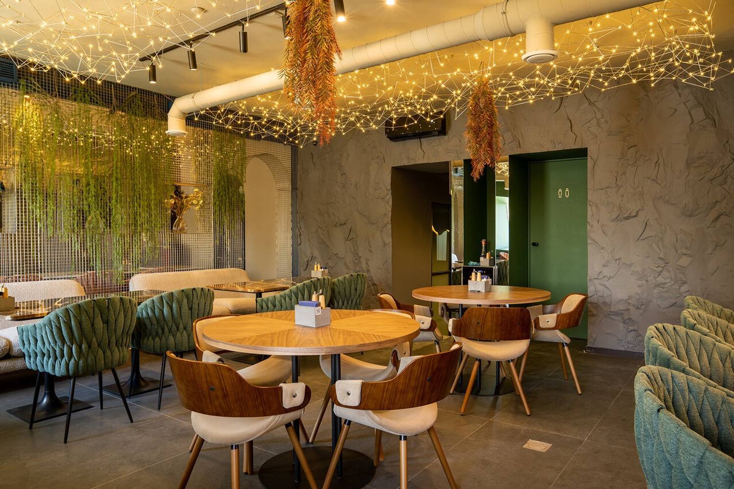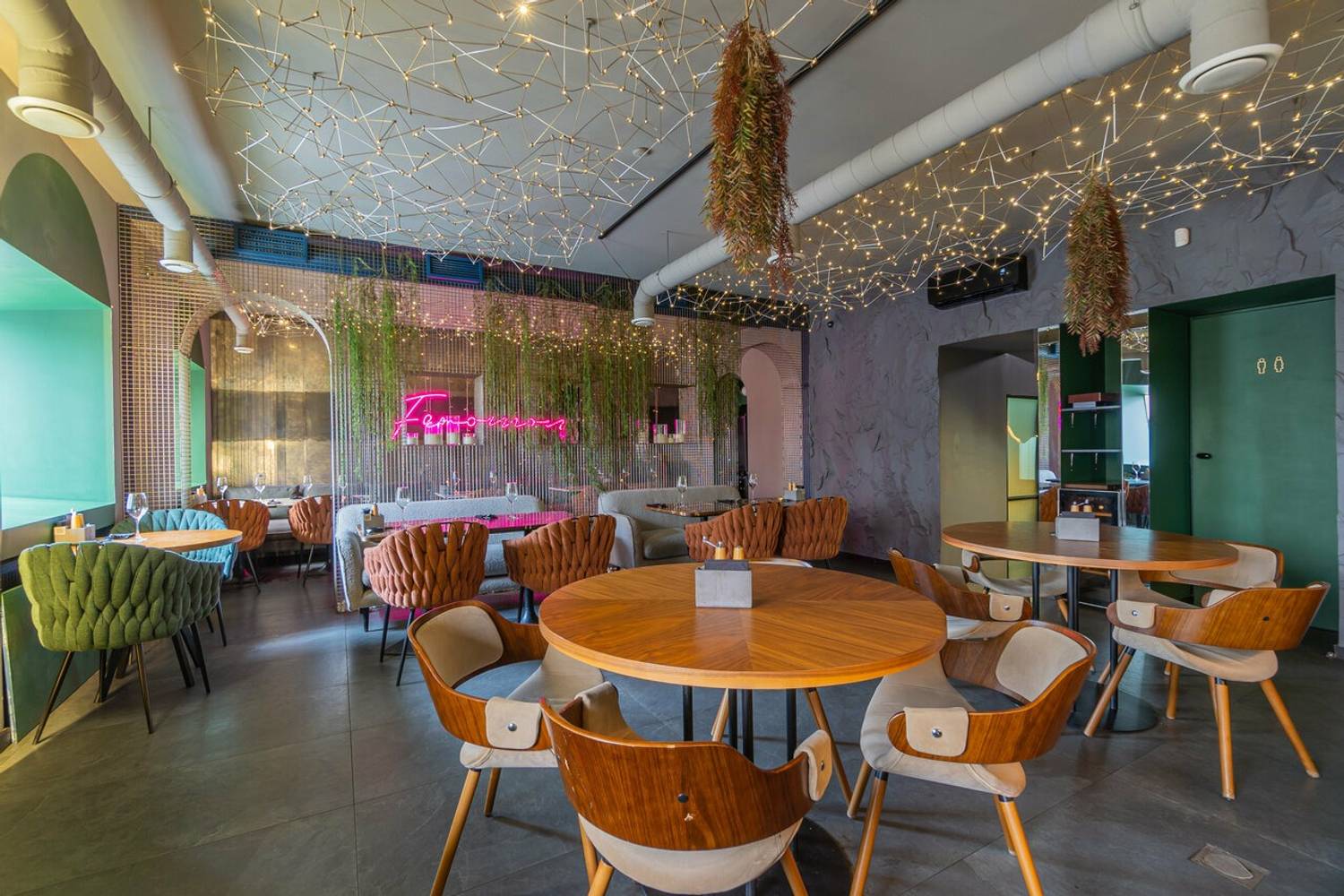 Атмосфера. Премиальный дизайн: мраморная барная стойка, современная мебель и панорамные окна с видом на исторический центр создают атмосферу столичного лаунжа. На потолке оформили золотой декор, похожий на сетку с золотыми огоньками, по металлическим перегородкам спускаются зеленые растения, а внутри перегородок сделали отделения для растений в кадках.