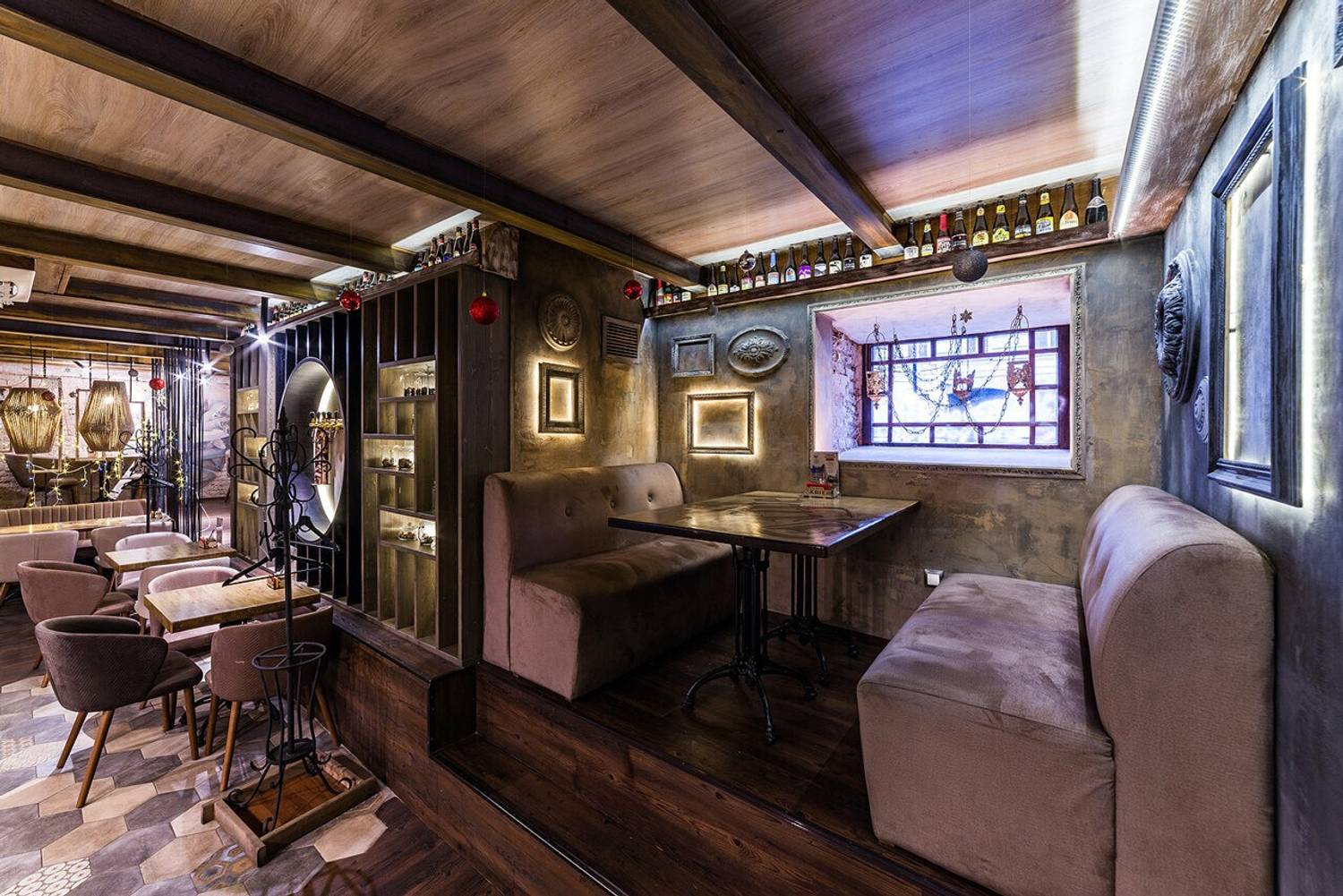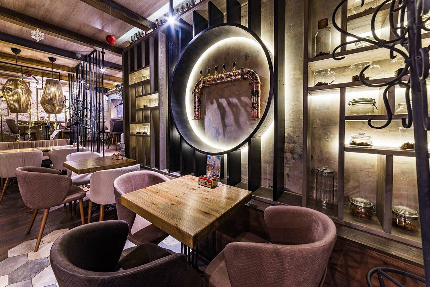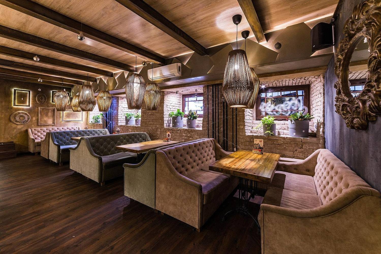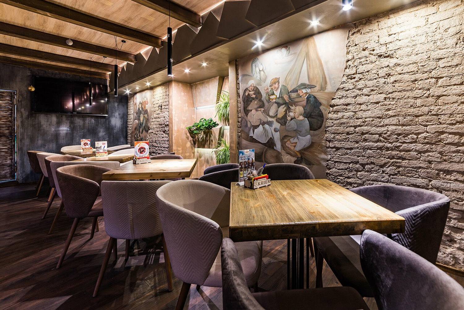 Атмосфера. Индустриальный лофт с традиционными элементами: кирпичная кладка, железные стеллажи, фрески в духе Брейгеля и панно с фламандским городком. Здесь три зала с кожаными диванами и живой зеленью.