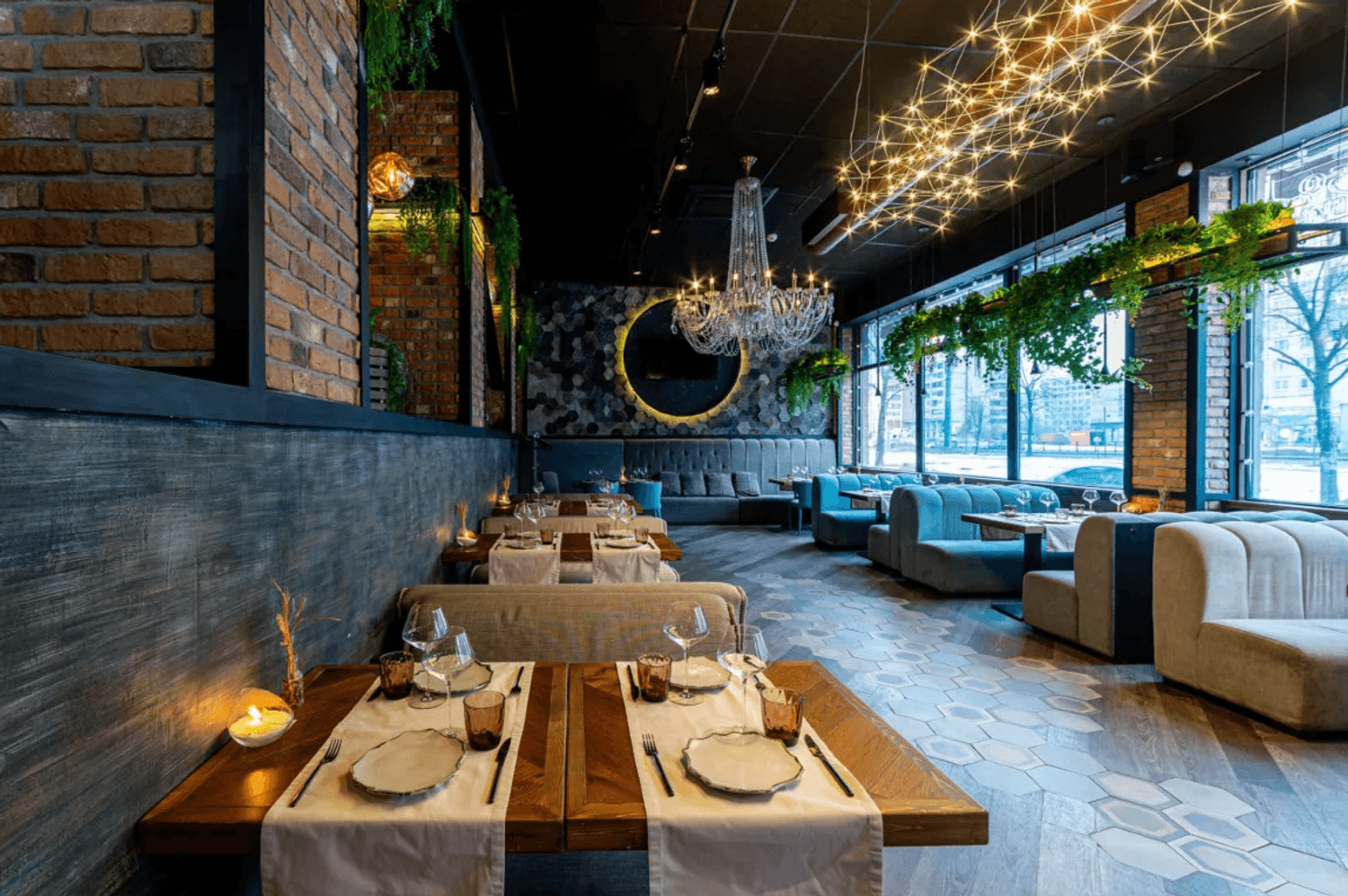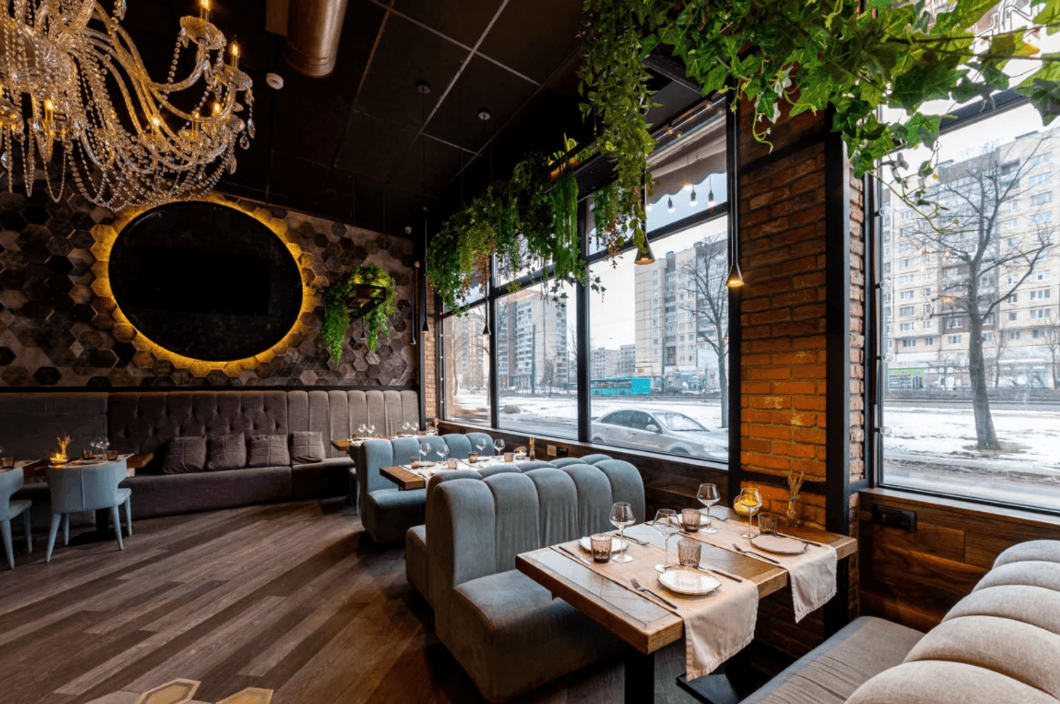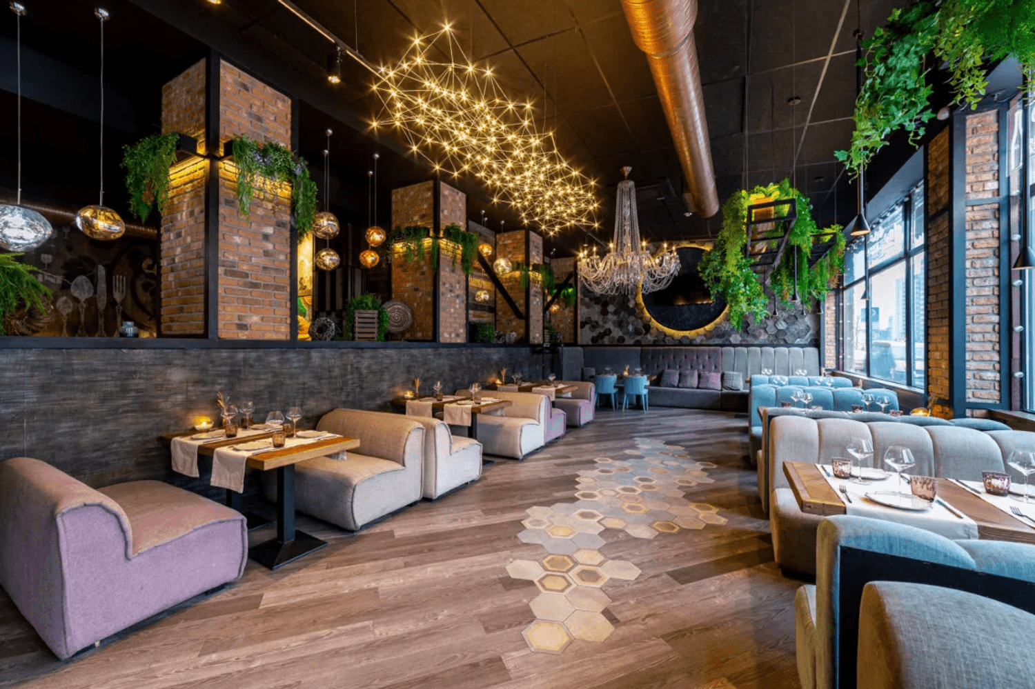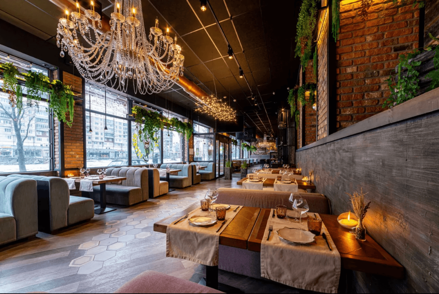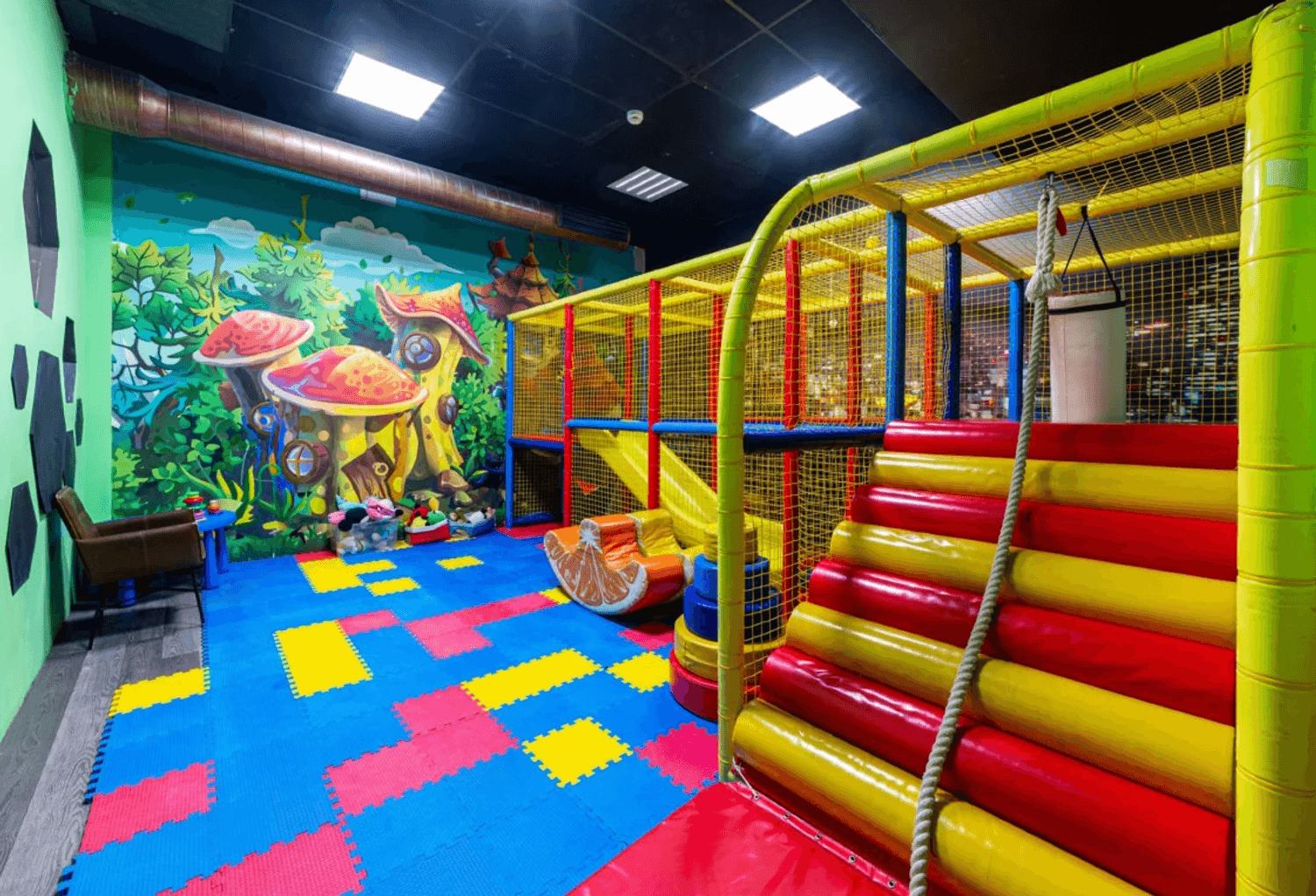 Атмосфера. Зал в стиле лофт с сверкающими сетчатыми люстрами, большими круглыми зеркалами с подсветкой и барной стойкой с декором в виде медных труб. Также есть детская игровая с горкой и игрушками.