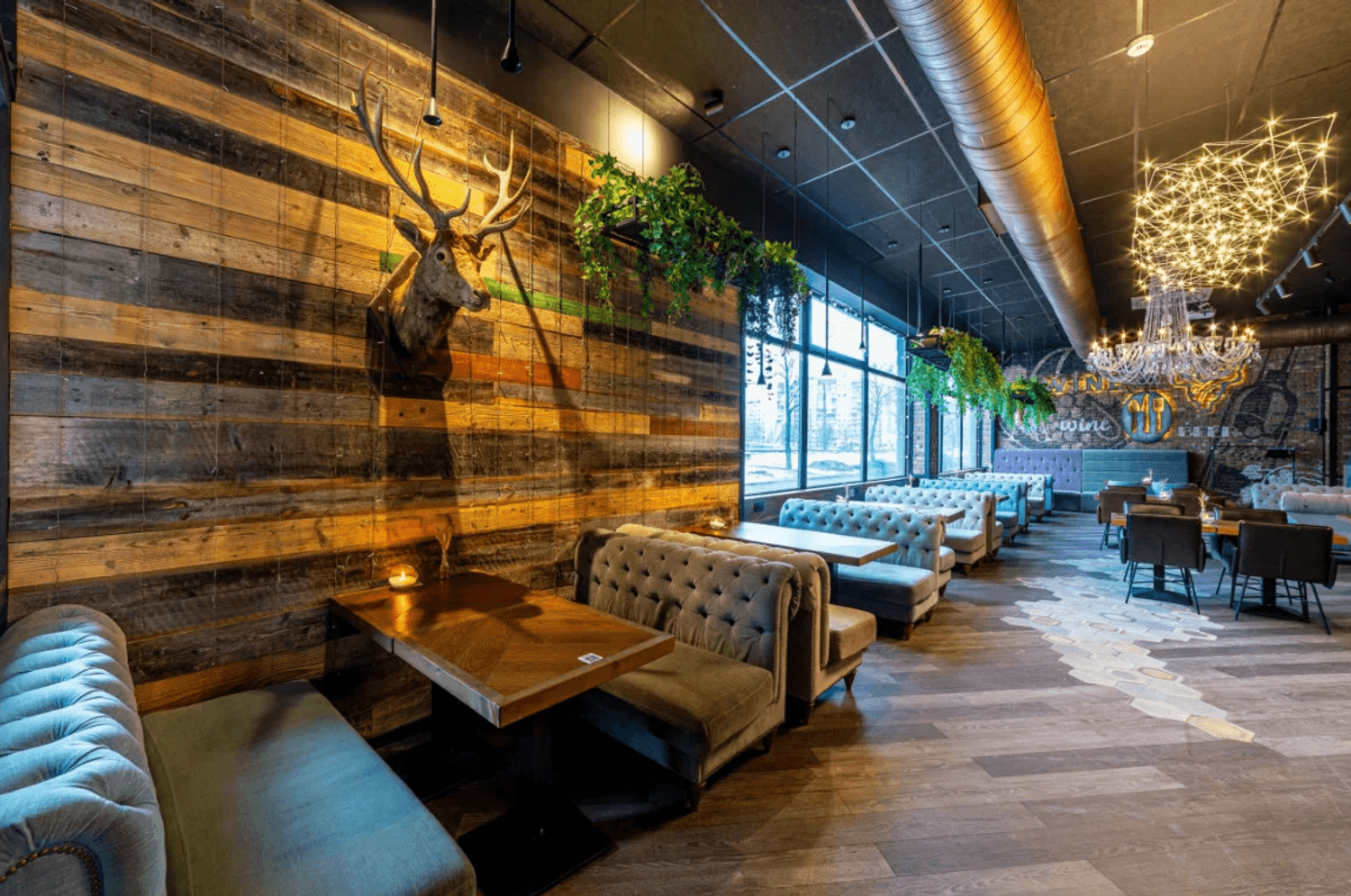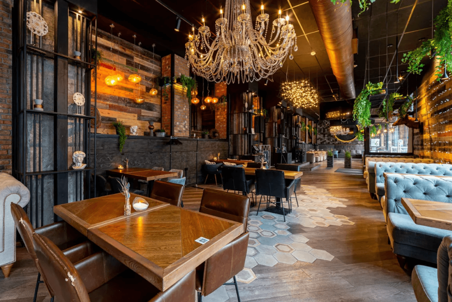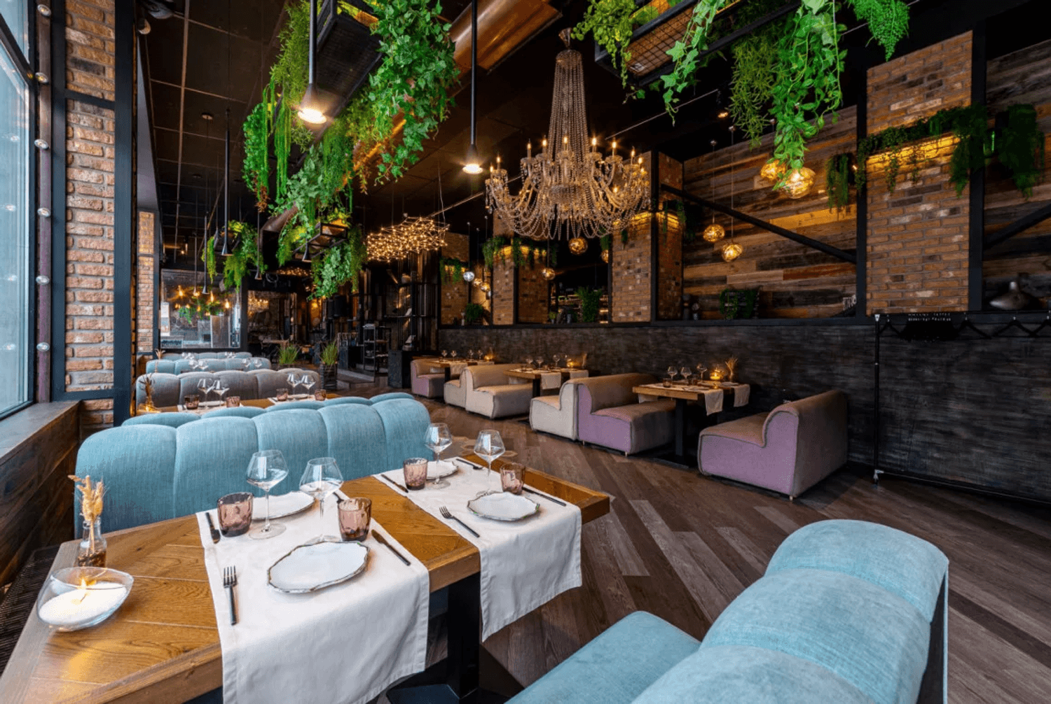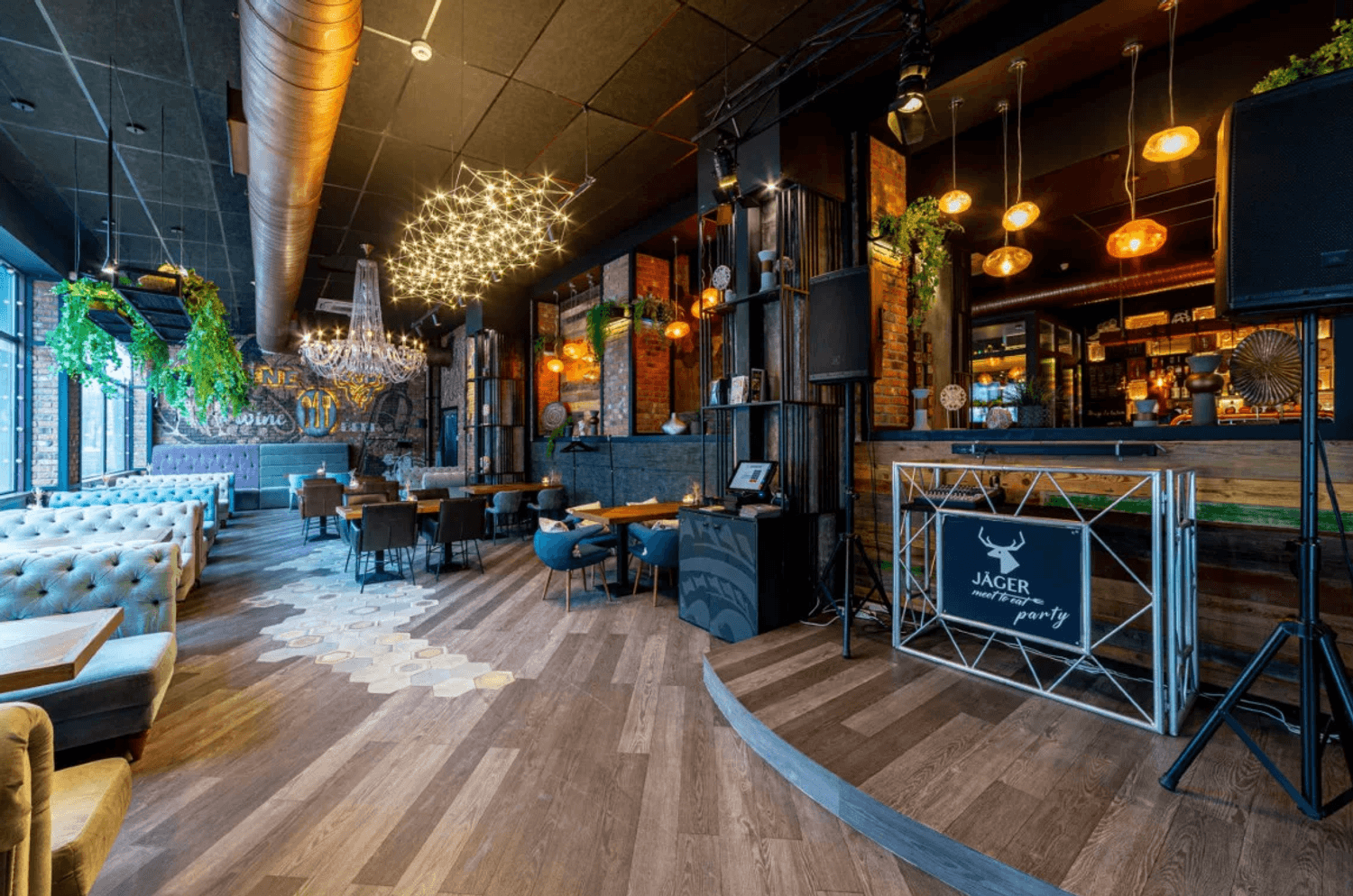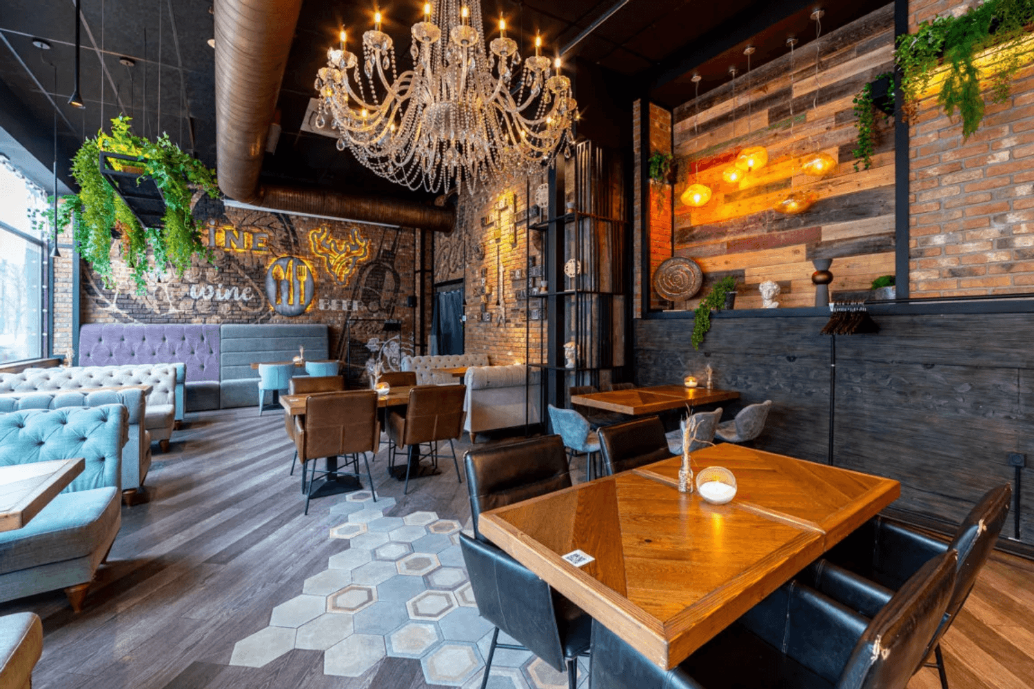 Атмосфера. Зал в стиле лофт с сверкающими сетчатыми люстрами, большими круглыми зеркалами с подсветкой и барной стойкой с декором в виде медных труб. Также есть детская игровая с горкой и игрушками.